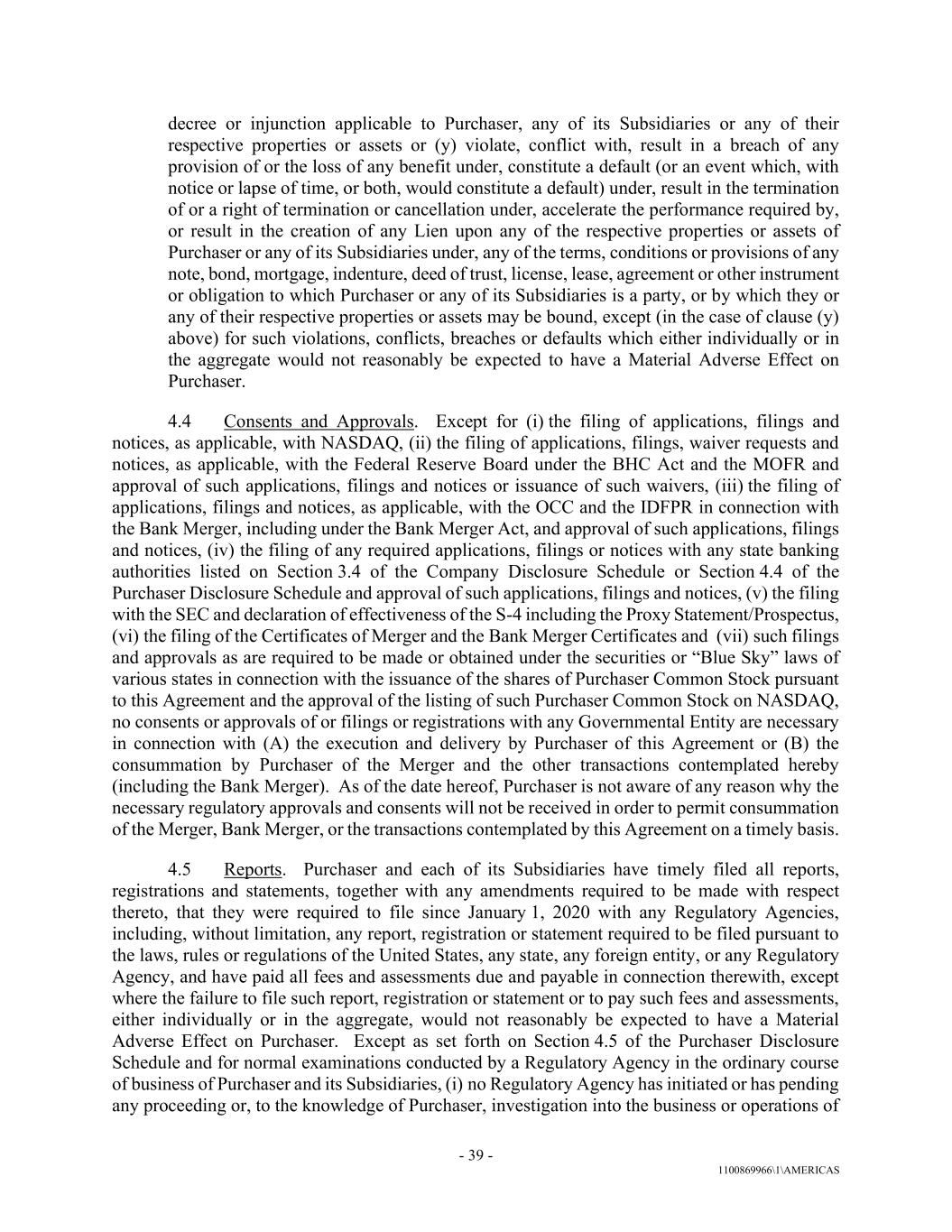 - 39 - 1100869966\1\AMERICAS decree or injunction applicable to Purchaser, any of its Subsidiaries or any of their respective properties or assets or (y) violate, conflict with, result in a breach of any provision of or the loss of any benefit under, constitute a default (or an event which, with notice or lapse of time, or both, would constitute a default) under, result in the termination of or a right of termination or cancellation under, accelerate the performance required by, or result in the creation of any Lien upon any of the respective properties or assets of Purchaser or any of its Subsidiaries under, any of the terms, conditions or provisions of any note, bond, mortgage, indenture, deed of trust, license, lease, agreement or other instrument or obligation to which Purchaser or any of its Subsidiaries is a party, or by which they or any of their respective properties or assets may be bound, except (in the case of clause (y) above) for such violations, conflicts, breaches or defaults which either individually or in the aggregate would not reasonably be expected to have a Material Adverse Effect on Purchaser. 4.4 Consents and Approvals. Except for (i) the filing of applications, filings and notices, as applicable, with NASDAQ, (ii) the filing of applications, filings, waiver requests and notices, as applicable, with the Federal Reserve Board under the BHC Act and the MOFR and approval of such applications, filings and notices or issuance of such waivers, (iii) the filing of applications, filings and notices, as applicable, with the OCC and the IDFPR in connection with the Bank Merger, including under the Bank Merger Act, and approval of such applications, filings and notices, (iv) the filing of any required applications, filings or notices with any state banking authorities listed on Section 3.4 of the Company Disclosure Schedule or Section 4.4 of the Purchaser Disclosure Schedule and approval of such applications, filings and notices, (v) the filing with the SEC and declaration of effectiveness of the S-4 including the Proxy Statement/Prospectus, (vi) the filing of the Certificates of Merger and the Bank Merger Certificates and (vii) such filings and approvals as are required to be made or obtained under the securities or “Blue Sky” laws of various states in connection with the issuance of the shares of Purchaser Common Stock pursuant to this Agreement and the approval of the listing of such Purchaser Common Stock on NASDAQ, no consents or approvals of or filings or registrations with any Governmental Entity are necessary in connection with (A) the execution and delivery by Purchaser of this Agreement or (B) the consummation by Purchaser of the Merger and the other transactions contemplated hereby (including the Bank Merger). As of the date hereof, Purchaser is not aware of any reason why the necessary regulatory approvals and consents will not be received in order to permit consummation of the Merger, Bank Merger, or the transactions contemplated by this Agreement on a timely basis. 4.5 Reports. Purchaser and each of its Subsidiaries have timely filed all reports, registrations and statements, together with any amendments required to be made with respect thereto, that they were required to file since January 1, 2020 with any Regulatory Agencies, including, without limitation, any report, registration or statement required to be filed pursuant to the laws, rules or regulations of the United States, any state, any foreign entity, or any Regulatory Agency, and have paid all fees and assessments due and payable in connection therewith, except where the failure to file such report, registration or statement or to pay such fees and assessments, either individually or in the aggregate, would not reasonably be expected to have a Material Adverse Effect on Purchaser. Except as set forth on Section 4.5 of the Purchaser Disclosure Schedule and for normal examinations conducted by a Regulatory Agency in the ordinary course of business of Purchaser and its Subsidiaries, (i) no Regulatory Agency has initiated or has pending any proceeding or, to the knowledge of Purchaser, investigation into the business or operations of