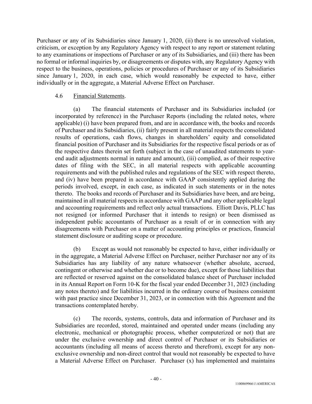 - 40 - 1100869966\1\AMERICAS Purchaser or any of its Subsidiaries since January 1, 2020, (ii) there is no unresolved violation, criticism, or exception by any Regulatory Agency with respect to any report or statement relating to any examinations or inspections of Purchaser or any of its Subsidiaries, and (iii) there has been no formal or informal inquiries by, or disagreements or disputes with, any Regulatory Agency with respect to the business, operations, policies or procedures of Purchaser or any of its Subsidiaries since January 1, 2020, in each case, which would reasonably be expected to have, either individually or in the aggregate, a Material Adverse Effect on Purchaser. 4.6 Financial Statements. (a) The financial statements of Purchaser and its Subsidiaries included (or incorporated by reference) in the Purchaser Reports (including the related notes, where applicable) (i) have been prepared from, and are in accordance with, the books and records of Purchaser and its Subsidiaries, (ii) fairly present in all material respects the consolidated results of operations, cash flows, changes in shareholders’ equity and consolidated financial position of Purchaser and its Subsidiaries for the respective fiscal periods or as of the respective dates therein set forth (subject in the case of unaudited statements to year- end audit adjustments normal in nature and amount), (iii) complied, as of their respective dates of filing with the SEC, in all material respects with applicable accounting requirements and with the published rules and regulations of the SEC with respect thereto, and (iv) have been prepared in accordance with GAAP consistently applied during the periods involved, except, in each case, as indicated in such statements or in the notes thereto. The books and records of Purchaser and its Subsidiaries have been, and are being, maintained in all material respects in accordance with GAAP and any other applicable legal and accounting requirements and reflect only actual transactions. Elliott Davis, PLLC has not resigned (or informed Purchaser that it intends to resign) or been dismissed as independent public accountants of Purchaser as a result of or in connection with any disagreements with Purchaser on a matter of accounting principles or practices, financial statement disclosure or auditing scope or procedure. (b) Except as would not reasonably be expected to have, either individually or in the aggregate, a Material Adverse Effect on Purchaser, neither Purchaser nor any of its Subsidiaries has any liability of any nature whatsoever (whether absolute, accrued, contingent or otherwise and whether due or to become due), except for those liabilities that are reflected or reserved against on the consolidated balance sheet of Purchaser included in its Annual Report on Form 10-K for the fiscal year ended December 31, 2023 (including any notes thereto) and for liabilities incurred in the ordinary course of business consistent with past practice since December 31, 2023, or in connection with this Agreement and the transactions contemplated hereby. (c) The records, systems, controls, data and information of Purchaser and its Subsidiaries are recorded, stored, maintained and operated under means (including any electronic, mechanical or photographic process, whether computerized or not) that are under the exclusive ownership and direct control of Purchaser or its Subsidiaries or accountants (including all means of access thereto and therefrom), except for any non- exclusive ownership and non-direct control that would not reasonably be expected to have a Material Adverse Effect on Purchaser. Purchaser (x) has implemented and maintains