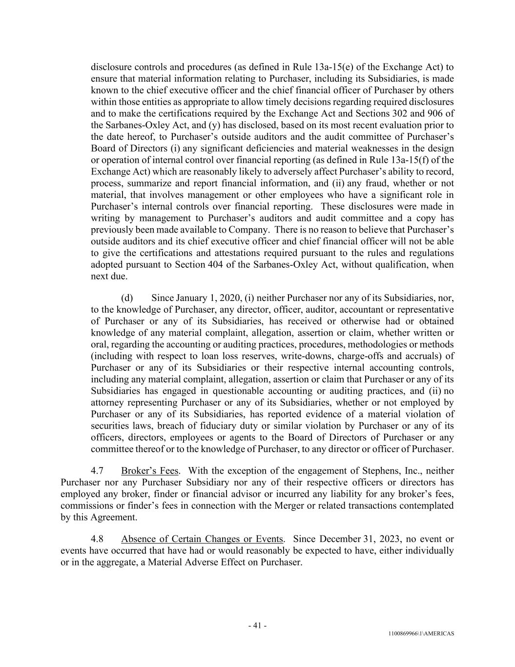 - 41 - 1100869966\1\AMERICAS disclosure controls and procedures (as defined in Rule 13a-15(e) of the Exchange Act) to ensure that material information relating to Purchaser, including its Subsidiaries, is made known to the chief executive officer and the chief financial officer of Purchaser by others within those entities as appropriate to allow timely decisions regarding required disclosures and to make the certifications required by the Exchange Act and Sections 302 and 906 of the Sarbanes-Oxley Act, and (y) has disclosed, based on its most recent evaluation prior to the date hereof, to Purchaser’s outside auditors and the audit committee of Purchaser’s Board of Directors (i) any significant deficiencies and material weaknesses in the design or operation of internal control over financial reporting (as defined in Rule 13a-15(f) of the Exchange Act) which are reasonably likely to adversely affect Purchaser’s ability to record, process, summarize and report financial information, and (ii) any fraud, whether or not material, that involves management or other employees who have a significant role in Purchaser’s internal controls over financial reporting. These disclosures were made in writing by management to Purchaser’s auditors and audit committee and a copy has previously been made available to Company. There is no reason to believe that Purchaser’s outside auditors and its chief executive officer and chief financial officer will not be able to give the certifications and attestations required pursuant to the rules and regulations adopted pursuant to Section 404 of the Sarbanes-Oxley Act, without qualification, when next due. (d) Since January 1, 2020, (i) neither Purchaser nor any of its Subsidiaries, nor, to the knowledge of Purchaser, any director, officer, auditor, accountant or representative of Purchaser or any of its Subsidiaries, has received or otherwise had or obtained knowledge of any material complaint, allegation, assertion or claim, whether written or oral, regarding the accounting or auditing practices, procedures, methodologies or methods (including with respect to loan loss reserves, write-downs, charge-offs and accruals) of Purchaser or any of its Subsidiaries or their respective internal accounting controls, including any material complaint, allegation, assertion or claim that Purchaser or any of its Subsidiaries has engaged in questionable accounting or auditing practices, and (ii) no attorney representing Purchaser or any of its Subsidiaries, whether or not employed by Purchaser or any of its Subsidiaries, has reported evidence of a material violation of securities laws, breach of fiduciary duty or similar violation by Purchaser or any of its officers, directors, employees or agents to the Board of Directors of Purchaser or any committee thereof or to the knowledge of Purchaser, to any director or officer of Purchaser. 4.7 Broker’s Fees. With the exception of the engagement of Stephens, Inc., neither Purchaser nor any Purchaser Subsidiary nor any of their respective officers or directors has employed any broker, finder or financial advisor or incurred any liability for any broker’s fees, commissions or finder’s fees in connection with the Merger or related transactions contemplated by this Agreement. 4.8 Absence of Certain Changes or Events. Since December 31, 2023, no event or events have occurred that have had or would reasonably be expected to have, either individually or in the aggregate, a Material Adverse Effect on Purchaser.