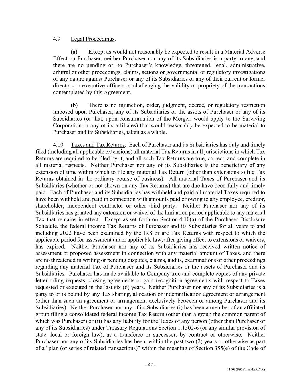 - 42 - 1100869966\1\AMERICAS 4.9 Legal Proceedings. (a) Except as would not reasonably be expected to result in a Material Adverse Effect on Purchaser, neither Purchaser nor any of its Subsidiaries is a party to any, and there are no pending or, to Purchaser’s knowledge, threatened, legal, administrative, arbitral or other proceedings, claims, actions or governmental or regulatory investigations of any nature against Purchaser or any of its Subsidiaries or any of their current or former directors or executive officers or challenging the validity or propriety of the transactions contemplated by this Agreement. (b) There is no injunction, order, judgment, decree, or regulatory restriction imposed upon Purchaser, any of its Subsidiaries or the assets of Purchaser or any of its Subsidiaries (or that, upon consummation of the Merger, would apply to the Surviving Corporation or any of its affiliates) that would reasonably be expected to be material to Purchaser and its Subsidiaries, taken as a whole. 4.10 Taxes and Tax Returns. Each of Purchaser and its Subsidiaries has duly and timely filed (including all applicable extensions) all material Tax Returns in all jurisdictions in which Tax Returns are required to be filed by it, and all such Tax Returns are true, correct, and complete in all material respects. Neither Purchaser nor any of its Subsidiaries is the beneficiary of any extension of time within which to file any material Tax Return (other than extensions to file Tax Returns obtained in the ordinary course of business). All material Taxes of Purchaser and its Subsidiaries (whether or not shown on any Tax Returns) that are due have been fully and timely paid. Each of Purchaser and its Subsidiaries has withheld and paid all material Taxes required to have been withheld and paid in connection with amounts paid or owing to any employee, creditor, shareholder, independent contractor or other third party. Neither Purchaser nor any of its Subsidiaries has granted any extension or waiver of the limitation period applicable to any material Tax that remains in effect. Except as set forth on Section 4.10(a) of the Purchaser Disclosure Schedule, the federal income Tax Returns of Purchaser and its Subsidiaries for all years to and including 2022 have been examined by the IRS or are Tax Returns with respect to which the applicable period for assessment under applicable law, after giving effect to extensions or waivers, has expired. Neither Purchaser nor any of its Subsidiaries has received written notice of assessment or proposed assessment in connection with any material amount of Taxes, and there are no threatened in writing or pending disputes, claims, audits, examinations or other proceedings regarding any material Tax of Purchaser and its Subsidiaries or the assets of Purchaser and its Subsidiaries. Purchaser has made available to Company true and complete copies of any private letter ruling requests, closing agreements or gain recognition agreements with respect to Taxes requested or executed in the last six (6) years. Neither Purchaser nor any of its Subsidiaries is a party to or is bound by any Tax sharing, allocation or indemnification agreement or arrangement (other than such an agreement or arrangement exclusively between or among Purchaser and its Subsidiaries). Neither Purchaser nor any of its Subsidiaries (i) has been a member of an affiliated group filing a consolidated federal income Tax Return (other than a group the common parent of which was Purchaser) or (ii) has any liability for the Taxes of any person (other than Purchaser or any of its Subsidiaries) under Treasury Regulations Section 1.1502-6 (or any similar provision of state, local or foreign law), as a transferee or successor, by contract or otherwise. Neither Purchaser nor any of its Subsidiaries has been, within the past two (2) years or otherwise as part of a “plan (or series of related transactions)” within the meaning of Section 355(e) of the Code of