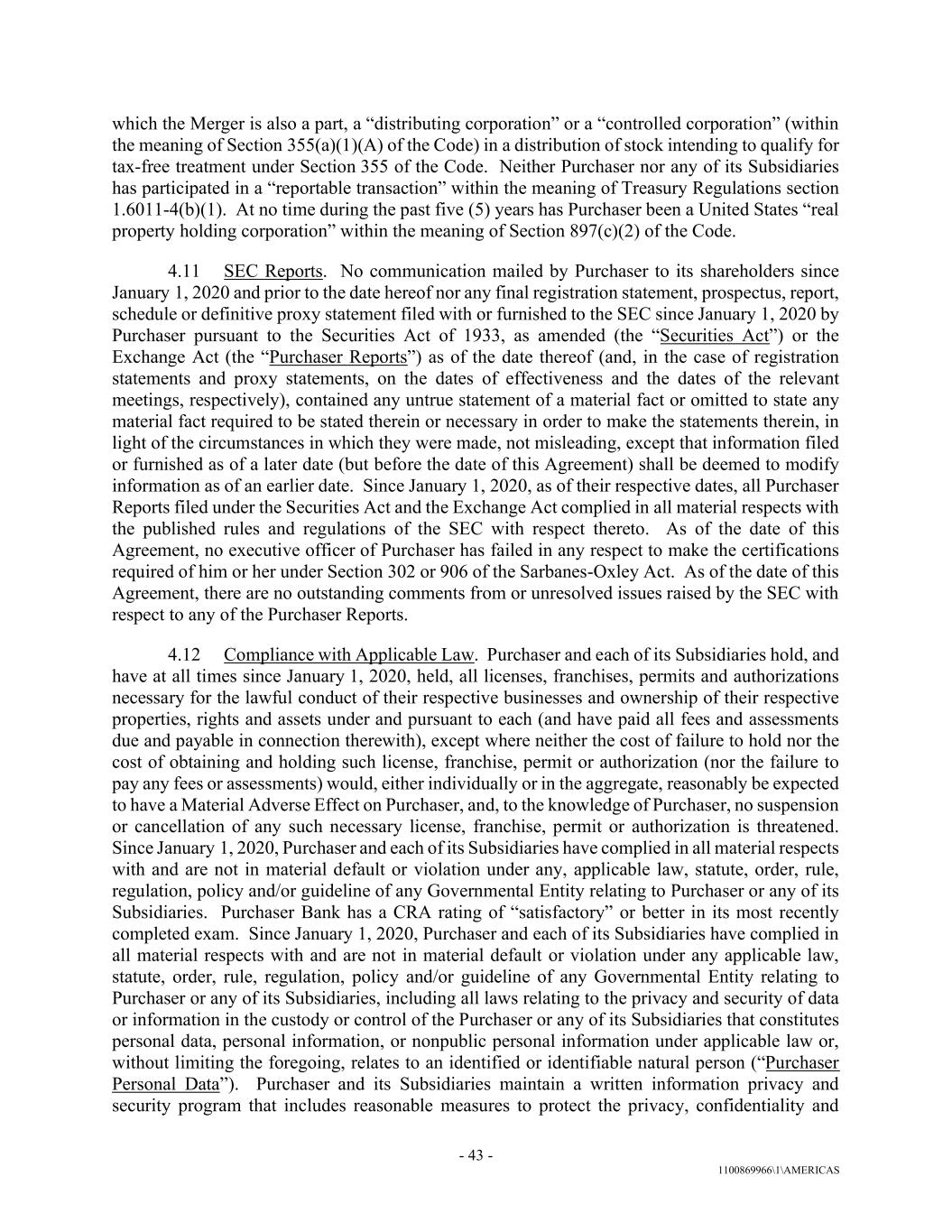 - 43 - 1100869966\1\AMERICAS which the Merger is also a part, a “distributing corporation” or a “controlled corporation” (within the meaning of Section 355(a)(1)(A) of the Code) in a distribution of stock intending to qualify for tax-free treatment under Section 355 of the Code. Neither Purchaser nor any of its Subsidiaries has participated in a “reportable transaction” within the meaning of Treasury Regulations section 1.6011-4(b)(1). At no time during the past five (5) years has Purchaser been a United States “real property holding corporation” within the meaning of Section 897(c)(2) of the Code. 4.11 SEC Reports. No communication mailed by Purchaser to its shareholders since January 1, 2020 and prior to the date hereof nor any final registration statement, prospectus, report, schedule or definitive proxy statement filed with or furnished to the SEC since January 1, 2020 by Purchaser pursuant to the Securities Act of 1933, as amended (the “Securities Act”) or the Exchange Act (the “Purchaser Reports”) as of the date thereof (and, in the case of registration statements and proxy statements, on the dates of effectiveness and the dates of the relevant meetings, respectively), contained any untrue statement of a material fact or omitted to state any material fact required to be stated therein or necessary in order to make the statements therein, in light of the circumstances in which they were made, not misleading, except that information filed or furnished as of a later date (but before the date of this Agreement) shall be deemed to modify information as of an earlier date. Since January 1, 2020, as of their respective dates, all Purchaser Reports filed under the Securities Act and the Exchange Act complied in all material respects with the published rules and regulations of the SEC with respect thereto. As of the date of this Agreement, no executive officer of Purchaser has failed in any respect to make the certifications required of him or her under Section 302 or 906 of the Sarbanes-Oxley Act. As of the date of this Agreement, there are no outstanding comments from or unresolved issues raised by the SEC with respect to any of the Purchaser Reports. 4.12 Compliance with Applicable Law. Purchaser and each of its Subsidiaries hold, and have at all times since January 1, 2020, held, all licenses, franchises, permits and authorizations necessary for the lawful conduct of their respective businesses and ownership of their respective properties, rights and assets under and pursuant to each (and have paid all fees and assessments due and payable in connection therewith), except where neither the cost of failure to hold nor the cost of obtaining and holding such license, franchise, permit or authorization (nor the failure to pay any fees or assessments) would, either individually or in the aggregate, reasonably be expected to have a Material Adverse Effect on Purchaser, and, to the knowledge of Purchaser, no suspension or cancellation of any such necessary license, franchise, permit or authorization is threatened. Since January 1, 2020, Purchaser and each of its Subsidiaries have complied in all material respects with and are not in material default or violation under any, applicable law, statute, order, rule, regulation, policy and/or guideline of any Governmental Entity relating to Purchaser or any of its Subsidiaries. Purchaser Bank has a CRA rating of “satisfactory” or better in its most recently completed exam. Since January 1, 2020, Purchaser and each of its Subsidiaries have complied in all material respects with and are not in material default or violation under any applicable law, statute, order, rule, regulation, policy and/or guideline of any Governmental Entity relating to Purchaser or any of its Subsidiaries, including all laws relating to the privacy and security of data or information in the custody or control of the Purchaser or any of its Subsidiaries that constitutes personal data, personal information, or nonpublic personal information under applicable law or, without limiting the foregoing, relates to an identified or identifiable natural person (“Purchaser Personal Data”). Purchaser and its Subsidiaries maintain a written information privacy and security program that includes reasonable measures to protect the privacy, confidentiality and