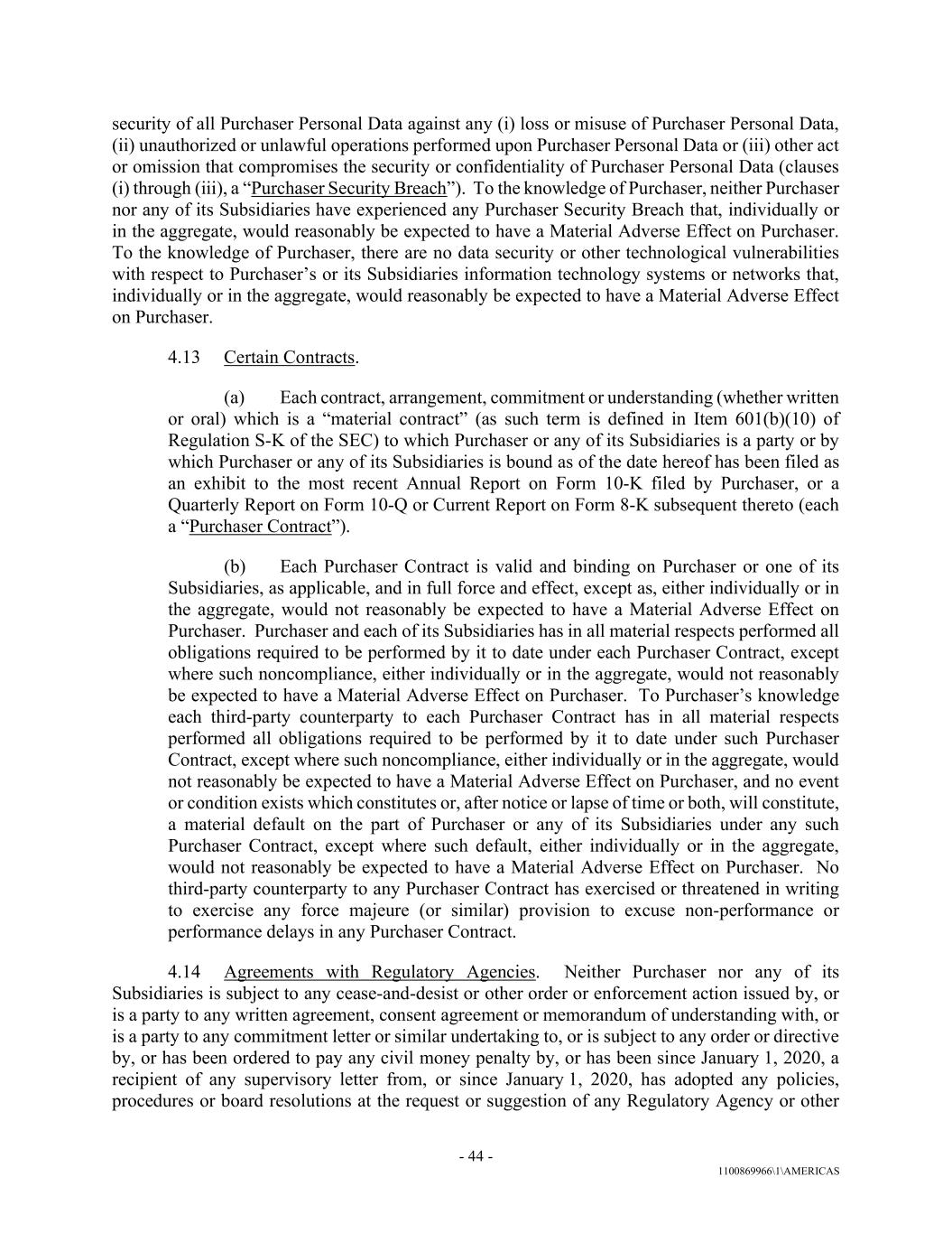 - 44 - 1100869966\1\AMERICAS security of all Purchaser Personal Data against any (i) loss or misuse of Purchaser Personal Data, (ii) unauthorized or unlawful operations performed upon Purchaser Personal Data or (iii) other act or omission that compromises the security or confidentiality of Purchaser Personal Data (clauses (i) through (iii), a “Purchaser Security Breach”). To the knowledge of Purchaser, neither Purchaser nor any of its Subsidiaries have experienced any Purchaser Security Breach that, individually or in the aggregate, would reasonably be expected to have a Material Adverse Effect on Purchaser. To the knowledge of Purchaser, there are no data security or other technological vulnerabilities with respect to Purchaser’s or its Subsidiaries information technology systems or networks that, individually or in the aggregate, would reasonably be expected to have a Material Adverse Effect on Purchaser. 4.13 Certain Contracts. (a) Each contract, arrangement, commitment or understanding (whether written or oral) which is a “material contract” (as such term is defined in Item 601(b)(10) of Regulation S-K of the SEC) to which Purchaser or any of its Subsidiaries is a party or by which Purchaser or any of its Subsidiaries is bound as of the date hereof has been filed as an exhibit to the most recent Annual Report on Form 10-K filed by Purchaser, or a Quarterly Report on Form 10-Q or Current Report on Form 8-K subsequent thereto (each a “Purchaser Contract”). (b) Each Purchaser Contract is valid and binding on Purchaser or one of its Subsidiaries, as applicable, and in full force and effect, except as, either individually or in the aggregate, would not reasonably be expected to have a Material Adverse Effect on Purchaser. Purchaser and each of its Subsidiaries has in all material respects performed all obligations required to be performed by it to date under each Purchaser Contract, except where such noncompliance, either individually or in the aggregate, would not reasonably be expected to have a Material Adverse Effect on Purchaser. To Purchaser’s knowledge each third-party counterparty to each Purchaser Contract has in all material respects performed all obligations required to be performed by it to date under such Purchaser Contract, except where such noncompliance, either individually or in the aggregate, would not reasonably be expected to have a Material Adverse Effect on Purchaser, and no event or condition exists which constitutes or, after notice or lapse of time or both, will constitute, a material default on the part of Purchaser or any of its Subsidiaries under any such Purchaser Contract, except where such default, either individually or in the aggregate, would not reasonably be expected to have a Material Adverse Effect on Purchaser. No third-party counterparty to any Purchaser Contract has exercised or threatened in writing to exercise any force majeure (or similar) provision to excuse non-performance or performance delays in any Purchaser Contract. 4.14 Agreements with Regulatory Agencies. Neither Purchaser nor any of its Subsidiaries is subject to any cease-and-desist or other order or enforcement action issued by, or is a party to any written agreement, consent agreement or memorandum of understanding with, or is a party to any commitment letter or similar undertaking to, or is subject to any order or directive by, or has been ordered to pay any civil money penalty by, or has been since January 1, 2020, a recipient of any supervisory letter from, or since January 1, 2020, has adopted any policies, procedures or board resolutions at the request or suggestion of any Regulatory Agency or other