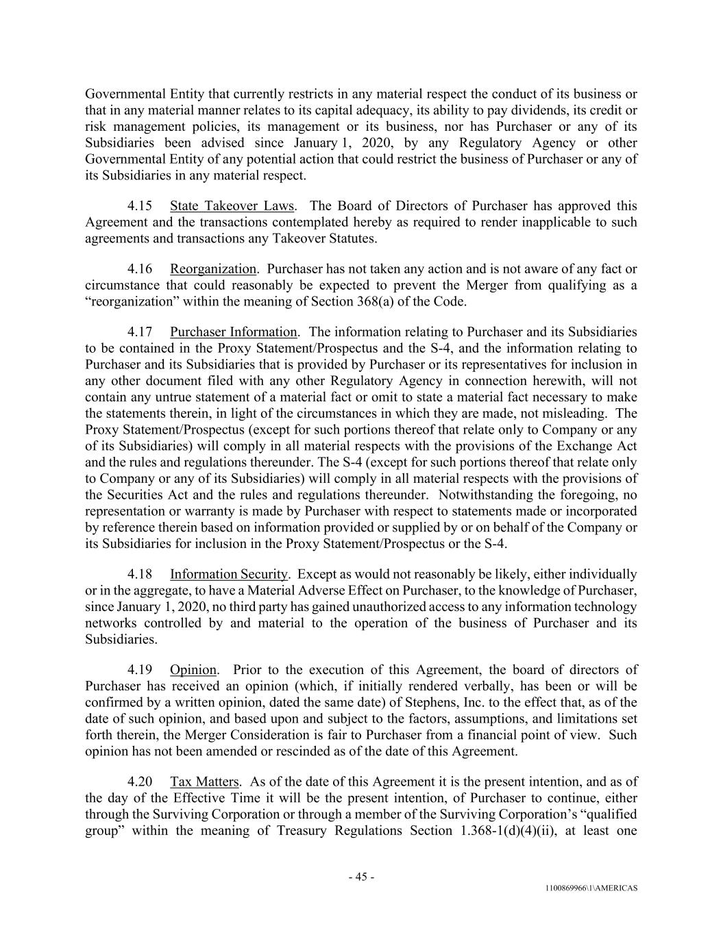 - 45 - 1100869966\1\AMERICAS Governmental Entity that currently restricts in any material respect the conduct of its business or that in any material manner relates to its capital adequacy, its ability to pay dividends, its credit or risk management policies, its management or its business, nor has Purchaser or any of its Subsidiaries been advised since January 1, 2020, by any Regulatory Agency or other Governmental Entity of any potential action that could restrict the business of Purchaser or any of its Subsidiaries in any material respect. 4.15 State Takeover Laws. The Board of Directors of Purchaser has approved this Agreement and the transactions contemplated hereby as required to render inapplicable to such agreements and transactions any Takeover Statutes. 4.16 Reorganization. Purchaser has not taken any action and is not aware of any fact or circumstance that could reasonably be expected to prevent the Merger from qualifying as a “reorganization” within the meaning of Section 368(a) of the Code. 4.17 Purchaser Information. The information relating to Purchaser and its Subsidiaries to be contained in the Proxy Statement/Prospectus and the S-4, and the information relating to Purchaser and its Subsidiaries that is provided by Purchaser or its representatives for inclusion in any other document filed with any other Regulatory Agency in connection herewith, will not contain any untrue statement of a material fact or omit to state a material fact necessary to make the statements therein, in light of the circumstances in which they are made, not misleading. The Proxy Statement/Prospectus (except for such portions thereof that relate only to Company or any of its Subsidiaries) will comply in all material respects with the provisions of the Exchange Act and the rules and regulations thereunder. The S-4 (except for such portions thereof that relate only to Company or any of its Subsidiaries) will comply in all material respects with the provisions of the Securities Act and the rules and regulations thereunder. Notwithstanding the foregoing, no representation or warranty is made by Purchaser with respect to statements made or incorporated by reference therein based on information provided or supplied by or on behalf of the Company or its Subsidiaries for inclusion in the Proxy Statement/Prospectus or the S-4. 4.18 Information Security. Except as would not reasonably be likely, either individually or in the aggregate, to have a Material Adverse Effect on Purchaser, to the knowledge of Purchaser, since January 1, 2020, no third party has gained unauthorized access to any information technology networks controlled by and material to the operation of the business of Purchaser and its Subsidiaries. 4.19 Opinion. Prior to the execution of this Agreement, the board of directors of Purchaser has received an opinion (which, if initially rendered verbally, has been or will be confirmed by a written opinion, dated the same date) of Stephens, Inc. to the effect that, as of the date of such opinion, and based upon and subject to the factors, assumptions, and limitations set forth therein, the Merger Consideration is fair to Purchaser from a financial point of view. Such opinion has not been amended or rescinded as of the date of this Agreement. 4.20 Tax Matters. As of the date of this Agreement it is the present intention, and as of the day of the Effective Time it will be the present intention, of Purchaser to continue, either through the Surviving Corporation or through a member of the Surviving Corporation’s “qualified group” within the meaning of Treasury Regulations Section 1.368-1(d)(4)(ii), at least one