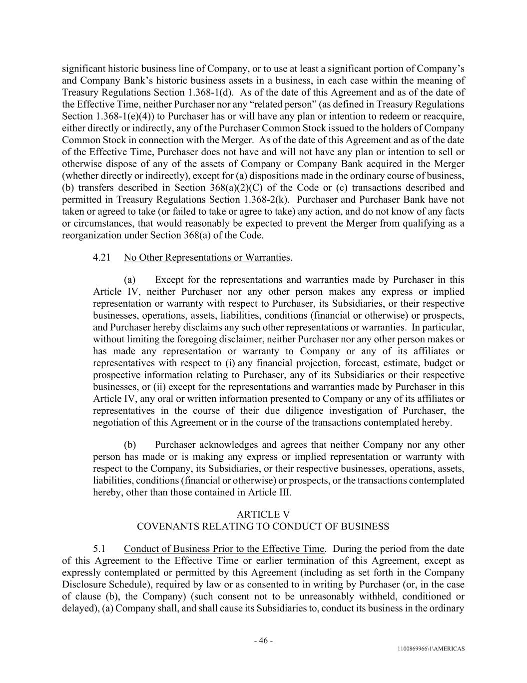 - 46 - 1100869966\1\AMERICAS significant historic business line of Company, or to use at least a significant portion of Company’s and Company Bank’s historic business assets in a business, in each case within the meaning of Treasury Regulations Section 1.368-1(d). As of the date of this Agreement and as of the date of the Effective Time, neither Purchaser nor any “related person” (as defined in Treasury Regulations Section 1.368-1(e)(4)) to Purchaser has or will have any plan or intention to redeem or reacquire, either directly or indirectly, any of the Purchaser Common Stock issued to the holders of Company Common Stock in connection with the Merger. As of the date of this Agreement and as of the date of the Effective Time, Purchaser does not have and will not have any plan or intention to sell or otherwise dispose of any of the assets of Company or Company Bank acquired in the Merger (whether directly or indirectly), except for (a) dispositions made in the ordinary course of business, (b) transfers described in Section 368(a)(2)(C) of the Code or (c) transactions described and permitted in Treasury Regulations Section 1.368-2(k). Purchaser and Purchaser Bank have not taken or agreed to take (or failed to take or agree to take) any action, and do not know of any facts or circumstances, that would reasonably be expected to prevent the Merger from qualifying as a reorganization under Section 368(a) of the Code. 4.21 No Other Representations or Warranties. (a) Except for the representations and warranties made by Purchaser in this Article IV, neither Purchaser nor any other person makes any express or implied representation or warranty with respect to Purchaser, its Subsidiaries, or their respective businesses, operations, assets, liabilities, conditions (financial or otherwise) or prospects, and Purchaser hereby disclaims any such other representations or warranties. In particular, without limiting the foregoing disclaimer, neither Purchaser nor any other person makes or has made any representation or warranty to Company or any of its affiliates or representatives with respect to (i) any financial projection, forecast, estimate, budget or prospective information relating to Purchaser, any of its Subsidiaries or their respective businesses, or (ii) except for the representations and warranties made by Purchaser in this Article IV, any oral or written information presented to Company or any of its affiliates or representatives in the course of their due diligence investigation of Purchaser, the negotiation of this Agreement or in the course of the transactions contemplated hereby. (b) Purchaser acknowledges and agrees that neither Company nor any other person has made or is making any express or implied representation or warranty with respect to the Company, its Subsidiaries, or their respective businesses, operations, assets, liabilities, conditions (financial or otherwise) or prospects, or the transactions contemplated hereby, other than those contained in Article III. ARTICLE V COVENANTS RELATING TO CONDUCT OF BUSINESS 5.1 Conduct of Business Prior to the Effective Time. During the period from the date of this Agreement to the Effective Time or earlier termination of this Agreement, except as expressly contemplated or permitted by this Agreement (including as set forth in the Company Disclosure Schedule), required by law or as consented to in writing by Purchaser (or, in the case of clause (b), the Company) (such consent not to be unreasonably withheld, conditioned or delayed), (a) Company shall, and shall cause its Subsidiaries to, conduct its business in the ordinary
