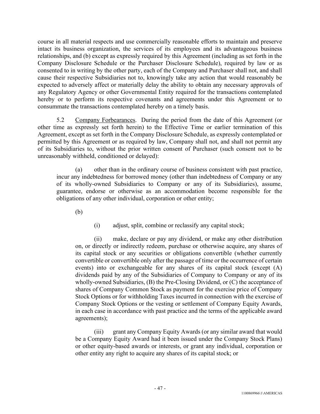 - 47 - 1100869966\1\AMERICAS course in all material respects and use commercially reasonable efforts to maintain and preserve intact its business organization, the services of its employees and its advantageous business relationships, and (b) except as expressly required by this Agreement (including as set forth in the Company Disclosure Schedule or the Purchaser Disclosure Schedule), required by law or as consented to in writing by the other party, each of the Company and Purchaser shall not, and shall cause their respective Subsidiaries not to, knowingly take any action that would reasonably be expected to adversely affect or materially delay the ability to obtain any necessary approvals of any Regulatory Agency or other Governmental Entity required for the transactions contemplated hereby or to perform its respective covenants and agreements under this Agreement or to consummate the transactions contemplated hereby on a timely basis. 5.2 Company Forbearances. During the period from the date of this Agreement (or other time as expressly set forth herein) to the Effective Time or earlier termination of this Agreement, except as set forth in the Company Disclosure Schedule, as expressly contemplated or permitted by this Agreement or as required by law, Company shall not, and shall not permit any of its Subsidiaries to, without the prior written consent of Purchaser (such consent not to be unreasonably withheld, conditioned or delayed): (a) other than in the ordinary course of business consistent with past practice, incur any indebtedness for borrowed money (other than indebtedness of Company or any of its wholly-owned Subsidiaries to Company or any of its Subsidiaries), assume, guarantee, endorse or otherwise as an accommodation become responsible for the obligations of any other individual, corporation or other entity; (b) (i) adjust, split, combine or reclassify any capital stock; (ii) make, declare or pay any dividend, or make any other distribution on, or directly or indirectly redeem, purchase or otherwise acquire, any shares of its capital stock or any securities or obligations convertible (whether currently convertible or convertible only after the passage of time or the occurrence of certain events) into or exchangeable for any shares of its capital stock (except (A) dividends paid by any of the Subsidiaries of Company to Company or any of its wholly-owned Subsidiaries, (B) the Pre-Closing Dividend, or (C) the acceptance of shares of Company Common Stock as payment for the exercise price of Company Stock Options or for withholding Taxes incurred in connection with the exercise of Company Stock Options or the vesting or settlement of Company Equity Awards, in each case in accordance with past practice and the terms of the applicable award agreements); (iii) grant any Company Equity Awards (or any similar award that would be a Company Equity Award had it been issued under the Company Stock Plans) or other equity-based awards or interests, or grant any individual, corporation or other entity any right to acquire any shares of its capital stock; or