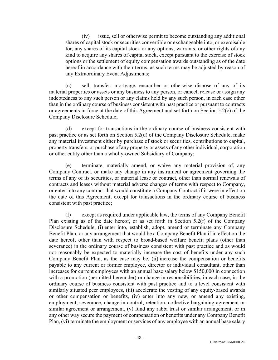 - 48 - 1100869966\1\AMERICAS (iv) issue, sell or otherwise permit to become outstanding any additional shares of capital stock or securities convertible or exchangeable into, or exercisable for, any shares of its capital stock or any options, warrants, or other rights of any kind to acquire any shares of capital stock, except pursuant to the exercise of stock options or the settlement of equity compensation awards outstanding as of the date hereof in accordance with their terms, as such terms may be adjusted by reason of any Extraordinary Event Adjustments; (c) sell, transfer, mortgage, encumber or otherwise dispose of any of its material properties or assets or any business to any person, or cancel, release or assign any indebtedness to any such person or any claims held by any such person, in each case other than in the ordinary course of business consistent with past practice or pursuant to contracts or agreements in force at the date of this Agreement and set forth on Section 5.2(c) of the Company Disclosure Schedule; (d) except for transactions in the ordinary course of business consistent with past practice or as set forth on Section 5.2(d) of the Company Disclosure Schedule, make any material investment either by purchase of stock or securities, contributions to capital, property transfers, or purchase of any property or assets of any other individual, corporation or other entity other than a wholly-owned Subsidiary of Company; (e) terminate, materially amend, or waive any material provision of, any Company Contract, or make any change in any instrument or agreement governing the terms of any of its securities, or material lease or contract, other than normal renewals of contracts and leases without material adverse changes of terms with respect to Company, or enter into any contract that would constitute a Company Contract if it were in effect on the date of this Agreement, except for transactions in the ordinary course of business consistent with past practice; (f) except as required under applicable law, the terms of any Company Benefit Plan existing as of the date hereof, or as set forth in Section 5.2(f) of the Company Disclosure Schedule, (i) enter into, establish, adopt, amend or terminate any Company Benefit Plan, or any arrangement that would be a Company Benefit Plan if in effect on the date hereof, other than with respect to broad-based welfare benefit plans (other than severance) in the ordinary course of business consistent with past practice and as would not reasonably be expected to materially increase the cost of benefits under any such Company Benefit Plan, as the case may be, (ii) increase the compensation or benefits payable to any current or former employee, director or individual consultant, other than increases for current employees with an annual base salary below $150,000 in connection with a promotion (permitted hereunder) or change in responsibilities, in each case, in the ordinary course of business consistent with past practice and to a level consistent with similarly situated peer employees, (iii) accelerate the vesting of any equity-based awards or other compensation or benefits, (iv) enter into any new, or amend any existing, employment, severance, change in control, retention, collective bargaining agreement or similar agreement or arrangement, (v) fund any rabbi trust or similar arrangement, or in any other way secure the payment of compensation or benefits under any Company Benefit Plan, (vi) terminate the employment or services of any employee with an annual base salary