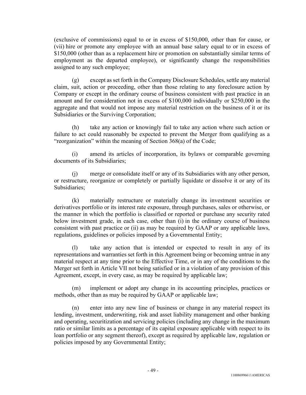 - 49 - 1100869966\1\AMERICAS (exclusive of commissions) equal to or in excess of $150,000, other than for cause, or (vii) hire or promote any employee with an annual base salary equal to or in excess of $150,000 (other than as a replacement hire or promotion on substantially similar terms of employment as the departed employee), or significantly change the responsibilities assigned to any such employee; (g) except as set forth in the Company Disclosure Schedules, settle any material claim, suit, action or proceeding, other than those relating to any foreclosure action by Company or except in the ordinary course of business consistent with past practice in an amount and for consideration not in excess of $100,000 individually or $250,000 in the aggregate and that would not impose any material restriction on the business of it or its Subsidiaries or the Surviving Corporation; (h) take any action or knowingly fail to take any action where such action or failure to act could reasonably be expected to prevent the Merger from qualifying as a “reorganization” within the meaning of Section 368(a) of the Code; (i) amend its articles of incorporation, its bylaws or comparable governing documents of its Subsidiaries; (j) merge or consolidate itself or any of its Subsidiaries with any other person, or restructure, reorganize or completely or partially liquidate or dissolve it or any of its Subsidiaries; (k) materially restructure or materially change its investment securities or derivatives portfolio or its interest rate exposure, through purchases, sales or otherwise, or the manner in which the portfolio is classified or reported or purchase any security rated below investment grade, in each case, other than (i) in the ordinary course of business consistent with past practice or (ii) as may be required by GAAP or any applicable laws, regulations, guidelines or policies imposed by a Governmental Entity; (l) take any action that is intended or expected to result in any of its representations and warranties set forth in this Agreement being or becoming untrue in any material respect at any time prior to the Effective Time, or in any of the conditions to the Merger set forth in Article VII not being satisfied or in a violation of any provision of this Agreement, except, in every case, as may be required by applicable law; (m) implement or adopt any change in its accounting principles, practices or methods, other than as may be required by GAAP or applicable law; (n) enter into any new line of business or change in any material respect its lending, investment, underwriting, risk and asset liability management and other banking and operating, securitization and servicing policies (including any change in the maximum ratio or similar limits as a percentage of its capital exposure applicable with respect to its loan portfolio or any segment thereof), except as required by applicable law, regulation or policies imposed by any Governmental Entity;