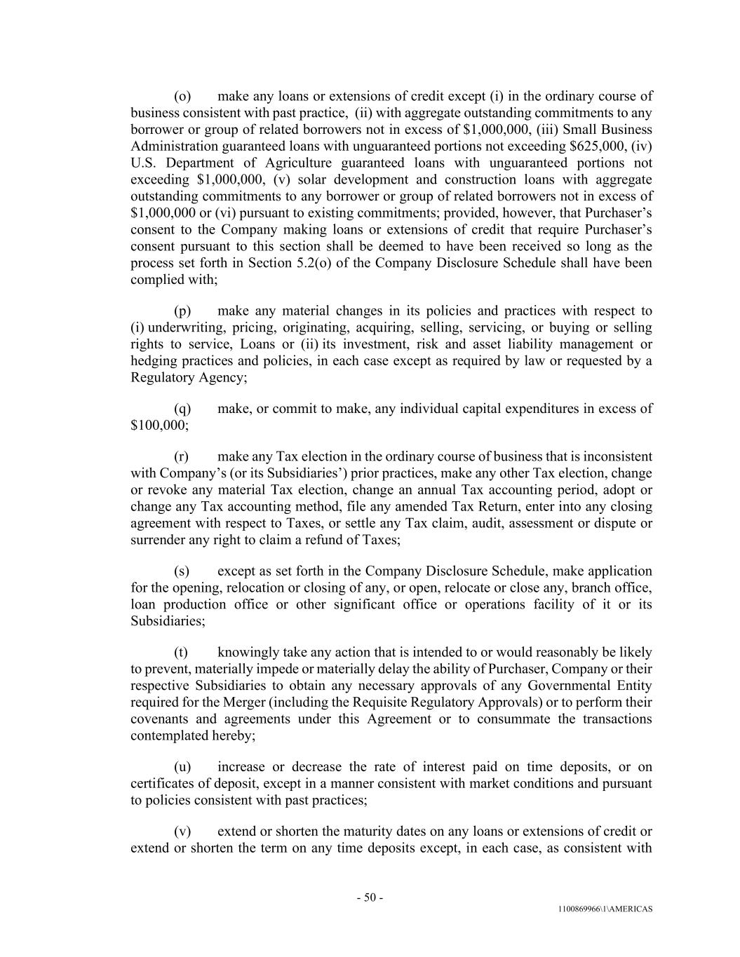 - 50 - 1100869966\1\AMERICAS (o) make any loans or extensions of credit except (i) in the ordinary course of business consistent with past practice, (ii) with aggregate outstanding commitments to any borrower or group of related borrowers not in excess of $1,000,000, (iii) Small Business Administration guaranteed loans with unguaranteed portions not exceeding $625,000, (iv) U.S. Department of Agriculture guaranteed loans with unguaranteed portions not exceeding $1,000,000, (v) solar development and construction loans with aggregate outstanding commitments to any borrower or group of related borrowers not in excess of $1,000,000 or (vi) pursuant to existing commitments; provided, however, that Purchaser’s consent to the Company making loans or extensions of credit that require Purchaser’s consent pursuant to this section shall be deemed to have been received so long as the process set forth in Section 5.2(o) of the Company Disclosure Schedule shall have been complied with; (p) make any material changes in its policies and practices with respect to (i) underwriting, pricing, originating, acquiring, selling, servicing, or buying or selling rights to service, Loans or (ii) its investment, risk and asset liability management or hedging practices and policies, in each case except as required by law or requested by a Regulatory Agency; (q) make, or commit to make, any individual capital expenditures in excess of $100,000; (r) make any Tax election in the ordinary course of business that is inconsistent with Company’s (or its Subsidiaries’) prior practices, make any other Tax election, change or revoke any material Tax election, change an annual Tax accounting period, adopt or change any Tax accounting method, file any amended Tax Return, enter into any closing agreement with respect to Taxes, or settle any Tax claim, audit, assessment or dispute or surrender any right to claim a refund of Taxes; (s) except as set forth in the Company Disclosure Schedule, make application for the opening, relocation or closing of any, or open, relocate or close any, branch office, loan production office or other significant office or operations facility of it or its Subsidiaries; (t) knowingly take any action that is intended to or would reasonably be likely to prevent, materially impede or materially delay the ability of Purchaser, Company or their respective Subsidiaries to obtain any necessary approvals of any Governmental Entity required for the Merger (including the Requisite Regulatory Approvals) or to perform their covenants and agreements under this Agreement or to consummate the transactions contemplated hereby; (u) increase or decrease the rate of interest paid on time deposits, or on certificates of deposit, except in a manner consistent with market conditions and pursuant to policies consistent with past practices; (v) extend or shorten the maturity dates on any loans or extensions of credit or extend or shorten the term on any time deposits except, in each case, as consistent with