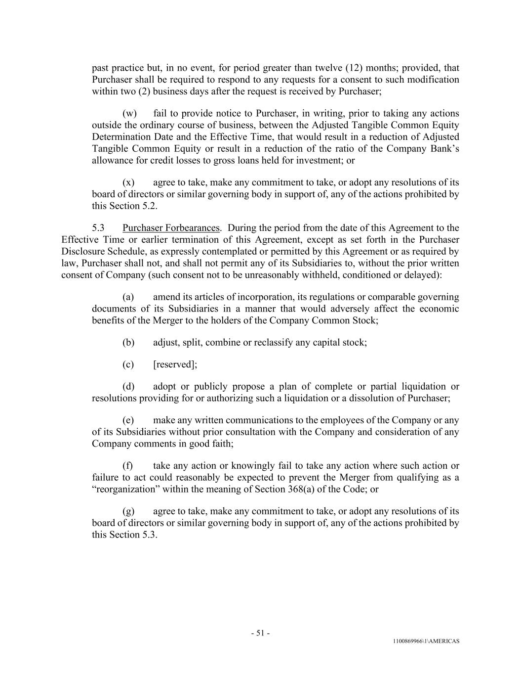 - 51 - 1100869966\1\AMERICAS past practice but, in no event, for period greater than twelve (12) months; provided, that Purchaser shall be required to respond to any requests for a consent to such modification within two (2) business days after the request is received by Purchaser; (w) fail to provide notice to Purchaser, in writing, prior to taking any actions outside the ordinary course of business, between the Adjusted Tangible Common Equity Determination Date and the Effective Time, that would result in a reduction of Adjusted Tangible Common Equity or result in a reduction of the ratio of the Company Bank’s allowance for credit losses to gross loans held for investment; or (x) agree to take, make any commitment to take, or adopt any resolutions of its board of directors or similar governing body in support of, any of the actions prohibited by this Section 5.2. 5.3 Purchaser Forbearances. During the period from the date of this Agreement to the Effective Time or earlier termination of this Agreement, except as set forth in the Purchaser Disclosure Schedule, as expressly contemplated or permitted by this Agreement or as required by law, Purchaser shall not, and shall not permit any of its Subsidiaries to, without the prior written consent of Company (such consent not to be unreasonably withheld, conditioned or delayed): (a) amend its articles of incorporation, its regulations or comparable governing documents of its Subsidiaries in a manner that would adversely affect the economic benefits of the Merger to the holders of the Company Common Stock; (b) adjust, split, combine or reclassify any capital stock; (c) [reserved]; (d) adopt or publicly propose a plan of complete or partial liquidation or resolutions providing for or authorizing such a liquidation or a dissolution of Purchaser; (e) make any written communications to the employees of the Company or any of its Subsidiaries without prior consultation with the Company and consideration of any Company comments in good faith; (f) take any action or knowingly fail to take any action where such action or failure to act could reasonably be expected to prevent the Merger from qualifying as a “reorganization” within the meaning of Section 368(a) of the Code; or (g) agree to take, make any commitment to take, or adopt any resolutions of its board of directors or similar governing body in support of, any of the actions prohibited by this Section 5.3.