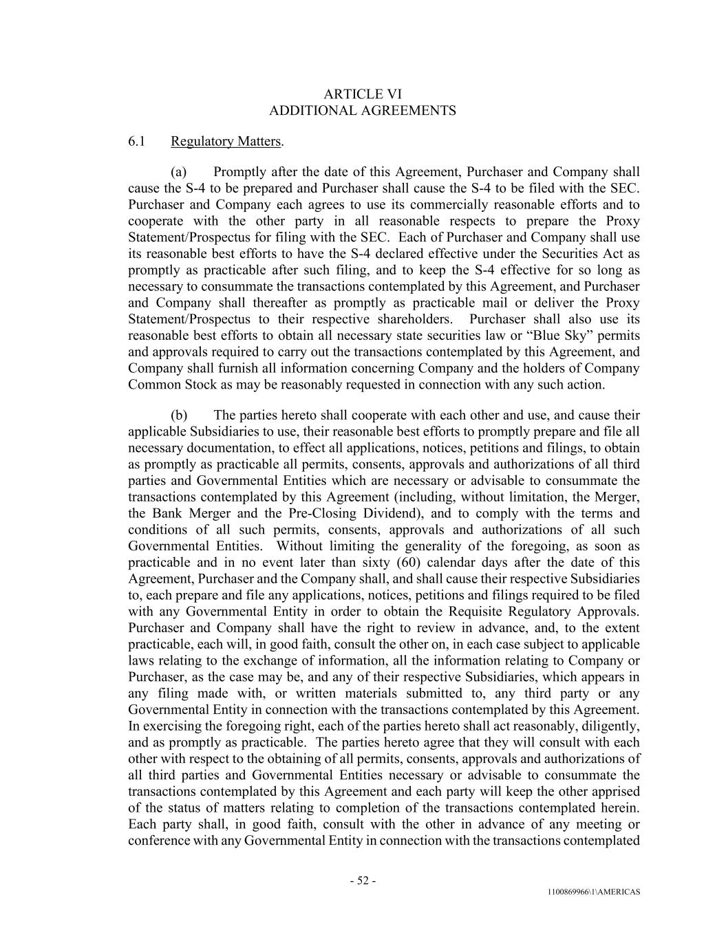 - 52 - 1100869966\1\AMERICAS ARTICLE VI ADDITIONAL AGREEMENTS 6.1 Regulatory Matters. (a) Promptly after the date of this Agreement, Purchaser and Company shall cause the S-4 to be prepared and Purchaser shall cause the S-4 to be filed with the SEC. Purchaser and Company each agrees to use its commercially reasonable efforts and to cooperate with the other party in all reasonable respects to prepare the Proxy Statement/Prospectus for filing with the SEC. Each of Purchaser and Company shall use its reasonable best efforts to have the S-4 declared effective under the Securities Act as promptly as practicable after such filing, and to keep the S-4 effective for so long as necessary to consummate the transactions contemplated by this Agreement, and Purchaser and Company shall thereafter as promptly as practicable mail or deliver the Proxy Statement/Prospectus to their respective shareholders. Purchaser shall also use its reasonable best efforts to obtain all necessary state securities law or “Blue Sky” permits and approvals required to carry out the transactions contemplated by this Agreement, and Company shall furnish all information concerning Company and the holders of Company Common Stock as may be reasonably requested in connection with any such action. (b) The parties hereto shall cooperate with each other and use, and cause their applicable Subsidiaries to use, their reasonable best efforts to promptly prepare and file all necessary documentation, to effect all applications, notices, petitions and filings, to obtain as promptly as practicable all permits, consents, approvals and authorizations of all third parties and Governmental Entities which are necessary or advisable to consummate the transactions contemplated by this Agreement (including, without limitation, the Merger, the Bank Merger and the Pre-Closing Dividend), and to comply with the terms and conditions of all such permits, consents, approvals and authorizations of all such Governmental Entities. Without limiting the generality of the foregoing, as soon as practicable and in no event later than sixty (60) calendar days after the date of this Agreement, Purchaser and the Company shall, and shall cause their respective Subsidiaries to, each prepare and file any applications, notices, petitions and filings required to be filed with any Governmental Entity in order to obtain the Requisite Regulatory Approvals. Purchaser and Company shall have the right to review in advance, and, to the extent practicable, each will, in good faith, consult the other on, in each case subject to applicable laws relating to the exchange of information, all the information relating to Company or Purchaser, as the case may be, and any of their respective Subsidiaries, which appears in any filing made with, or written materials submitted to, any third party or any Governmental Entity in connection with the transactions contemplated by this Agreement. In exercising the foregoing right, each of the parties hereto shall act reasonably, diligently, and as promptly as practicable. The parties hereto agree that they will consult with each other with respect to the obtaining of all permits, consents, approvals and authorizations of all third parties and Governmental Entities necessary or advisable to consummate the transactions contemplated by this Agreement and each party will keep the other apprised of the status of matters relating to completion of the transactions contemplated herein. Each party shall, in good faith, consult with the other in advance of any meeting or conference with any Governmental Entity in connection with the transactions contemplated