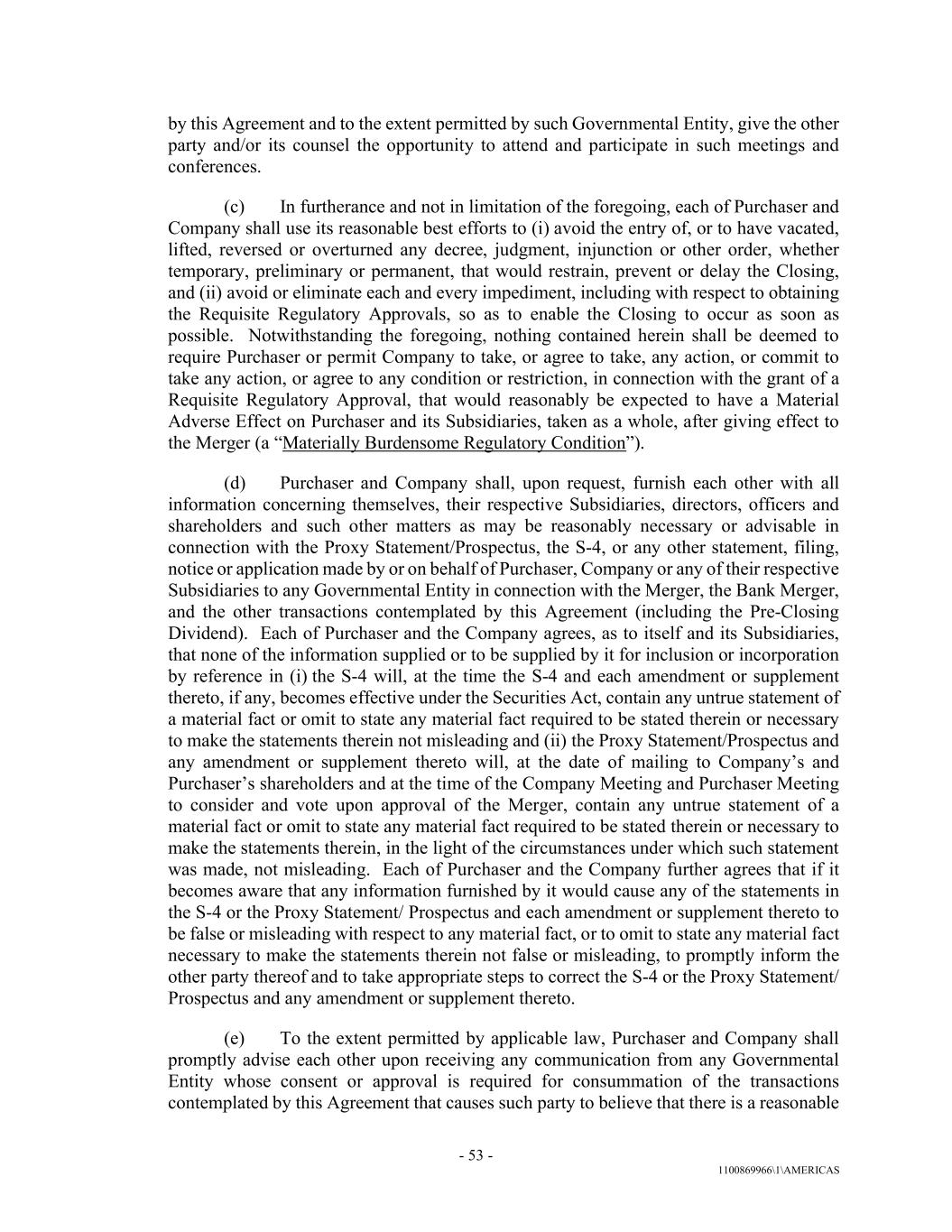 - 53 - 1100869966\1\AMERICAS by this Agreement and to the extent permitted by such Governmental Entity, give the other party and/or its counsel the opportunity to attend and participate in such meetings and conferences. (c) In furtherance and not in limitation of the foregoing, each of Purchaser and Company shall use its reasonable best efforts to (i) avoid the entry of, or to have vacated, lifted, reversed or overturned any decree, judgment, injunction or other order, whether temporary, preliminary or permanent, that would restrain, prevent or delay the Closing, and (ii) avoid or eliminate each and every impediment, including with respect to obtaining the Requisite Regulatory Approvals, so as to enable the Closing to occur as soon as possible. Notwithstanding the foregoing, nothing contained herein shall be deemed to require Purchaser or permit Company to take, or agree to take, any action, or commit to take any action, or agree to any condition or restriction, in connection with the grant of a Requisite Regulatory Approval, that would reasonably be expected to have a Material Adverse Effect on Purchaser and its Subsidiaries, taken as a whole, after giving effect to the Merger (a “Materially Burdensome Regulatory Condition”). (d) Purchaser and Company shall, upon request, furnish each other with all information concerning themselves, their respective Subsidiaries, directors, officers and shareholders and such other matters as may be reasonably necessary or advisable in connection with the Proxy Statement/Prospectus, the S-4, or any other statement, filing, notice or application made by or on behalf of Purchaser, Company or any of their respective Subsidiaries to any Governmental Entity in connection with the Merger, the Bank Merger, and the other transactions contemplated by this Agreement (including the Pre-Closing Dividend). Each of Purchaser and the Company agrees, as to itself and its Subsidiaries, that none of the information supplied or to be supplied by it for inclusion or incorporation by reference in (i) the S-4 will, at the time the S-4 and each amendment or supplement thereto, if any, becomes effective under the Securities Act, contain any untrue statement of a material fact or omit to state any material fact required to be stated therein or necessary to make the statements therein not misleading and (ii) the Proxy Statement/Prospectus and any amendment or supplement thereto will, at the date of mailing to Company’s and Purchaser’s shareholders and at the time of the Company Meeting and Purchaser Meeting to consider and vote upon approval of the Merger, contain any untrue statement of a material fact or omit to state any material fact required to be stated therein or necessary to make the statements therein, in the light of the circumstances under which such statement was made, not misleading. Each of Purchaser and the Company further agrees that if it becomes aware that any information furnished by it would cause any of the statements in the S-4 or the Proxy Statement/ Prospectus and each amendment or supplement thereto to be false or misleading with respect to any material fact, or to omit to state any material fact necessary to make the statements therein not false or misleading, to promptly inform the other party thereof and to take appropriate steps to correct the S-4 or the Proxy Statement/ Prospectus and any amendment or supplement thereto. (e) To the extent permitted by applicable law, Purchaser and Company shall promptly advise each other upon receiving any communication from any Governmental Entity whose consent or approval is required for consummation of the transactions contemplated by this Agreement that causes such party to believe that there is a reasonable