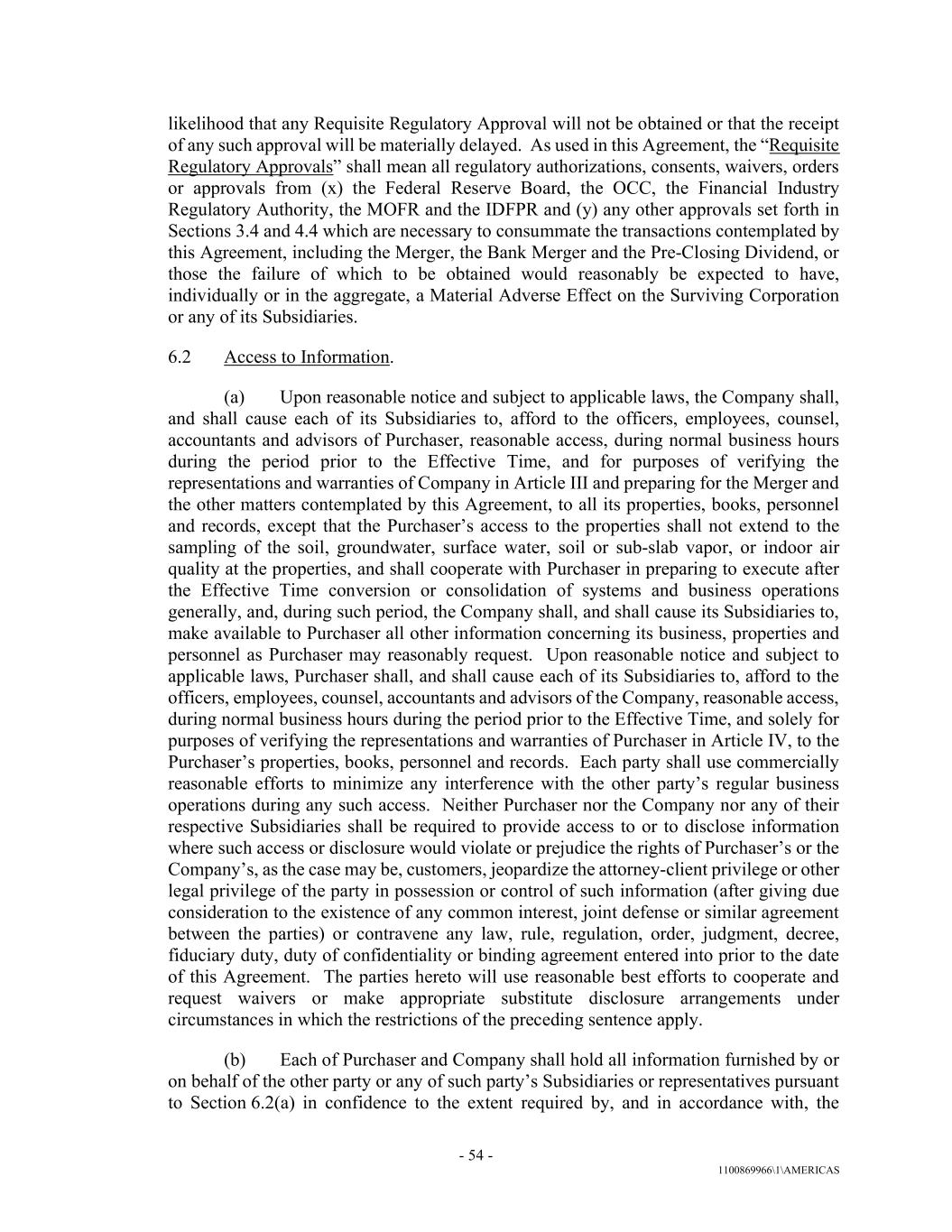- 54 - 1100869966\1\AMERICAS likelihood that any Requisite Regulatory Approval will not be obtained or that the receipt of any such approval will be materially delayed. As used in this Agreement, the “Requisite Regulatory Approvals” shall mean all regulatory authorizations, consents, waivers, orders or approvals from (x) the Federal Reserve Board, the OCC, the Financial Industry Regulatory Authority, the MOFR and the IDFPR and (y) any other approvals set forth in Sections 3.4 and 4.4 which are necessary to consummate the transactions contemplated by this Agreement, including the Merger, the Bank Merger and the Pre-Closing Dividend, or those the failure of which to be obtained would reasonably be expected to have, individually or in the aggregate, a Material Adverse Effect on the Surviving Corporation or any of its Subsidiaries. 6.2 Access to Information. (a) Upon reasonable notice and subject to applicable laws, the Company shall, and shall cause each of its Subsidiaries to, afford to the officers, employees, counsel, accountants and advisors of Purchaser, reasonable access, during normal business hours during the period prior to the Effective Time, and for purposes of verifying the representations and warranties of Company in Article III and preparing for the Merger and the other matters contemplated by this Agreement, to all its properties, books, personnel and records, except that the Purchaser’s access to the properties shall not extend to the sampling of the soil, groundwater, surface water, soil or sub-slab vapor, or indoor air quality at the properties, and shall cooperate with Purchaser in preparing to execute after the Effective Time conversion or consolidation of systems and business operations generally, and, during such period, the Company shall, and shall cause its Subsidiaries to, make available to Purchaser all other information concerning its business, properties and personnel as Purchaser may reasonably request. Upon reasonable notice and subject to applicable laws, Purchaser shall, and shall cause each of its Subsidiaries to, afford to the officers, employees, counsel, accountants and advisors of the Company, reasonable access, during normal business hours during the period prior to the Effective Time, and solely for purposes of verifying the representations and warranties of Purchaser in Article IV, to the Purchaser’s properties, books, personnel and records. Each party shall use commercially reasonable efforts to minimize any interference with the other party’s regular business operations during any such access. Neither Purchaser nor the Company nor any of their respective Subsidiaries shall be required to provide access to or to disclose information where such access or disclosure would violate or prejudice the rights of Purchaser’s or the Company’s, as the case may be, customers, jeopardize the attorney-client privilege or other legal privilege of the party in possession or control of such information (after giving due consideration to the existence of any common interest, joint defense or similar agreement between the parties) or contravene any law, rule, regulation, order, judgment, decree, fiduciary duty, duty of confidentiality or binding agreement entered into prior to the date of this Agreement. The parties hereto will use reasonable best efforts to cooperate and request waivers or make appropriate substitute disclosure arrangements under circumstances in which the restrictions of the preceding sentence apply. (b) Each of Purchaser and Company shall hold all information furnished by or on behalf of the other party or any of such party’s Subsidiaries or representatives pursuant to Section 6.2(a) in confidence to the extent required by, and in accordance with, the