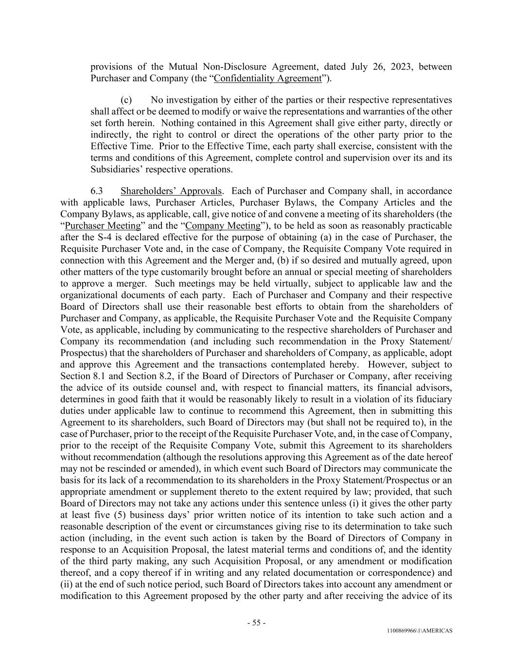 - 55 - 1100869966\1\AMERICAS provisions of the Mutual Non-Disclosure Agreement, dated July 26, 2023, between Purchaser and Company (the “Confidentiality Agreement”). (c) No investigation by either of the parties or their respective representatives shall affect or be deemed to modify or waive the representations and warranties of the other set forth herein. Nothing contained in this Agreement shall give either party, directly or indirectly, the right to control or direct the operations of the other party prior to the Effective Time. Prior to the Effective Time, each party shall exercise, consistent with the terms and conditions of this Agreement, complete control and supervision over its and its Subsidiaries’ respective operations. 6.3 Shareholders’ Approvals. Each of Purchaser and Company shall, in accordance with applicable laws, Purchaser Articles, Purchaser Bylaws, the Company Articles and the Company Bylaws, as applicable, call, give notice of and convene a meeting of its shareholders (the “Purchaser Meeting” and the “Company Meeting”), to be held as soon as reasonably practicable after the S-4 is declared effective for the purpose of obtaining (a) in the case of Purchaser, the Requisite Purchaser Vote and, in the case of Company, the Requisite Company Vote required in connection with this Agreement and the Merger and, (b) if so desired and mutually agreed, upon other matters of the type customarily brought before an annual or special meeting of shareholders to approve a merger. Such meetings may be held virtually, subject to applicable law and the organizational documents of each party. Each of Purchaser and Company and their respective Board of Directors shall use their reasonable best efforts to obtain from the shareholders of Purchaser and Company, as applicable, the Requisite Purchaser Vote and the Requisite Company Vote, as applicable, including by communicating to the respective shareholders of Purchaser and Company its recommendation (and including such recommendation in the Proxy Statement/ Prospectus) that the shareholders of Purchaser and shareholders of Company, as applicable, adopt and approve this Agreement and the transactions contemplated hereby. However, subject to Section 8.1 and Section 8.2, if the Board of Directors of Purchaser or Company, after receiving the advice of its outside counsel and, with respect to financial matters, its financial advisors, determines in good faith that it would be reasonably likely to result in a violation of its fiduciary duties under applicable law to continue to recommend this Agreement, then in submitting this Agreement to its shareholders, such Board of Directors may (but shall not be required to), in the case of Purchaser, prior to the receipt of the Requisite Purchaser Vote, and, in the case of Company, prior to the receipt of the Requisite Company Vote, submit this Agreement to its shareholders without recommendation (although the resolutions approving this Agreement as of the date hereof may not be rescinded or amended), in which event such Board of Directors may communicate the basis for its lack of a recommendation to its shareholders in the Proxy Statement/Prospectus or an appropriate amendment or supplement thereto to the extent required by law; provided, that such Board of Directors may not take any actions under this sentence unless (i) it gives the other party at least five (5) business days’ prior written notice of its intention to take such action and a reasonable description of the event or circumstances giving rise to its determination to take such action (including, in the event such action is taken by the Board of Directors of Company in response to an Acquisition Proposal, the latest material terms and conditions of, and the identity of the third party making, any such Acquisition Proposal, or any amendment or modification thereof, and a copy thereof if in writing and any related documentation or correspondence) and (ii) at the end of such notice period, such Board of Directors takes into account any amendment or modification to this Agreement proposed by the other party and after receiving the advice of its