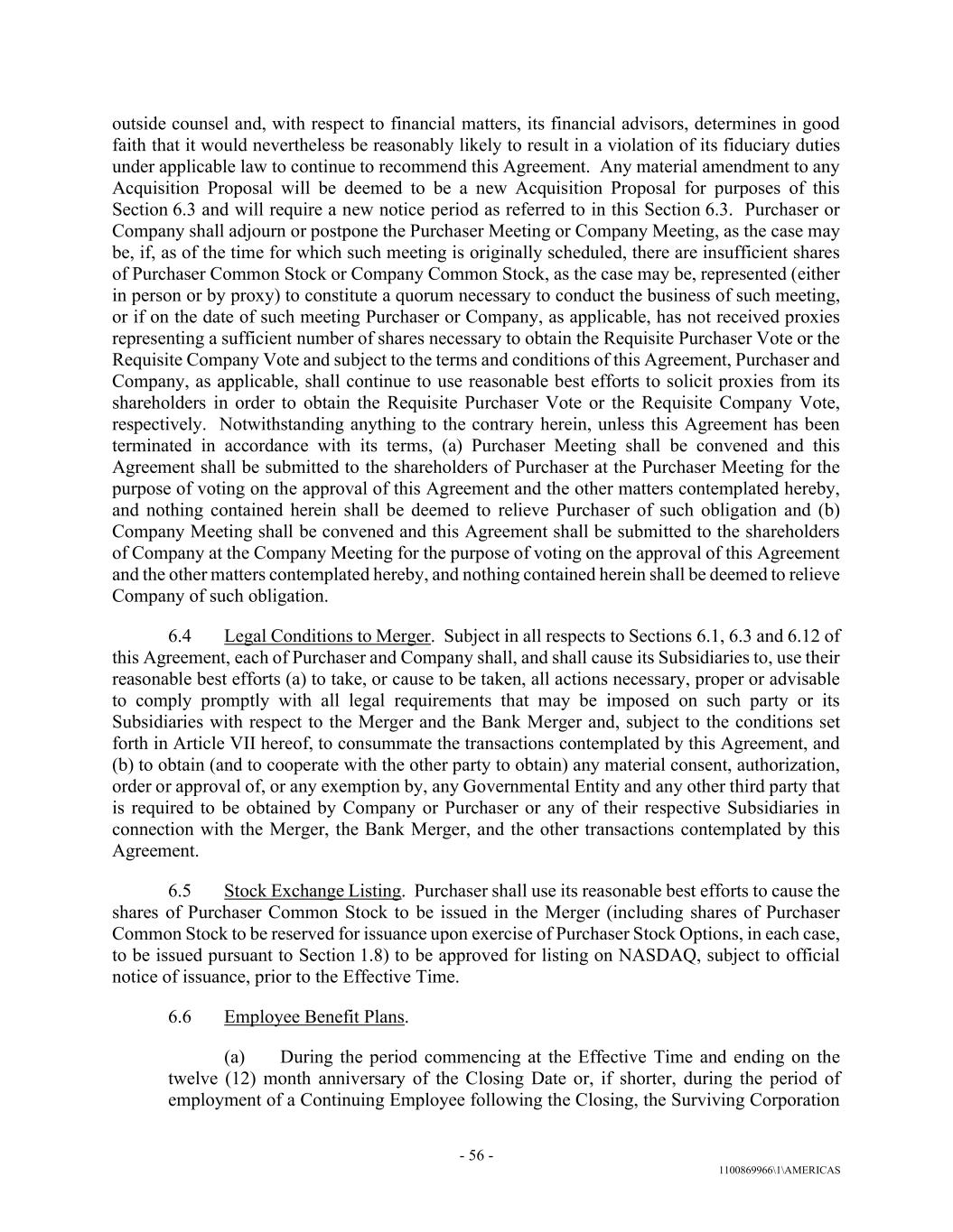 - 56 - 1100869966\1\AMERICAS outside counsel and, with respect to financial matters, its financial advisors, determines in good faith that it would nevertheless be reasonably likely to result in a violation of its fiduciary duties under applicable law to continue to recommend this Agreement. Any material amendment to any Acquisition Proposal will be deemed to be a new Acquisition Proposal for purposes of this Section 6.3 and will require a new notice period as referred to in this Section 6.3. Purchaser or Company shall adjourn or postpone the Purchaser Meeting or Company Meeting, as the case may be, if, as of the time for which such meeting is originally scheduled, there are insufficient shares of Purchaser Common Stock or Company Common Stock, as the case may be, represented (either in person or by proxy) to constitute a quorum necessary to conduct the business of such meeting, or if on the date of such meeting Purchaser or Company, as applicable, has not received proxies representing a sufficient number of shares necessary to obtain the Requisite Purchaser Vote or the Requisite Company Vote and subject to the terms and conditions of this Agreement, Purchaser and Company, as applicable, shall continue to use reasonable best efforts to solicit proxies from its shareholders in order to obtain the Requisite Purchaser Vote or the Requisite Company Vote, respectively. Notwithstanding anything to the contrary herein, unless this Agreement has been terminated in accordance with its terms, (a) Purchaser Meeting shall be convened and this Agreement shall be submitted to the shareholders of Purchaser at the Purchaser Meeting for the purpose of voting on the approval of this Agreement and the other matters contemplated hereby, and nothing contained herein shall be deemed to relieve Purchaser of such obligation and (b) Company Meeting shall be convened and this Agreement shall be submitted to the shareholders of Company at the Company Meeting for the purpose of voting on the approval of this Agreement and the other matters contemplated hereby, and nothing contained herein shall be deemed to relieve Company of such obligation. 6.4 Legal Conditions to Merger. Subject in all respects to Sections 6.1, 6.3 and 6.12 of this Agreement, each of Purchaser and Company shall, and shall cause its Subsidiaries to, use their reasonable best efforts (a) to take, or cause to be taken, all actions necessary, proper or advisable to comply promptly with all legal requirements that may be imposed on such party or its Subsidiaries with respect to the Merger and the Bank Merger and, subject to the conditions set forth in Article VII hereof, to consummate the transactions contemplated by this Agreement, and (b) to obtain (and to cooperate with the other party to obtain) any material consent, authorization, order or approval of, or any exemption by, any Governmental Entity and any other third party that is required to be obtained by Company or Purchaser or any of their respective Subsidiaries in connection with the Merger, the Bank Merger, and the other transactions contemplated by this Agreement. 6.5 Stock Exchange Listing. Purchaser shall use its reasonable best efforts to cause the shares of Purchaser Common Stock to be issued in the Merger (including shares of Purchaser Common Stock to be reserved for issuance upon exercise of Purchaser Stock Options, in each case, to be issued pursuant to Section 1.8) to be approved for listing on NASDAQ, subject to official notice of issuance, prior to the Effective Time. 6.6 Employee Benefit Plans. (a) During the period commencing at the Effective Time and ending on the twelve (12) month anniversary of the Closing Date or, if shorter, during the period of employment of a Continuing Employee following the Closing, the Surviving Corporation