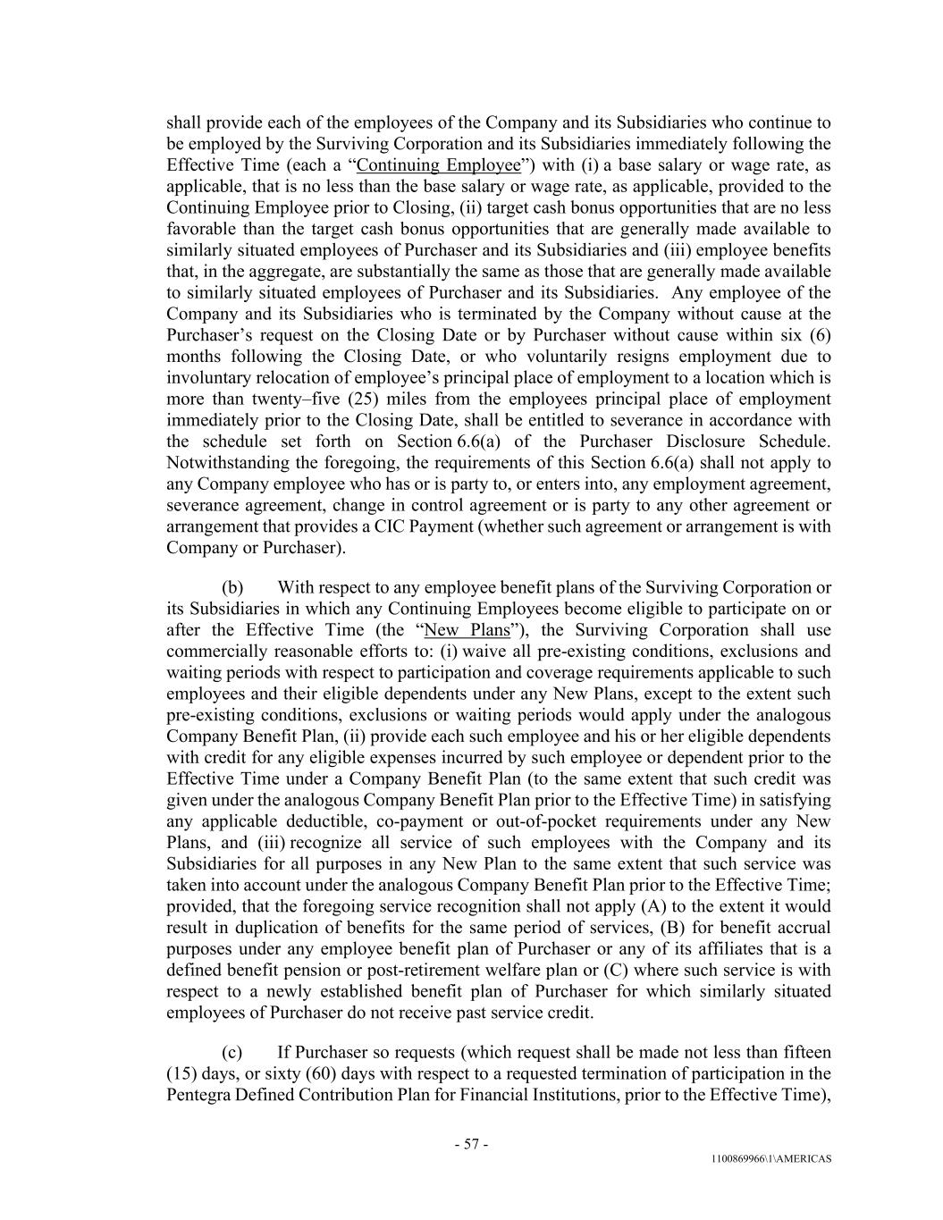 - 57 - 1100869966\1\AMERICAS shall provide each of the employees of the Company and its Subsidiaries who continue to be employed by the Surviving Corporation and its Subsidiaries immediately following the Effective Time (each a “Continuing Employee”) with (i) a base salary or wage rate, as applicable, that is no less than the base salary or wage rate, as applicable, provided to the Continuing Employee prior to Closing, (ii) target cash bonus opportunities that are no less favorable than the target cash bonus opportunities that are generally made available to similarly situated employees of Purchaser and its Subsidiaries and (iii) employee benefits that, in the aggregate, are substantially the same as those that are generally made available to similarly situated employees of Purchaser and its Subsidiaries. Any employee of the Company and its Subsidiaries who is terminated by the Company without cause at the Purchaser’s request on the Closing Date or by Purchaser without cause within six (6) months following the Closing Date, or who voluntarily resigns employment due to involuntary relocation of employee’s principal place of employment to a location which is more than twenty–five (25) miles from the employees principal place of employment immediately prior to the Closing Date, shall be entitled to severance in accordance with the schedule set forth on Section 6.6(a) of the Purchaser Disclosure Schedule. Notwithstanding the foregoing, the requirements of this Section 6.6(a) shall not apply to any Company employee who has or is party to, or enters into, any employment agreement, severance agreement, change in control agreement or is party to any other agreement or arrangement that provides a CIC Payment (whether such agreement or arrangement is with Company or Purchaser). (b) With respect to any employee benefit plans of the Surviving Corporation or its Subsidiaries in which any Continuing Employees become eligible to participate on or after the Effective Time (the “New Plans”), the Surviving Corporation shall use commercially reasonable efforts to: (i) waive all pre-existing conditions, exclusions and waiting periods with respect to participation and coverage requirements applicable to such employees and their eligible dependents under any New Plans, except to the extent such pre-existing conditions, exclusions or waiting periods would apply under the analogous Company Benefit Plan, (ii) provide each such employee and his or her eligible dependents with credit for any eligible expenses incurred by such employee or dependent prior to the Effective Time under a Company Benefit Plan (to the same extent that such credit was given under the analogous Company Benefit Plan prior to the Effective Time) in satisfying any applicable deductible, co-payment or out-of-pocket requirements under any New Plans, and (iii) recognize all service of such employees with the Company and its Subsidiaries for all purposes in any New Plan to the same extent that such service was taken into account under the analogous Company Benefit Plan prior to the Effective Time; provided, that the foregoing service recognition shall not apply (A) to the extent it would result in duplication of benefits for the same period of services, (B) for benefit accrual purposes under any employee benefit plan of Purchaser or any of its affiliates that is a defined benefit pension or post-retirement welfare plan or (C) where such service is with respect to a newly established benefit plan of Purchaser for which similarly situated employees of Purchaser do not receive past service credit. (c) If Purchaser so requests (which request shall be made not less than fifteen (15) days, or sixty (60) days with respect to a requested termination of participation in the Pentegra Defined Contribution Plan for Financial Institutions, prior to the Effective Time),