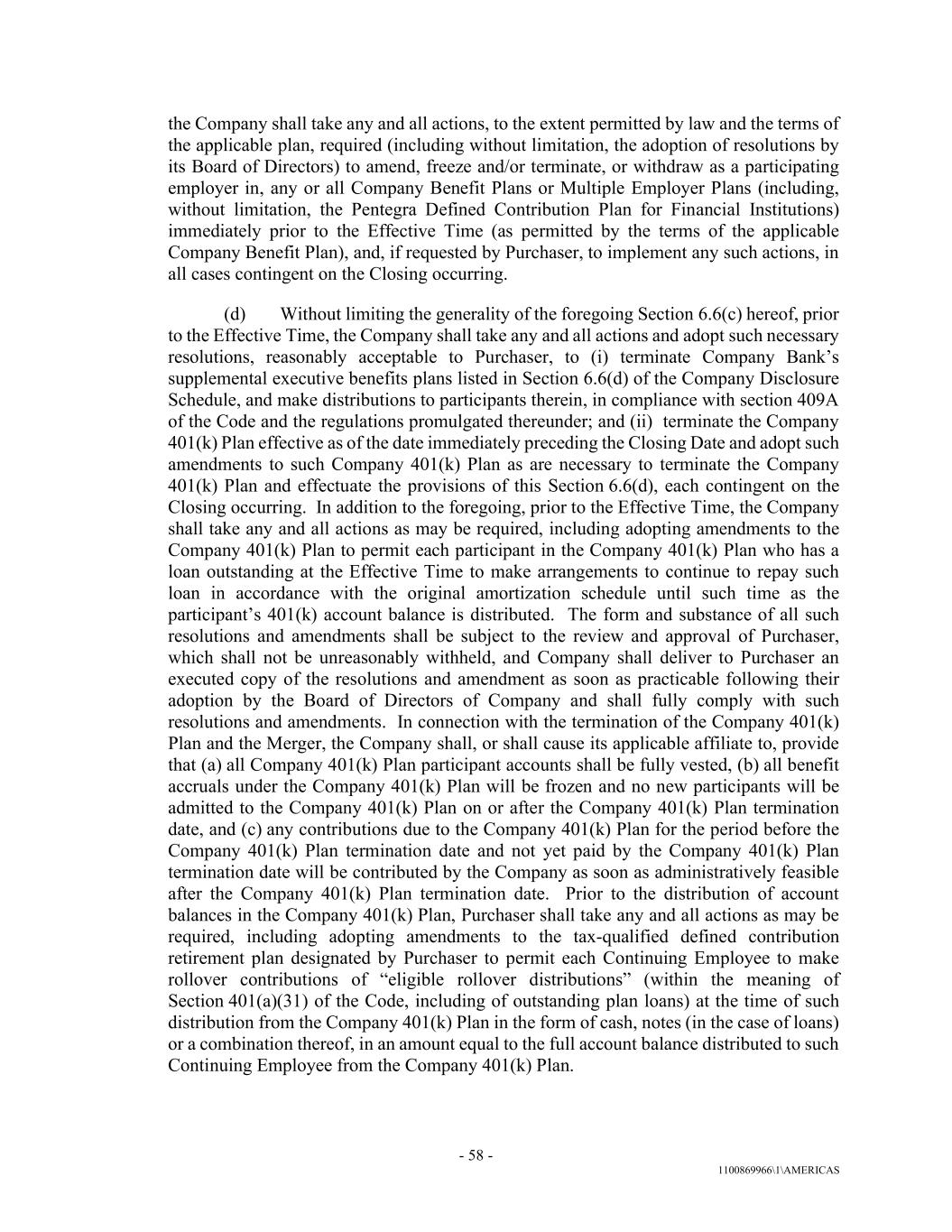 - 58 - 1100869966\1\AMERICAS the Company shall take any and all actions, to the extent permitted by law and the terms of the applicable plan, required (including without limitation, the adoption of resolutions by its Board of Directors) to amend, freeze and/or terminate, or withdraw as a participating employer in, any or all Company Benefit Plans or Multiple Employer Plans (including, without limitation, the Pentegra Defined Contribution Plan for Financial Institutions) immediately prior to the Effective Time (as permitted by the terms of the applicable Company Benefit Plan), and, if requested by Purchaser, to implement any such actions, in all cases contingent on the Closing occurring. (d) Without limiting the generality of the foregoing Section 6.6(c) hereof, prior to the Effective Time, the Company shall take any and all actions and adopt such necessary resolutions, reasonably acceptable to Purchaser, to (i) terminate Company Bank’s supplemental executive benefits plans listed in Section 6.6(d) of the Company Disclosure Schedule, and make distributions to participants therein, in compliance with section 409A of the Code and the regulations promulgated thereunder; and (ii) terminate the Company 401(k) Plan effective as of the date immediately preceding the Closing Date and adopt such amendments to such Company 401(k) Plan as are necessary to terminate the Company 401(k) Plan and effectuate the provisions of this Section 6.6(d), each contingent on the Closing occurring. In addition to the foregoing, prior to the Effective Time, the Company shall take any and all actions as may be required, including adopting amendments to the Company 401(k) Plan to permit each participant in the Company 401(k) Plan who has a loan outstanding at the Effective Time to make arrangements to continue to repay such loan in accordance with the original amortization schedule until such time as the participant’s 401(k) account balance is distributed. The form and substance of all such resolutions and amendments shall be subject to the review and approval of Purchaser, which shall not be unreasonably withheld, and Company shall deliver to Purchaser an executed copy of the resolutions and amendment as soon as practicable following their adoption by the Board of Directors of Company and shall fully comply with such resolutions and amendments. In connection with the termination of the Company 401(k) Plan and the Merger, the Company shall, or shall cause its applicable affiliate to, provide that (a) all Company 401(k) Plan participant accounts shall be fully vested, (b) all benefit accruals under the Company 401(k) Plan will be frozen and no new participants will be admitted to the Company 401(k) Plan on or after the Company 401(k) Plan termination date, and (c) any contributions due to the Company 401(k) Plan for the period before the Company 401(k) Plan termination date and not yet paid by the Company 401(k) Plan termination date will be contributed by the Company as soon as administratively feasible after the Company 401(k) Plan termination date. Prior to the distribution of account balances in the Company 401(k) Plan, Purchaser shall take any and all actions as may be required, including adopting amendments to the tax-qualified defined contribution retirement plan designated by Purchaser to permit each Continuing Employee to make rollover contributions of “eligible rollover distributions” (within the meaning of Section 401(a)(31) of the Code, including of outstanding plan loans) at the time of such distribution from the Company 401(k) Plan in the form of cash, notes (in the case of loans) or a combination thereof, in an amount equal to the full account balance distributed to such Continuing Employee from the Company 401(k) Plan.