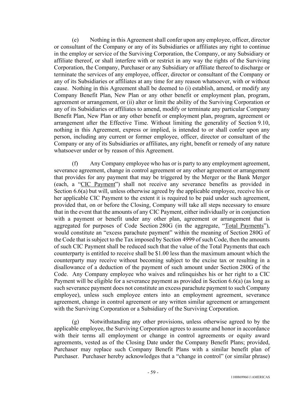 - 59 - 1100869966\1\AMERICAS (e) Nothing in this Agreement shall confer upon any employee, officer, director or consultant of the Company or any of its Subsidiaries or affiliates any right to continue in the employ or service of the Surviving Corporation, the Company, or any Subsidiary or affiliate thereof, or shall interfere with or restrict in any way the rights of the Surviving Corporation, the Company, Purchaser or any Subsidiary or affiliate thereof to discharge or terminate the services of any employee, officer, director or consultant of the Company or any of its Subsidiaries or affiliates at any time for any reason whatsoever, with or without cause. Nothing in this Agreement shall be deemed to (i) establish, amend, or modify any Company Benefit Plan, New Plan or any other benefit or employment plan, program, agreement or arrangement, or (ii) alter or limit the ability of the Surviving Corporation or any of its Subsidiaries or affiliates to amend, modify or terminate any particular Company Benefit Plan, New Plan or any other benefit or employment plan, program, agreement or arrangement after the Effective Time. Without limiting the generality of Section 9.10, nothing in this Agreement, express or implied, is intended to or shall confer upon any person, including any current or former employee, officer, director or consultant of the Company or any of its Subsidiaries or affiliates, any right, benefit or remedy of any nature whatsoever under or by reason of this Agreement. (f) Any Company employee who has or is party to any employment agreement, severance agreement, change in control agreement or any other agreement or arrangement that provides for any payment that may be triggered by the Merger or the Bank Merger (each, a “CIC Payment”) shall not receive any severance benefits as provided in Section 6.6(a) but will, unless otherwise agreed by the applicable employee, receive his or her applicable CIC Payment to the extent it is required to be paid under such agreement, provided that, on or before the Closing, Company will take all steps necessary to ensure that in the event that the amounts of any CIC Payment, either individually or in conjunction with a payment or benefit under any other plan, agreement or arrangement that is aggregated for purposes of Code Section 280G (in the aggregate, “Total Payments”), would constitute an “excess parachute payment” within the meaning of Section 280G of the Code that is subject to the Tax imposed by Section 4999 of such Code, then the amounts of such CIC Payment shall be reduced such that the value of the Total Payments that each counterparty is entitled to receive shall be $1.00 less than the maximum amount which the counterparty may receive without becoming subject to the excise tax or resulting in a disallowance of a deduction of the payment of such amount under Section 280G of the Code. Any Company employee who waives and relinquishes his or her right to a CIC Payment will be eligible for a severance payment as provided in Section 6.6(a) (as long as such severance payment does not constitute an excess parachute payment to such Company employee), unless such employee enters into an employment agreement, severance agreement, change in control agreement or any written similar agreement or arrangement with the Surviving Corporation or a Subsidiary of the Surviving Corporation. (g) Notwithstanding any other provisions, unless otherwise agreed to by the applicable employee, the Surviving Corporation agrees to assume and honor in accordance with their terms all employment or change in control agreements or equity award agreements, vested as of the Closing Date under the Company Benefit Plans; provided, Purchaser may replace such Company Benefit Plans with a similar benefit plan of Purchaser. Purchaser hereby acknowledges that a “change in control” (or similar phrase)