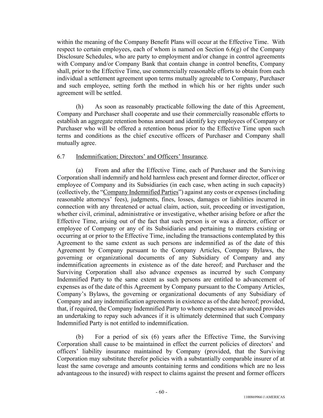 - 60 - 1100869966\1\AMERICAS within the meaning of the Company Benefit Plans will occur at the Effective Time. With respect to certain employees, each of whom is named on Section 6.6(g) of the Company Disclosure Schedules, who are party to employment and/or change in control agreements with Company and/or Company Bank that contain change in control benefits, Company shall, prior to the Effective Time, use commercially reasonable efforts to obtain from each individual a settlement agreement upon terms mutually agreeable to Company, Purchaser and such employee, setting forth the method in which his or her rights under such agreement will be settled. (h) As soon as reasonably practicable following the date of this Agreement, Company and Purchaser shall cooperate and use their commercially reasonable efforts to establish an aggregate retention bonus amount and identify key employees of Company or Purchaser who will be offered a retention bonus prior to the Effective Time upon such terms and conditions as the chief executive officers of Purchaser and Company shall mutually agree. 6.7 Indemnification; Directors’ and Officers’ Insurance. (a) From and after the Effective Time, each of Purchaser and the Surviving Corporation shall indemnify and hold harmless each present and former director, officer or employee of Company and its Subsidiaries (in each case, when acting in such capacity) (collectively, the “Company Indemnified Parties”) against any costs or expenses (including reasonable attorneys’ fees), judgments, fines, losses, damages or liabilities incurred in connection with any threatened or actual claim, action, suit, proceeding or investigation, whether civil, criminal, administrative or investigative, whether arising before or after the Effective Time, arising out of the fact that such person is or was a director, officer or employee of Company or any of its Subsidiaries and pertaining to matters existing or occurring at or prior to the Effective Time, including the transactions contemplated by this Agreement to the same extent as such persons are indemnified as of the date of this Agreement by Company pursuant to the Company Articles, Company Bylaws, the governing or organizational documents of any Subsidiary of Company and any indemnification agreements in existence as of the date hereof; and Purchaser and the Surviving Corporation shall also advance expenses as incurred by such Company Indemnified Party to the same extent as such persons are entitled to advancement of expenses as of the date of this Agreement by Company pursuant to the Company Articles, Company’s Bylaws, the governing or organizational documents of any Subsidiary of Company and any indemnification agreements in existence as of the date hereof; provided, that, if required, the Company Indemnified Party to whom expenses are advanced provides an undertaking to repay such advances if it is ultimately determined that such Company Indemnified Party is not entitled to indemnification. (b) For a period of six (6) years after the Effective Time, the Surviving Corporation shall cause to be maintained in effect the current policies of directors’ and officers’ liability insurance maintained by Company (provided, that the Surviving Corporation may substitute therefor policies with a substantially comparable insurer of at least the same coverage and amounts containing terms and conditions which are no less advantageous to the insured) with respect to claims against the present and former officers