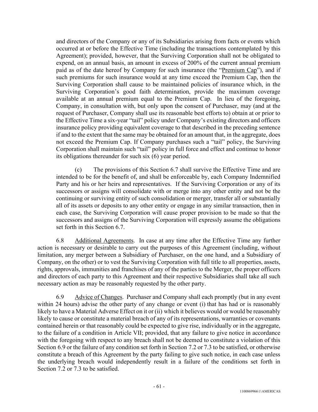 - 61 - 1100869966\1\AMERICAS and directors of the Company or any of its Subsidiaries arising from facts or events which occurred at or before the Effective Time (including the transactions contemplated by this Agreement); provided, however, that the Surviving Corporation shall not be obligated to expend, on an annual basis, an amount in excess of 200% of the current annual premium paid as of the date hereof by Company for such insurance (the “Premium Cap”), and if such premiums for such insurance would at any time exceed the Premium Cap, then the Surviving Corporation shall cause to be maintained policies of insurance which, in the Surviving Corporation’s good faith determination, provide the maximum coverage available at an annual premium equal to the Premium Cap. In lieu of the foregoing, Company, in consultation with, but only upon the consent of Purchaser, may (and at the request of Purchaser, Company shall use its reasonable best efforts to) obtain at or prior to the Effective Time a six-year “tail” policy under Company’s existing directors and officers insurance policy providing equivalent coverage to that described in the preceding sentence if and to the extent that the same may be obtained for an amount that, in the aggregate, does not exceed the Premium Cap. If Company purchases such a “tail” policy, the Surviving Corporation shall maintain such “tail” policy in full force and effect and continue to honor its obligations thereunder for such six (6) year period. (c) The provisions of this Section 6.7 shall survive the Effective Time and are intended to be for the benefit of, and shall be enforceable by, each Company Indemnified Party and his or her heirs and representatives. If the Surviving Corporation or any of its successors or assigns will consolidate with or merge into any other entity and not be the continuing or surviving entity of such consolidation or merger, transfer all or substantially all of its assets or deposits to any other entity or engage in any similar transaction, then in each case, the Surviving Corporation will cause proper provision to be made so that the successors and assigns of the Surviving Corporation will expressly assume the obligations set forth in this Section 6.7. 6.8 Additional Agreements. In case at any time after the Effective Time any further action is necessary or desirable to carry out the purposes of this Agreement (including, without limitation, any merger between a Subsidiary of Purchaser, on the one hand, and a Subsidiary of Company, on the other) or to vest the Surviving Corporation with full title to all properties, assets, rights, approvals, immunities and franchises of any of the parties to the Merger, the proper officers and directors of each party to this Agreement and their respective Subsidiaries shall take all such necessary action as may be reasonably requested by the other party. 6.9 Advice of Changes. Purchaser and Company shall each promptly (but in any event within 24 hours) advise the other party of any change or event (i) that has had or is reasonably likely to have a Material Adverse Effect on it or (ii) which it believes would or would be reasonably likely to cause or constitute a material breach of any of its representations, warranties or covenants contained herein or that reasonably could be expected to give rise, individually or in the aggregate, to the failure of a condition in Article VII; provided, that any failure to give notice in accordance with the foregoing with respect to any breach shall not be deemed to constitute a violation of this Section 6.9 or the failure of any condition set forth in Section 7.2 or 7.3 to be satisfied, or otherwise constitute a breach of this Agreement by the party failing to give such notice, in each case unless the underlying breach would independently result in a failure of the conditions set forth in Section 7.2 or 7.3 to be satisfied.