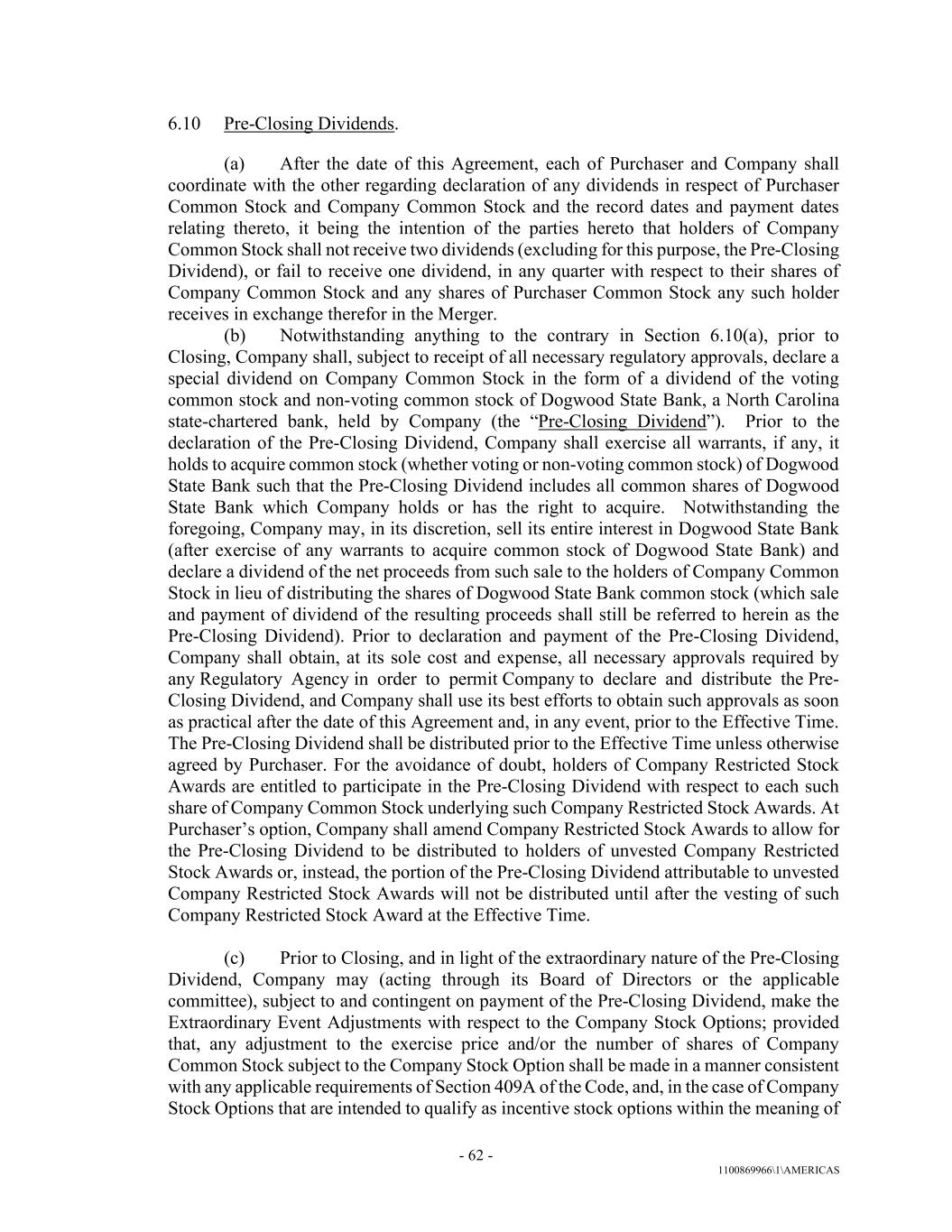 - 62 - 1100869966\1\AMERICAS 6.10 Pre-Closing Dividends. (a) After the date of this Agreement, each of Purchaser and Company shall coordinate with the other regarding declaration of any dividends in respect of Purchaser Common Stock and Company Common Stock and the record dates and payment dates relating thereto, it being the intention of the parties hereto that holders of Company Common Stock shall not receive two dividends (excluding for this purpose, the Pre-Closing Dividend), or fail to receive one dividend, in any quarter with respect to their shares of Company Common Stock and any shares of Purchaser Common Stock any such holder receives in exchange therefor in the Merger. (b) Notwithstanding anything to the contrary in Section 6.10(a), prior to Closing, Company shall, subject to receipt of all necessary regulatory approvals, declare a special dividend on Company Common Stock in the form of a dividend of the voting common stock and non-voting common stock of Dogwood State Bank, a North Carolina state-chartered bank, held by Company (the “Pre-Closing Dividend”). Prior to the declaration of the Pre-Closing Dividend, Company shall exercise all warrants, if any, it holds to acquire common stock (whether voting or non-voting common stock) of Dogwood State Bank such that the Pre-Closing Dividend includes all common shares of Dogwood State Bank which Company holds or has the right to acquire. Notwithstanding the foregoing, Company may, in its discretion, sell its entire interest in Dogwood State Bank (after exercise of any warrants to acquire common stock of Dogwood State Bank) and declare a dividend of the net proceeds from such sale to the holders of Company Common Stock in lieu of distributing the shares of Dogwood State Bank common stock (which sale and payment of dividend of the resulting proceeds shall still be referred to herein as the Pre-Closing Dividend). Prior to declaration and payment of the Pre-Closing Dividend, Company shall obtain, at its sole cost and expense, all necessary approvals required by any Regulatory Agency in order to permit Company to declare and distribute the Pre- Closing Dividend, and Company shall use its best efforts to obtain such approvals as soon as practical after the date of this Agreement and, in any event, prior to the Effective Time. The Pre-Closing Dividend shall be distributed prior to the Effective Time unless otherwise agreed by Purchaser. For the avoidance of doubt, holders of Company Restricted Stock Awards are entitled to participate in the Pre-Closing Dividend with respect to each such share of Company Common Stock underlying such Company Restricted Stock Awards. At Purchaser’s option, Company shall amend Company Restricted Stock Awards to allow for the Pre-Closing Dividend to be distributed to holders of unvested Company Restricted Stock Awards or, instead, the portion of the Pre-Closing Dividend attributable to unvested Company Restricted Stock Awards will not be distributed until after the vesting of such Company Restricted Stock Award at the Effective Time. (c) Prior to Closing, and in light of the extraordinary nature of the Pre-Closing Dividend, Company may (acting through its Board of Directors or the applicable committee), subject to and contingent on payment of the Pre-Closing Dividend, make the Extraordinary Event Adjustments with respect to the Company Stock Options; provided that, any adjustment to the exercise price and/or the number of shares of Company Common Stock subject to the Company Stock Option shall be made in a manner consistent with any applicable requirements of Section 409A of the Code, and, in the case of Company Stock Options that are intended to qualify as incentive stock options within the meaning of