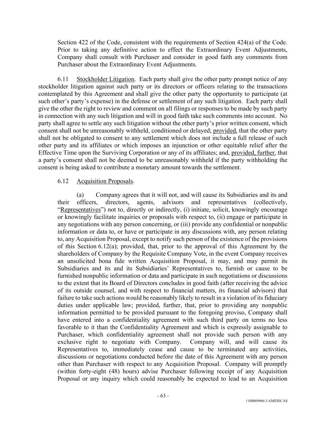 - 63 - 1100869966\1\AMERICAS Section 422 of the Code, consistent with the requirements of Section 424(a) of the Code. Prior to taking any definitive action to effect the Extraordinary Event Adjustments, Company shall consult with Purchaser and consider in good faith any comments from Purchaser about the Extraordinary Event Adjustments. 6.11 Stockholder Litigation. Each party shall give the other party prompt notice of any stockholder litigation against such party or its directors or officers relating to the transactions contemplated by this Agreement and shall give the other party the opportunity to participate (at such other’s party’s expense) in the defense or settlement of any such litigation. Each party shall give the other the right to review and comment on all filings or responses to be made by such party in connection with any such litigation and will in good faith take such comments into account. No party shall agree to settle any such litigation without the other party’s prior written consent, which consent shall not be unreasonably withheld, conditioned or delayed; provided, that the other party shall not be obligated to consent to any settlement which does not include a full release of such other party and its affiliates or which imposes an injunction or other equitable relief after the Effective Time upon the Surviving Corporation or any of its affiliates; and, provided, further, that a party’s consent shall not be deemed to be unreasonably withheld if the party withholding the consent is being asked to contribute a monetary amount towards the settlement. 6.12 Acquisition Proposals. (a) Company agrees that it will not, and will cause its Subsidiaries and its and their officers, directors, agents, advisors and representatives (collectively, “Representatives”) not to, directly or indirectly, (i) initiate, solicit, knowingly encourage or knowingly facilitate inquiries or proposals with respect to, (ii) engage or participate in any negotiations with any person concerning, or (iii) provide any confidential or nonpublic information or data to, or have or participate in any discussions with, any person relating to, any Acquisition Proposal, except to notify such person of the existence of the provisions of this Section 6.12(a); provided, that, prior to the approval of this Agreement by the shareholders of Company by the Requisite Company Vote, in the event Company receives an unsolicited bona fide written Acquisition Proposal, it may, and may permit its Subsidiaries and its and its Subsidiaries’ Representatives to, furnish or cause to be furnished nonpublic information or data and participate in such negotiations or discussions to the extent that its Board of Directors concludes in good faith (after receiving the advice of its outside counsel, and with respect to financial matters, its financial advisors) that failure to take such actions would be reasonably likely to result in a violation of its fiduciary duties under applicable law; provided, further, that, prior to providing any nonpublic information permitted to be provided pursuant to the foregoing proviso, Company shall have entered into a confidentiality agreement with such third party on terms no less favorable to it than the Confidentiality Agreement and which is expressly assignable to Purchaser, which confidentiality agreement shall not provide such person with any exclusive right to negotiate with Company. Company will, and will cause its Representatives to, immediately cease and cause to be terminated any activities, discussions or negotiations conducted before the date of this Agreement with any person other than Purchaser with respect to any Acquisition Proposal. Company will promptly (within forty-eight (48) hours) advise Purchaser following receipt of any Acquisition Proposal or any inquiry which could reasonably be expected to lead to an Acquisition
