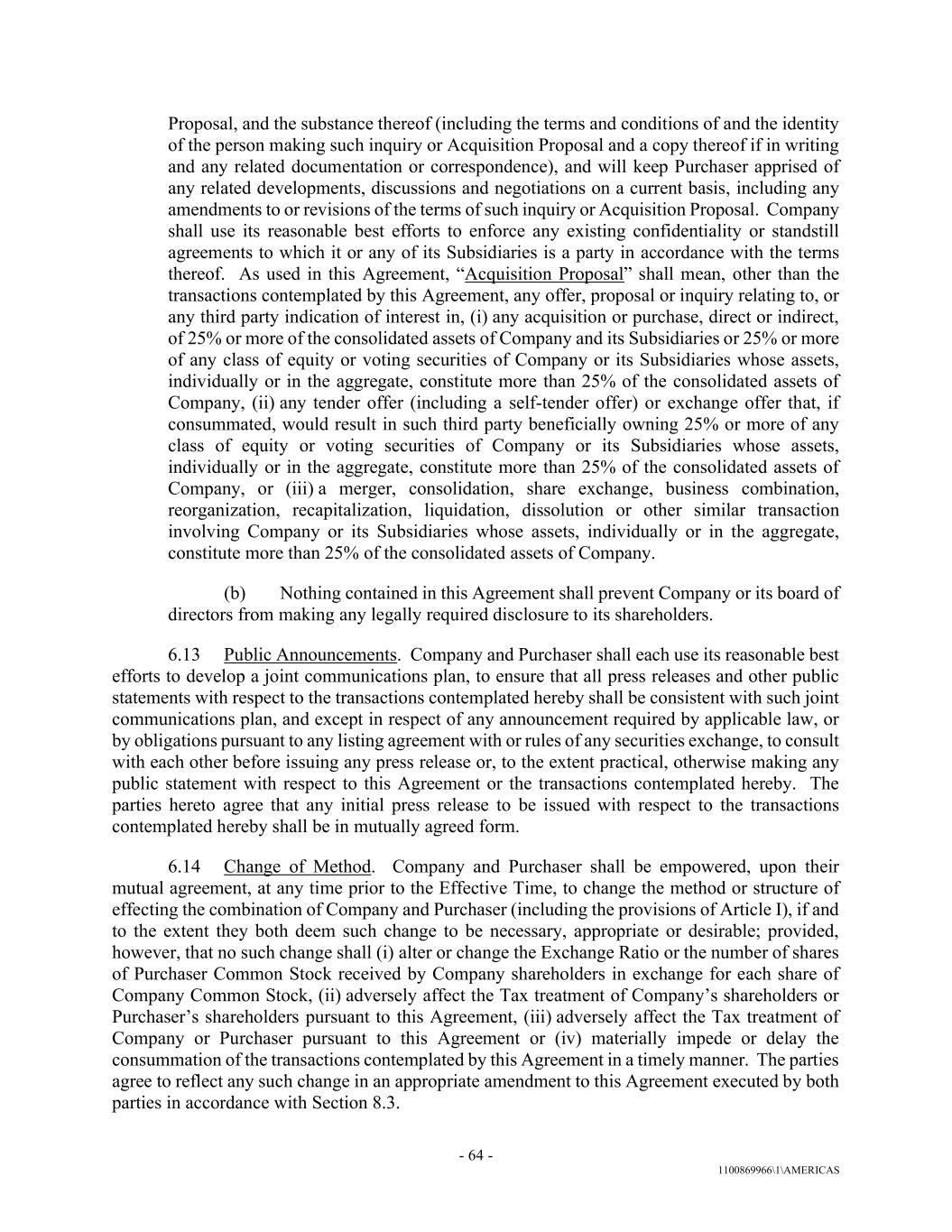 - 64 - 1100869966\1\AMERICAS Proposal, and the substance thereof (including the terms and conditions of and the identity of the person making such inquiry or Acquisition Proposal and a copy thereof if in writing and any related documentation or correspondence), and will keep Purchaser apprised of any related developments, discussions and negotiations on a current basis, including any amendments to or revisions of the terms of such inquiry or Acquisition Proposal. Company shall use its reasonable best efforts to enforce any existing confidentiality or standstill agreements to which it or any of its Subsidiaries is a party in accordance with the terms thereof. As used in this Agreement, “Acquisition Proposal” shall mean, other than the transactions contemplated by this Agreement, any offer, proposal or inquiry relating to, or any third party indication of interest in, (i) any acquisition or purchase, direct or indirect, of 25% or more of the consolidated assets of Company and its Subsidiaries or 25% or more of any class of equity or voting securities of Company or its Subsidiaries whose assets, individually or in the aggregate, constitute more than 25% of the consolidated assets of Company, (ii) any tender offer (including a self-tender offer) or exchange offer that, if consummated, would result in such third party beneficially owning 25% or more of any class of equity or voting securities of Company or its Subsidiaries whose assets, individually or in the aggregate, constitute more than 25% of the consolidated assets of Company, or (iii) a merger, consolidation, share exchange, business combination, reorganization, recapitalization, liquidation, dissolution or other similar transaction involving Company or its Subsidiaries whose assets, individually or in the aggregate, constitute more than 25% of the consolidated assets of Company. (b) Nothing contained in this Agreement shall prevent Company or its board of directors from making any legally required disclosure to its shareholders. 6.13 Public Announcements. Company and Purchaser shall each use its reasonable best efforts to develop a joint communications plan, to ensure that all press releases and other public statements with respect to the transactions contemplated hereby shall be consistent with such joint communications plan, and except in respect of any announcement required by applicable law, or by obligations pursuant to any listing agreement with or rules of any securities exchange, to consult with each other before issuing any press release or, to the extent practical, otherwise making any public statement with respect to this Agreement or the transactions contemplated hereby. The parties hereto agree that any initial press release to be issued with respect to the transactions contemplated hereby shall be in mutually agreed form. 6.14 Change of Method. Company and Purchaser shall be empowered, upon their mutual agreement, at any time prior to the Effective Time, to change the method or structure of effecting the combination of Company and Purchaser (including the provisions of Article I), if and to the extent they both deem such change to be necessary, appropriate or desirable; provided, however, that no such change shall (i) alter or change the Exchange Ratio or the number of shares of Purchaser Common Stock received by Company shareholders in exchange for each share of Company Common Stock, (ii) adversely affect the Tax treatment of Company’s shareholders or Purchaser’s shareholders pursuant to this Agreement, (iii) adversely affect the Tax treatment of Company or Purchaser pursuant to this Agreement or (iv) materially impede or delay the consummation of the transactions contemplated by this Agreement in a timely manner. The parties agree to reflect any such change in an appropriate amendment to this Agreement executed by both parties in accordance with Section 8.3.
