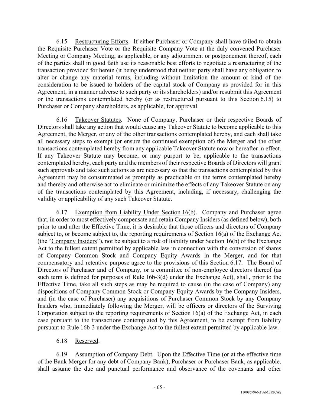 - 65 - 1100869966\1\AMERICAS 6.15 Restructuring Efforts. If either Purchaser or Company shall have failed to obtain the Requisite Purchaser Vote or the Requisite Company Vote at the duly convened Purchaser Meeting or Company Meeting, as applicable, or any adjournment or postponement thereof, each of the parties shall in good faith use its reasonable best efforts to negotiate a restructuring of the transaction provided for herein (it being understood that neither party shall have any obligation to alter or change any material terms, including without limitation the amount or kind of the consideration to be issued to holders of the capital stock of Company as provided for in this Agreement, in a manner adverse to such party or its shareholders) and/or resubmit this Agreement or the transactions contemplated hereby (or as restructured pursuant to this Section 6.15) to Purchaser or Company shareholders, as applicable, for approval. 6.16 Takeover Statutes. None of Company, Purchaser or their respective Boards of Directors shall take any action that would cause any Takeover Statute to become applicable to this Agreement, the Merger, or any of the other transactions contemplated hereby, and each shall take all necessary steps to exempt (or ensure the continued exemption of) the Merger and the other transactions contemplated hereby from any applicable Takeover Statute now or hereafter in effect. If any Takeover Statute may become, or may purport to be, applicable to the transactions contemplated hereby, each party and the members of their respective Boards of Directors will grant such approvals and take such actions as are necessary so that the transactions contemplated by this Agreement may be consummated as promptly as practicable on the terms contemplated hereby and thereby and otherwise act to eliminate or minimize the effects of any Takeover Statute on any of the transactions contemplated by this Agreement, including, if necessary, challenging the validity or applicability of any such Takeover Statute. 6.17 Exemption from Liability Under Section 16(b). Company and Purchaser agree that, in order to most effectively compensate and retain Company Insiders (as defined below), both prior to and after the Effective Time, it is desirable that those officers and directors of Company subject to, or become subject to, the reporting requirements of Section 16(a) of the Exchange Act (the “Company Insiders”), not be subject to a risk of liability under Section 16(b) of the Exchange Act to the fullest extent permitted by applicable law in connection with the conversion of shares of Company Common Stock and Company Equity Awards in the Merger, and for that compensatory and retentive purpose agree to the provisions of this Section 6.17. The Board of Directors of Purchaser and of Company, or a committee of non-employee directors thereof (as such term is defined for purposes of Rule 16b-3(d) under the Exchange Act), shall, prior to the Effective Time, take all such steps as may be required to cause (in the case of Company) any dispositions of Company Common Stock or Company Equity Awards by the Company Insiders, and (in the case of Purchaser) any acquisitions of Purchaser Common Stock by any Company Insiders who, immediately following the Merger, will be officers or directors of the Surviving Corporation subject to the reporting requirements of Section 16(a) of the Exchange Act, in each case pursuant to the transactions contemplated by this Agreement, to be exempt from liability pursuant to Rule 16b-3 under the Exchange Act to the fullest extent permitted by applicable law. 6.18 Reserved. 6.19 Assumption of Company Debt. Upon the Effective Time (or at the effective time of the Bank Merger for any debt of Company Bank), Purchaser or Purchaser Bank, as applicable, shall assume the due and punctual performance and observance of the covenants and other