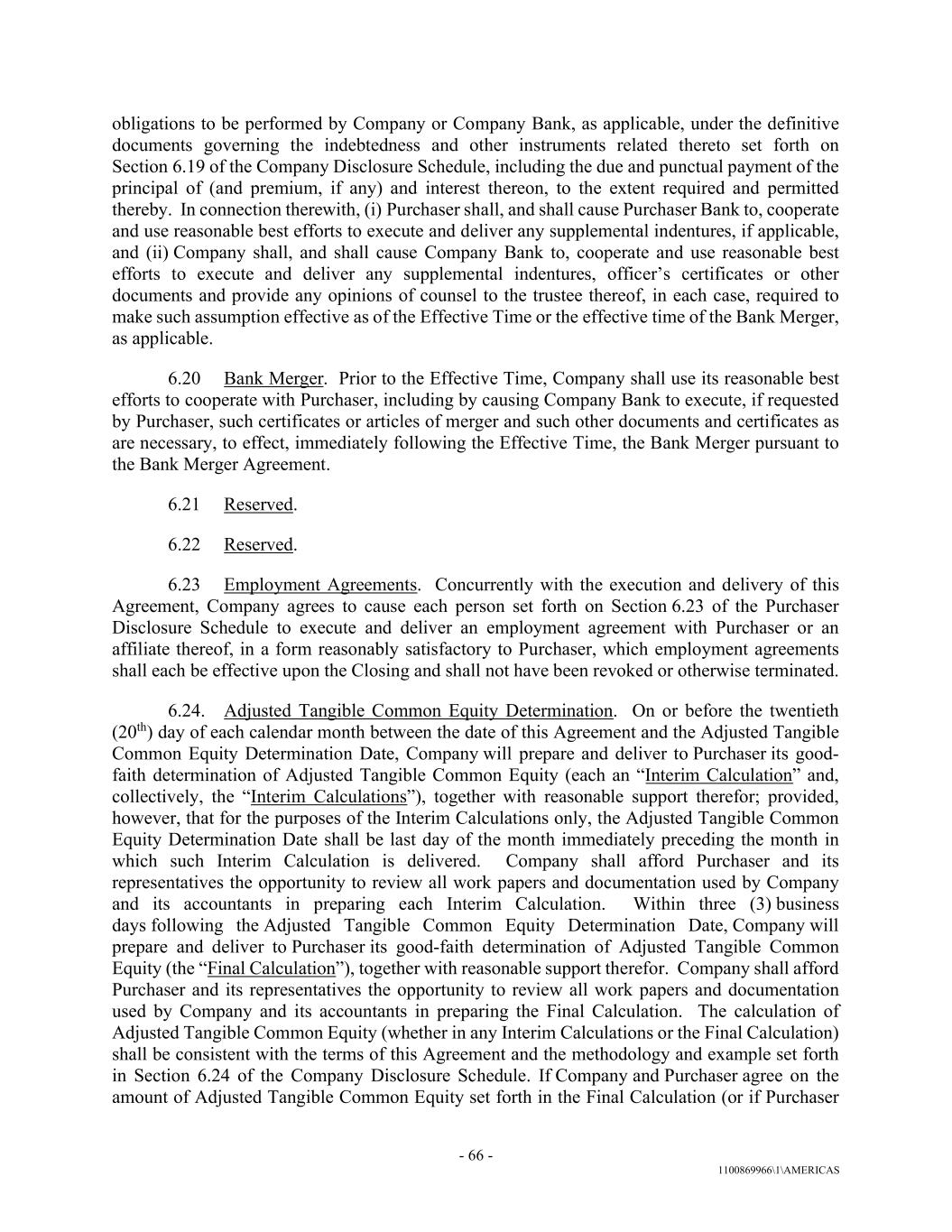 - 66 - 1100869966\1\AMERICAS obligations to be performed by Company or Company Bank, as applicable, under the definitive documents governing the indebtedness and other instruments related thereto set forth on Section 6.19 of the Company Disclosure Schedule, including the due and punctual payment of the principal of (and premium, if any) and interest thereon, to the extent required and permitted thereby. In connection therewith, (i) Purchaser shall, and shall cause Purchaser Bank to, cooperate and use reasonable best efforts to execute and deliver any supplemental indentures, if applicable, and (ii) Company shall, and shall cause Company Bank to, cooperate and use reasonable best efforts to execute and deliver any supplemental indentures, officer’s certificates or other documents and provide any opinions of counsel to the trustee thereof, in each case, required to make such assumption effective as of the Effective Time or the effective time of the Bank Merger, as applicable. 6.20 Bank Merger. Prior to the Effective Time, Company shall use its reasonable best efforts to cooperate with Purchaser, including by causing Company Bank to execute, if requested by Purchaser, such certificates or articles of merger and such other documents and certificates as are necessary, to effect, immediately following the Effective Time, the Bank Merger pursuant to the Bank Merger Agreement. 6.21 Reserved. 6.22 Reserved. 6.23 Employment Agreements. Concurrently with the execution and delivery of this Agreement, Company agrees to cause each person set forth on Section 6.23 of the Purchaser Disclosure Schedule to execute and deliver an employment agreement with Purchaser or an affiliate thereof, in a form reasonably satisfactory to Purchaser, which employment agreements shall each be effective upon the Closing and shall not have been revoked or otherwise terminated. 6.24. Adjusted Tangible Common Equity Determination. On or before the twentieth (20th) day of each calendar month between the date of this Agreement and the Adjusted Tangible Common Equity Determination Date, Company will prepare and deliver to Purchaser its good- faith determination of Adjusted Tangible Common Equity (each an “Interim Calculation” and, collectively, the “Interim Calculations”), together with reasonable support therefor; provided, however, that for the purposes of the Interim Calculations only, the Adjusted Tangible Common Equity Determination Date shall be last day of the month immediately preceding the month in which such Interim Calculation is delivered. Company shall afford Purchaser and its representatives the opportunity to review all work papers and documentation used by Company and its accountants in preparing each Interim Calculation. Within three (3) business days following the Adjusted Tangible Common Equity Determination Date, Company will prepare and deliver to Purchaser its good-faith determination of Adjusted Tangible Common Equity (the “Final Calculation”), together with reasonable support therefor. Company shall afford Purchaser and its representatives the opportunity to review all work papers and documentation used by Company and its accountants in preparing the Final Calculation. The calculation of Adjusted Tangible Common Equity (whether in any Interim Calculations or the Final Calculation) shall be consistent with the terms of this Agreement and the methodology and example set forth in Section 6.24 of the Company Disclosure Schedule. If Company and Purchaser agree on the amount of Adjusted Tangible Common Equity set forth in the Final Calculation (or if Purchaser