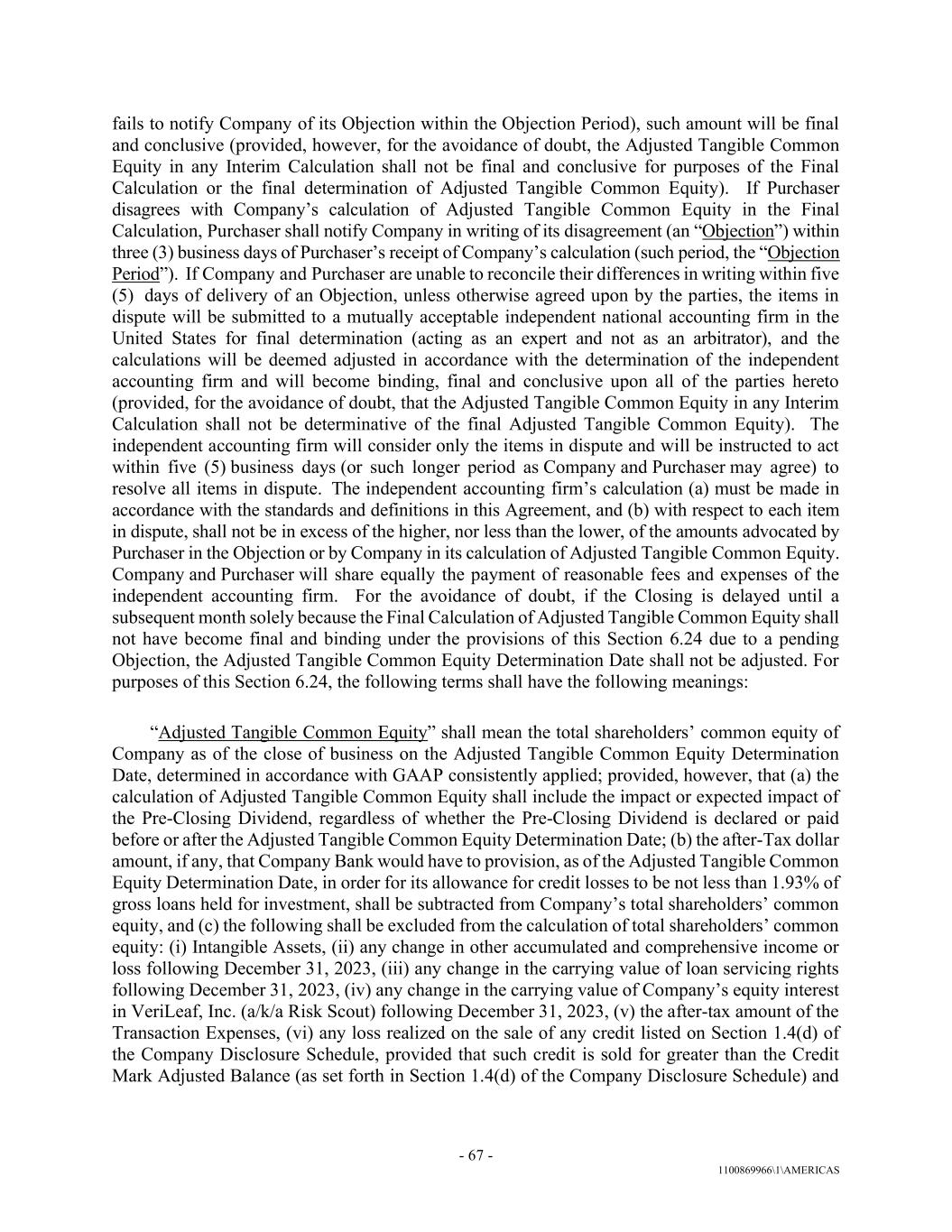 - 67 - 1100869966\1\AMERICAS fails to notify Company of its Objection within the Objection Period), such amount will be final and conclusive (provided, however, for the avoidance of doubt, the Adjusted Tangible Common Equity in any Interim Calculation shall not be final and conclusive for purposes of the Final Calculation or the final determination of Adjusted Tangible Common Equity). If Purchaser disagrees with Company’s calculation of Adjusted Tangible Common Equity in the Final Calculation, Purchaser shall notify Company in writing of its disagreement (an “Objection”) within three (3) business days of Purchaser’s receipt of Company’s calculation (such period, the “Objection Period”). If Company and Purchaser are unable to reconcile their differences in writing within five (5) days of delivery of an Objection, unless otherwise agreed upon by the parties, the items in dispute will be submitted to a mutually acceptable independent national accounting firm in the United States for final determination (acting as an expert and not as an arbitrator), and the calculations will be deemed adjusted in accordance with the determination of the independent accounting firm and will become binding, final and conclusive upon all of the parties hereto (provided, for the avoidance of doubt, that the Adjusted Tangible Common Equity in any Interim Calculation shall not be determinative of the final Adjusted Tangible Common Equity). The independent accounting firm will consider only the items in dispute and will be instructed to act within five (5) business days (or such longer period as Company and Purchaser may agree) to resolve all items in dispute. The independent accounting firm’s calculation (a) must be made in accordance with the standards and definitions in this Agreement, and (b) with respect to each item in dispute, shall not be in excess of the higher, nor less than the lower, of the amounts advocated by Purchaser in the Objection or by Company in its calculation of Adjusted Tangible Common Equity. Company and Purchaser will share equally the payment of reasonable fees and expenses of the independent accounting firm. For the avoidance of doubt, if the Closing is delayed until a subsequent month solely because the Final Calculation of Adjusted Tangible Common Equity shall not have become final and binding under the provisions of this Section 6.24 due to a pending Objection, the Adjusted Tangible Common Equity Determination Date shall not be adjusted. For purposes of this Section 6.24, the following terms shall have the following meanings: “Adjusted Tangible Common Equity” shall mean the total shareholders’ common equity of Company as of the close of business on the Adjusted Tangible Common Equity Determination Date, determined in accordance with GAAP consistently applied; provided, however, that (a) the calculation of Adjusted Tangible Common Equity shall include the impact or expected impact of the Pre-Closing Dividend, regardless of whether the Pre-Closing Dividend is declared or paid before or after the Adjusted Tangible Common Equity Determination Date; (b) the after-Tax dollar amount, if any, that Company Bank would have to provision, as of the Adjusted Tangible Common Equity Determination Date, in order for its allowance for credit losses to be not less than 1.93% of gross loans held for investment, shall be subtracted from Company’s total shareholders’ common equity, and (c) the following shall be excluded from the calculation of total shareholders’ common equity: (i) Intangible Assets, (ii) any change in other accumulated and comprehensive income or loss following December 31, 2023, (iii) any change in the carrying value of loan servicing rights following December 31, 2023, (iv) any change in the carrying value of Company’s equity interest in VeriLeaf, Inc. (a/k/a Risk Scout) following December 31, 2023, (v) the after-tax amount of the Transaction Expenses, (vi) any loss realized on the sale of any credit listed on Section 1.4(d) of the Company Disclosure Schedule, provided that such credit is sold for greater than the Credit Mark Adjusted Balance (as set forth in Section 1.4(d) of the Company Disclosure Schedule) and