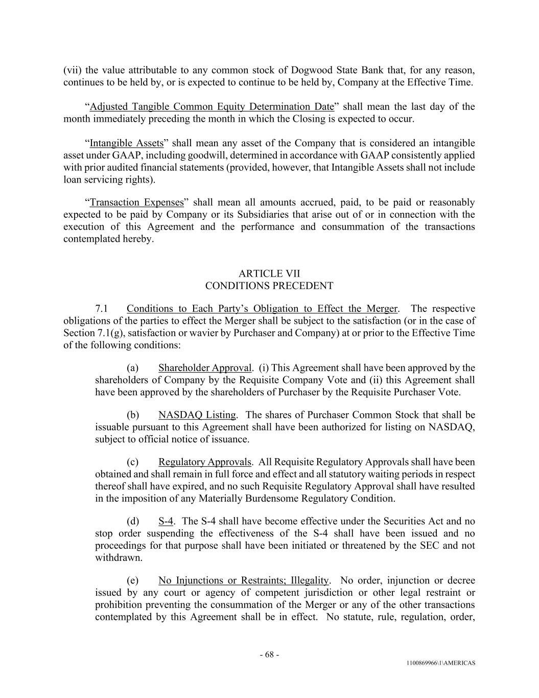 - 68 - 1100869966\1\AMERICAS (vii) the value attributable to any common stock of Dogwood State Bank that, for any reason, continues to be held by, or is expected to continue to be held by, Company at the Effective Time. “Adjusted Tangible Common Equity Determination Date” shall mean the last day of the month immediately preceding the month in which the Closing is expected to occur. “Intangible Assets” shall mean any asset of the Company that is considered an intangible asset under GAAP, including goodwill, determined in accordance with GAAP consistently applied with prior audited financial statements (provided, however, that Intangible Assets shall not include loan servicing rights). “Transaction Expenses” shall mean all amounts accrued, paid, to be paid or reasonably expected to be paid by Company or its Subsidiaries that arise out of or in connection with the execution of this Agreement and the performance and consummation of the transactions contemplated hereby. ARTICLE VII CONDITIONS PRECEDENT 7.1 Conditions to Each Party’s Obligation to Effect the Merger. The respective obligations of the parties to effect the Merger shall be subject to the satisfaction (or in the case of Section 7.1(g), satisfaction or wavier by Purchaser and Company) at or prior to the Effective Time of the following conditions: (a) Shareholder Approval. (i) This Agreement shall have been approved by the shareholders of Company by the Requisite Company Vote and (ii) this Agreement shall have been approved by the shareholders of Purchaser by the Requisite Purchaser Vote. (b) NASDAQ Listing. The shares of Purchaser Common Stock that shall be issuable pursuant to this Agreement shall have been authorized for listing on NASDAQ, subject to official notice of issuance. (c) Regulatory Approvals. All Requisite Regulatory Approvals shall have been obtained and shall remain in full force and effect and all statutory waiting periods in respect thereof shall have expired, and no such Requisite Regulatory Approval shall have resulted in the imposition of any Materially Burdensome Regulatory Condition. (d) S-4. The S-4 shall have become effective under the Securities Act and no stop order suspending the effectiveness of the S-4 shall have been issued and no proceedings for that purpose shall have been initiated or threatened by the SEC and not withdrawn. (e) No Injunctions or Restraints; Illegality. No order, injunction or decree issued by any court or agency of competent jurisdiction or other legal restraint or prohibition preventing the consummation of the Merger or any of the other transactions contemplated by this Agreement shall be in effect. No statute, rule, regulation, order,