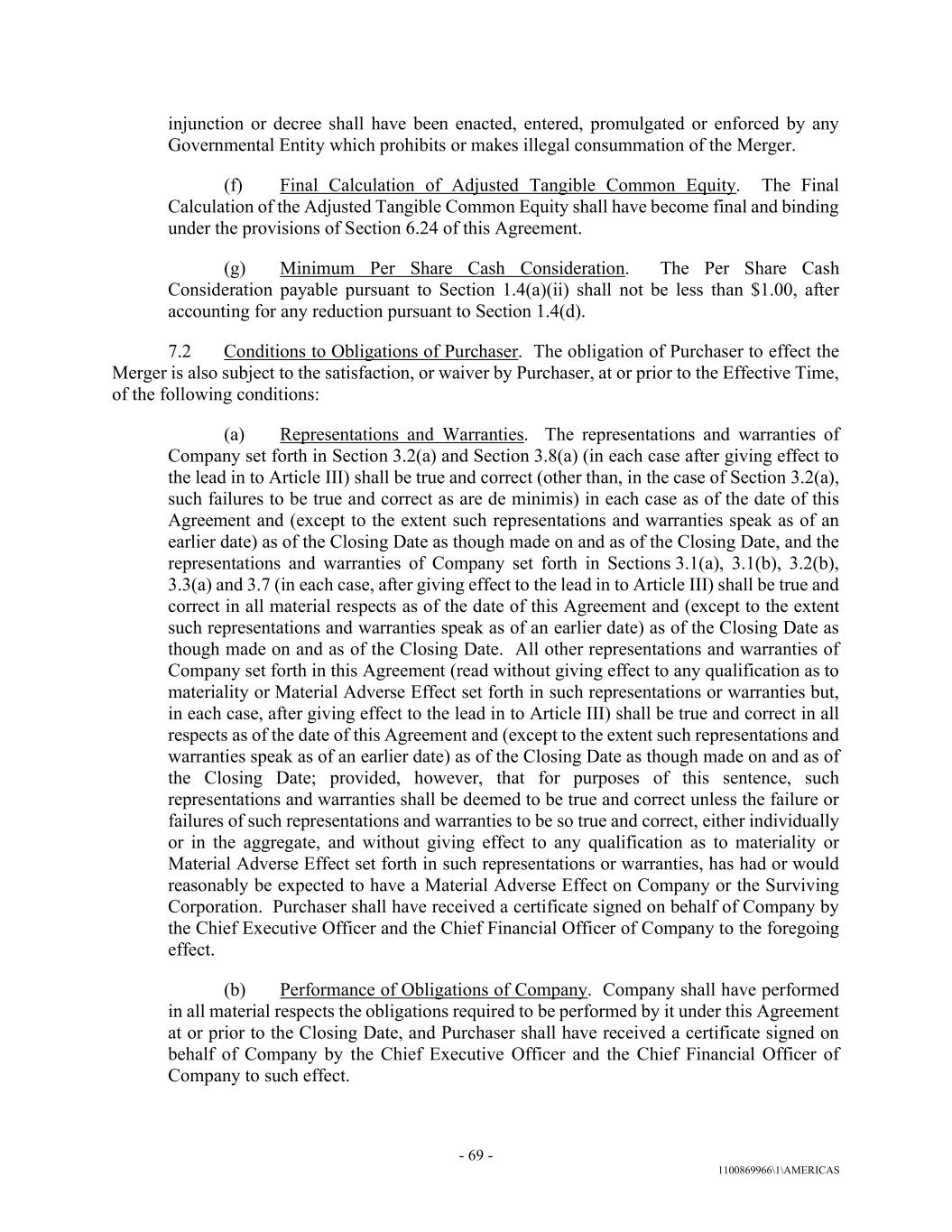 - 69 - 1100869966\1\AMERICAS injunction or decree shall have been enacted, entered, promulgated or enforced by any Governmental Entity which prohibits or makes illegal consummation of the Merger. (f) Final Calculation of Adjusted Tangible Common Equity. The Final Calculation of the Adjusted Tangible Common Equity shall have become final and binding under the provisions of Section 6.24 of this Agreement. (g) Minimum Per Share Cash Consideration. The Per Share Cash Consideration payable pursuant to Section 1.4(a)(ii) shall not be less than $1.00, after accounting for any reduction pursuant to Section 1.4(d). 7.2 Conditions to Obligations of Purchaser. The obligation of Purchaser to effect the Merger is also subject to the satisfaction, or waiver by Purchaser, at or prior to the Effective Time, of the following conditions: (a) Representations and Warranties. The representations and warranties of Company set forth in Section 3.2(a) and Section 3.8(a) (in each case after giving effect to the lead in to Article III) shall be true and correct (other than, in the case of Section 3.2(a), such failures to be true and correct as are de minimis) in each case as of the date of this Agreement and (except to the extent such representations and warranties speak as of an earlier date) as of the Closing Date as though made on and as of the Closing Date, and the representations and warranties of Company set forth in Sections 3.1(a), 3.1(b), 3.2(b), 3.3(a) and 3.7 (in each case, after giving effect to the lead in to Article III) shall be true and correct in all material respects as of the date of this Agreement and (except to the extent such representations and warranties speak as of an earlier date) as of the Closing Date as though made on and as of the Closing Date. All other representations and warranties of Company set forth in this Agreement (read without giving effect to any qualification as to materiality or Material Adverse Effect set forth in such representations or warranties but, in each case, after giving effect to the lead in to Article III) shall be true and correct in all respects as of the date of this Agreement and (except to the extent such representations and warranties speak as of an earlier date) as of the Closing Date as though made on and as of the Closing Date; provided, however, that for purposes of this sentence, such representations and warranties shall be deemed to be true and correct unless the failure or failures of such representations and warranties to be so true and correct, either individually or in the aggregate, and without giving effect to any qualification as to materiality or Material Adverse Effect set forth in such representations or warranties, has had or would reasonably be expected to have a Material Adverse Effect on Company or the Surviving Corporation. Purchaser shall have received a certificate signed on behalf of Company by the Chief Executive Officer and the Chief Financial Officer of Company to the foregoing effect. (b) Performance of Obligations of Company. Company shall have performed in all material respects the obligations required to be performed by it under this Agreement at or prior to the Closing Date, and Purchaser shall have received a certificate signed on behalf of Company by the Chief Executive Officer and the Chief Financial Officer of Company to such effect.