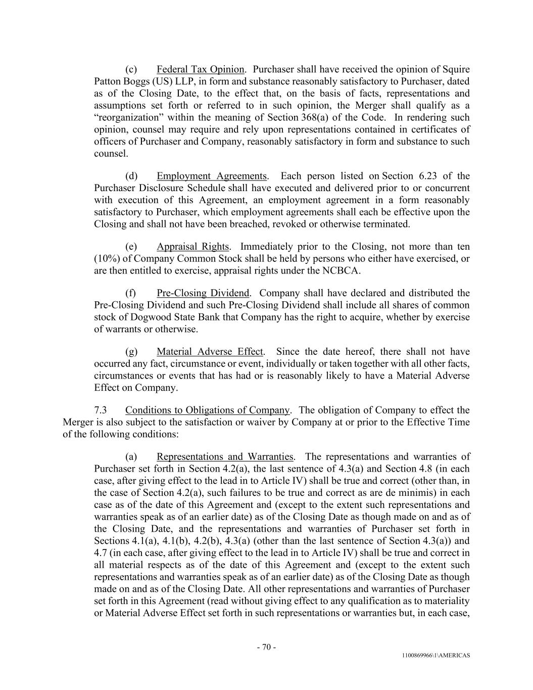 - 70 - 1100869966\1\AMERICAS (c) Federal Tax Opinion. Purchaser shall have received the opinion of Squire Patton Boggs (US) LLP, in form and substance reasonably satisfactory to Purchaser, dated as of the Closing Date, to the effect that, on the basis of facts, representations and assumptions set forth or referred to in such opinion, the Merger shall qualify as a “reorganization” within the meaning of Section 368(a) of the Code. In rendering such opinion, counsel may require and rely upon representations contained in certificates of officers of Purchaser and Company, reasonably satisfactory in form and substance to such counsel. (d) Employment Agreements. Each person listed on Section 6.23 of the Purchaser Disclosure Schedule shall have executed and delivered prior to or concurrent with execution of this Agreement, an employment agreement in a form reasonably satisfactory to Purchaser, which employment agreements shall each be effective upon the Closing and shall not have been breached, revoked or otherwise terminated. (e) Appraisal Rights. Immediately prior to the Closing, not more than ten (10%) of Company Common Stock shall be held by persons who either have exercised, or are then entitled to exercise, appraisal rights under the NCBCA. (f) Pre-Closing Dividend. Company shall have declared and distributed the Pre-Closing Dividend and such Pre-Closing Dividend shall include all shares of common stock of Dogwood State Bank that Company has the right to acquire, whether by exercise of warrants or otherwise. (g) Material Adverse Effect. Since the date hereof, there shall not have occurred any fact, circumstance or event, individually or taken together with all other facts, circumstances or events that has had or is reasonably likely to have a Material Adverse Effect on Company. 7.3 Conditions to Obligations of Company. The obligation of Company to effect the Merger is also subject to the satisfaction or waiver by Company at or prior to the Effective Time of the following conditions: (a) Representations and Warranties. The representations and warranties of Purchaser set forth in Section 4.2(a), the last sentence of 4.3(a) and Section 4.8 (in each case, after giving effect to the lead in to Article IV) shall be true and correct (other than, in the case of Section 4.2(a), such failures to be true and correct as are de minimis) in each case as of the date of this Agreement and (except to the extent such representations and warranties speak as of an earlier date) as of the Closing Date as though made on and as of the Closing Date, and the representations and warranties of Purchaser set forth in Sections 4.1(a), 4.1(b), 4.2(b), 4.3(a) (other than the last sentence of Section 4.3(a)) and 4.7 (in each case, after giving effect to the lead in to Article IV) shall be true and correct in all material respects as of the date of this Agreement and (except to the extent such representations and warranties speak as of an earlier date) as of the Closing Date as though made on and as of the Closing Date. All other representations and warranties of Purchaser set forth in this Agreement (read without giving effect to any qualification as to materiality or Material Adverse Effect set forth in such representations or warranties but, in each case,