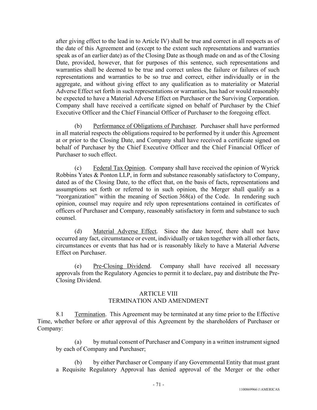 - 71 - 1100869966\1\AMERICAS after giving effect to the lead in to Article IV) shall be true and correct in all respects as of the date of this Agreement and (except to the extent such representations and warranties speak as of an earlier date) as of the Closing Date as though made on and as of the Closing Date, provided, however, that for purposes of this sentence, such representations and warranties shall be deemed to be true and correct unless the failure or failures of such representations and warranties to be so true and correct, either individually or in the aggregate, and without giving effect to any qualification as to materiality or Material Adverse Effect set forth in such representations or warranties, has had or would reasonably be expected to have a Material Adverse Effect on Purchaser or the Surviving Corporation. Company shall have received a certificate signed on behalf of Purchaser by the Chief Executive Officer and the Chief Financial Officer of Purchaser to the foregoing effect. (b) Performance of Obligations of Purchaser. Purchaser shall have performed in all material respects the obligations required to be performed by it under this Agreement at or prior to the Closing Date, and Company shall have received a certificate signed on behalf of Purchaser by the Chief Executive Officer and the Chief Financial Officer of Purchaser to such effect. (c) Federal Tax Opinion. Company shall have received the opinion of Wyrick Robbins Yates & Ponton LLP, in form and substance reasonably satisfactory to Company, dated as of the Closing Date, to the effect that, on the basis of facts, representations and assumptions set forth or referred to in such opinion, the Merger shall qualify as a “reorganization” within the meaning of Section 368(a) of the Code. In rendering such opinion, counsel may require and rely upon representations contained in certificates of officers of Purchaser and Company, reasonably satisfactory in form and substance to such counsel. (d) Material Adverse Effect. Since the date hereof, there shall not have occurred any fact, circumstance or event, individually or taken together with all other facts, circumstances or events that has had or is reasonably likely to have a Material Adverse Effect on Purchaser. (e) Pre-Closing Dividend. Company shall have received all necessary approvals from the Regulatory Agencies to permit it to declare, pay and distribute the Pre- Closing Dividend. ARTICLE VIII TERMINATION AND AMENDMENT 8.1 Termination. This Agreement may be terminated at any time prior to the Effective Time, whether before or after approval of this Agreement by the shareholders of Purchaser or Company: (a) by mutual consent of Purchaser and Company in a written instrument signed by each of Company and Purchaser; (b) by either Purchaser or Company if any Governmental Entity that must grant a Requisite Regulatory Approval has denied approval of the Merger or the other