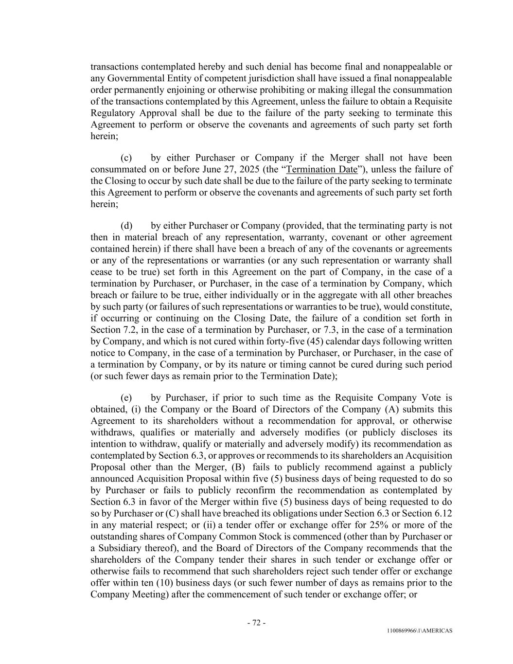 - 72 - 1100869966\1\AMERICAS transactions contemplated hereby and such denial has become final and nonappealable or any Governmental Entity of competent jurisdiction shall have issued a final nonappealable order permanently enjoining or otherwise prohibiting or making illegal the consummation of the transactions contemplated by this Agreement, unless the failure to obtain a Requisite Regulatory Approval shall be due to the failure of the party seeking to terminate this Agreement to perform or observe the covenants and agreements of such party set forth herein; (c) by either Purchaser or Company if the Merger shall not have been consummated on or before June 27, 2025 (the “Termination Date”), unless the failure of the Closing to occur by such date shall be due to the failure of the party seeking to terminate this Agreement to perform or observe the covenants and agreements of such party set forth herein; (d) by either Purchaser or Company (provided, that the terminating party is not then in material breach of any representation, warranty, covenant or other agreement contained herein) if there shall have been a breach of any of the covenants or agreements or any of the representations or warranties (or any such representation or warranty shall cease to be true) set forth in this Agreement on the part of Company, in the case of a termination by Purchaser, or Purchaser, in the case of a termination by Company, which breach or failure to be true, either individually or in the aggregate with all other breaches by such party (or failures of such representations or warranties to be true), would constitute, if occurring or continuing on the Closing Date, the failure of a condition set forth in Section 7.2, in the case of a termination by Purchaser, or 7.3, in the case of a termination by Company, and which is not cured within forty-five (45) calendar days following written notice to Company, in the case of a termination by Purchaser, or Purchaser, in the case of a termination by Company, or by its nature or timing cannot be cured during such period (or such fewer days as remain prior to the Termination Date); (e) by Purchaser, if prior to such time as the Requisite Company Vote is obtained, (i) the Company or the Board of Directors of the Company (A) submits this Agreement to its shareholders without a recommendation for approval, or otherwise withdraws, qualifies or materially and adversely modifies (or publicly discloses its intention to withdraw, qualify or materially and adversely modify) its recommendation as contemplated by Section 6.3, or approves or recommends to its shareholders an Acquisition Proposal other than the Merger, (B) fails to publicly recommend against a publicly announced Acquisition Proposal within five (5) business days of being requested to do so by Purchaser or fails to publicly reconfirm the recommendation as contemplated by Section 6.3 in favor of the Merger within five (5) business days of being requested to do so by Purchaser or (C) shall have breached its obligations under Section 6.3 or Section 6.12 in any material respect; or (ii) a tender offer or exchange offer for 25% or more of the outstanding shares of Company Common Stock is commenced (other than by Purchaser or a Subsidiary thereof), and the Board of Directors of the Company recommends that the shareholders of the Company tender their shares in such tender or exchange offer or otherwise fails to recommend that such shareholders reject such tender offer or exchange offer within ten (10) business days (or such fewer number of days as remains prior to the Company Meeting) after the commencement of such tender or exchange offer; or