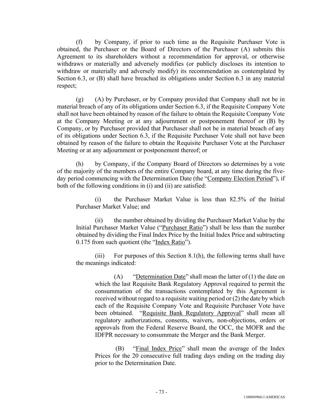 - 73 - 1100869966\1\AMERICAS (f) by Company, if prior to such time as the Requisite Purchaser Vote is obtained, the Purchaser or the Board of Directors of the Purchaser (A) submits this Agreement to its shareholders without a recommendation for approval, or otherwise withdraws or materially and adversely modifies (or publicly discloses its intention to withdraw or materially and adversely modify) its recommendation as contemplated by Section 6.3, or (B) shall have breached its obligations under Section 6.3 in any material respect; (g) (A) by Purchaser, or by Company provided that Company shall not be in material breach of any of its obligations under Section 6.3, if the Requisite Company Vote shall not have been obtained by reason of the failure to obtain the Requisite Company Vote at the Company Meeting or at any adjournment or postponement thereof or (B) by Company, or by Purchaser provided that Purchaser shall not be in material breach of any of its obligations under Section 6.3, if the Requisite Purchaser Vote shall not have been obtained by reason of the failure to obtain the Requisite Purchaser Vote at the Purchaser Meeting or at any adjournment or postponement thereof; or (h) by Company, if the Company Board of Directors so determines by a vote of the majority of the members of the entire Company board, at any time during the five- day period commencing with the Determination Date (the “Company Election Period”), if both of the following conditions in (i) and (ii) are satisfied: (i) the Purchaser Market Value is less than 82.5% of the Initial Purchaser Market Value; and (ii) the number obtained by dividing the Purchaser Market Value by the Initial Purchaser Market Value (“Purchaser Ratio”) shall be less than the number obtained by dividing the Final Index Price by the Initial Index Price and subtracting 0.175 from such quotient (the “Index Ratio”). (iii) For purposes of this Section 8.1(h), the following terms shall have the meanings indicated: (A) “Determination Date” shall mean the latter of (1) the date on which the last Requisite Bank Regulatory Approval required to permit the consummation of the transactions contemplated by this Agreement is received without regard to a requisite waiting period or (2) the date by which each of the Requisite Company Vote and Requisite Purchaser Vote have been obtained. “Requisite Bank Regulatory Approval” shall mean all regulatory authorizations, consents, waivers, non-objections, orders or approvals from the Federal Reserve Board, the OCC, the MOFR and the IDFPR necessary to consummate the Merger and the Bank Merger. (B) “Final Index Price” shall mean the average of the Index Prices for the 20 consecutive full trading days ending on the trading day prior to the Determination Date.