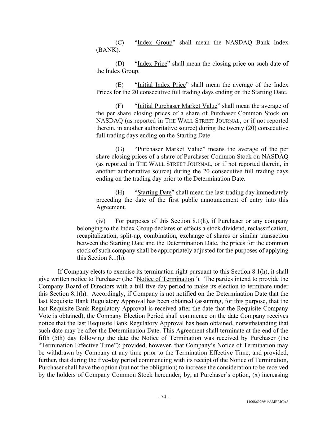 - 74 - 1100869966\1\AMERICAS (C) “Index Group” shall mean the NASDAQ Bank Index (BANK). (D) “Index Price” shall mean the closing price on such date of the Index Group. (E) “Initial Index Price” shall mean the average of the Index Prices for the 20 consecutive full trading days ending on the Starting Date. (F) “Initial Purchaser Market Value” shall mean the average of the per share closing prices of a share of Purchaser Common Stock on NASDAQ (as reported in THE WALL STREET JOURNAL, or if not reported therein, in another authoritative source) during the twenty (20) consecutive full trading days ending on the Starting Date. (G) “Purchaser Market Value” means the average of the per share closing prices of a share of Purchaser Common Stock on NASDAQ (as reported in THE WALL STREET JOURNAL, or if not reported therein, in another authoritative source) during the 20 consecutive full trading days ending on the trading day prior to the Determination Date. (H) “Starting Date” shall mean the last trading day immediately preceding the date of the first public announcement of entry into this Agreement. (iv) For purposes of this Section 8.1(h), if Purchaser or any company belonging to the Index Group declares or effects a stock dividend, reclassification, recapitalization, split-up, combination, exchange of shares or similar transaction between the Starting Date and the Determination Date, the prices for the common stock of such company shall be appropriately adjusted for the purposes of applying this Section 8.1(h). If Company elects to exercise its termination right pursuant to this Section 8.1(h), it shall give written notice to Purchaser (the “Notice of Termination”). The parties intend to provide the Company Board of Directors with a full five-day period to make its election to terminate under this Section 8.1(h). Accordingly, if Company is not notified on the Determination Date that the last Requisite Bank Regulatory Approval has been obtained (assuming, for this purpose, that the last Requisite Bank Regulatory Approval is received after the date that the Requisite Company Vote is obtained), the Company Election Period shall commence on the date Company receives notice that the last Requisite Bank Regulatory Approval has been obtained, notwithstanding that such date may be after the Determination Date. This Agreement shall terminate at the end of the fifth (5th) day following the date the Notice of Termination was received by Purchaser (the “Termination Effective Time”); provided, however, that Company’s Notice of Termination may be withdrawn by Company at any time prior to the Termination Effective Time; and provided, further, that during the five-day period commencing with its receipt of the Notice of Termination, Purchaser shall have the option (but not the obligation) to increase the consideration to be received by the holders of Company Common Stock hereunder, by, at Purchaser’s option, (x) increasing