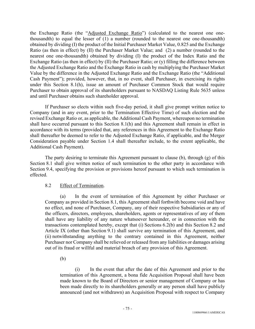 - 75 - 1100869966\1\AMERICAS the Exchange Ratio (the “Adjusted Exchange Ratio”) (calculated to the nearest one one- thousandth) to equal the lesser of (1) a number (rounded to the nearest one one-thousandth) obtained by dividing (I) the product of the Initial Purchaser Market Value, 0.825 and the Exchange Ratio (as then in effect) by (II) the Purchaser Market Value; and (2) a number (rounded to the nearest one one-thousandth) obtained by dividing (I) the product of the Index Ratio and the Exchange Ratio (as then in effect) by (II) the Purchaser Ratio; or (y) filling the difference between the Adjusted Exchange Ratio and the Exchange Ratio in cash by multiplying the Purchaser Market Value by the difference in the Adjusted Exchange Ratio and the Exchange Ratio (the “Additional Cash Payment”); provided, however, that, in no event, shall Purchaser, in exercising its rights under this Section 8.1(h), issue an amount of Purchaser Common Stock that would require Purchaser to obtain approval of its shareholders pursuant to NASDAQ Listing Rule 5635 unless and until Purchaser obtains such shareholder approval. If Purchaser so elects within such five-day period, it shall give prompt written notice to Company (and in any event, prior to the Termination Effective Time) of such election and the revised Exchange Ratio or, as applicable, the Additional Cash Payment, whereupon no termination shall have occurred pursuant to this Section 8.1(h) and this Agreement shall remain in effect in accordance with its terms (provided that, any references in this Agreement to the Exchange Ratio shall thereafter be deemed to refer to the Adjusted Exchange Ratio, if applicable, and the Merger Consideration payable under Section 1.4 shall thereafter include, to the extent applicable, the Additional Cash Payment). The party desiring to terminate this Agreement pursuant to clause (b), through (g) of this Section 8.1 shall give written notice of such termination to the other party in accordance with Section 9.4, specifying the provision or provisions hereof pursuant to which such termination is effected. 8.2 Effect of Termination. (a) In the event of termination of this Agreement by either Purchaser or Company as provided in Section 8.1, this Agreement shall forthwith become void and have no effect, and none of Purchaser, Company, any of their respective Subsidiaries or any of the officers, directors, employees, shareholders, agents or representatives of any of them shall have any liability of any nature whatsoever hereunder, or in connection with the transactions contemplated hereby, except that (i) Sections 6.2(b) and this Section 8.2 and Article IX (other than Section 9.1) shall survive any termination of this Agreement, and (ii) notwithstanding anything to the contrary contained in this Agreement, neither Purchaser nor Company shall be relieved or released from any liabilities or damages arising out of its fraud or willful and material breach of any provision of this Agreement. (b) (i) In the event that after the date of this Agreement and prior to the termination of this Agreement, a bona fide Acquisition Proposal shall have been made known to the Board of Directors or senior management of Company or has been made directly to its shareholders generally or any person shall have publicly announced (and not withdrawn) an Acquisition Proposal with respect to Company