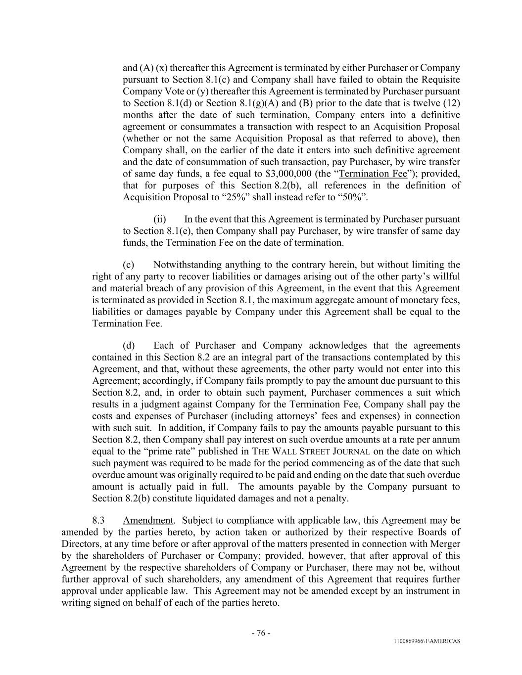 - 76 - 1100869966\1\AMERICAS and (A) (x) thereafter this Agreement is terminated by either Purchaser or Company pursuant to Section 8.1(c) and Company shall have failed to obtain the Requisite Company Vote or (y) thereafter this Agreement is terminated by Purchaser pursuant to Section 8.1(d) or Section 8.1(g)(A) and (B) prior to the date that is twelve (12) months after the date of such termination, Company enters into a definitive agreement or consummates a transaction with respect to an Acquisition Proposal (whether or not the same Acquisition Proposal as that referred to above), then Company shall, on the earlier of the date it enters into such definitive agreement and the date of consummation of such transaction, pay Purchaser, by wire transfer of same day funds, a fee equal to $3,000,000 (the “Termination Fee”); provided, that for purposes of this Section 8.2(b), all references in the definition of Acquisition Proposal to “25%” shall instead refer to “50%”. (ii) In the event that this Agreement is terminated by Purchaser pursuant to Section 8.1(e), then Company shall pay Purchaser, by wire transfer of same day funds, the Termination Fee on the date of termination. (c) Notwithstanding anything to the contrary herein, but without limiting the right of any party to recover liabilities or damages arising out of the other party’s willful and material breach of any provision of this Agreement, in the event that this Agreement is terminated as provided in Section 8.1, the maximum aggregate amount of monetary fees, liabilities or damages payable by Company under this Agreement shall be equal to the Termination Fee. (d) Each of Purchaser and Company acknowledges that the agreements contained in this Section 8.2 are an integral part of the transactions contemplated by this Agreement, and that, without these agreements, the other party would not enter into this Agreement; accordingly, if Company fails promptly to pay the amount due pursuant to this Section 8.2, and, in order to obtain such payment, Purchaser commences a suit which results in a judgment against Company for the Termination Fee, Company shall pay the costs and expenses of Purchaser (including attorneys’ fees and expenses) in connection with such suit. In addition, if Company fails to pay the amounts payable pursuant to this Section 8.2, then Company shall pay interest on such overdue amounts at a rate per annum equal to the “prime rate” published in THE WALL STREET JOURNAL on the date on which such payment was required to be made for the period commencing as of the date that such overdue amount was originally required to be paid and ending on the date that such overdue amount is actually paid in full. The amounts payable by the Company pursuant to Section 8.2(b) constitute liquidated damages and not a penalty. 8.3 Amendment. Subject to compliance with applicable law, this Agreement may be amended by the parties hereto, by action taken or authorized by their respective Boards of Directors, at any time before or after approval of the matters presented in connection with Merger by the shareholders of Purchaser or Company; provided, however, that after approval of this Agreement by the respective shareholders of Company or Purchaser, there may not be, without further approval of such shareholders, any amendment of this Agreement that requires further approval under applicable law. This Agreement may not be amended except by an instrument in writing signed on behalf of each of the parties hereto.