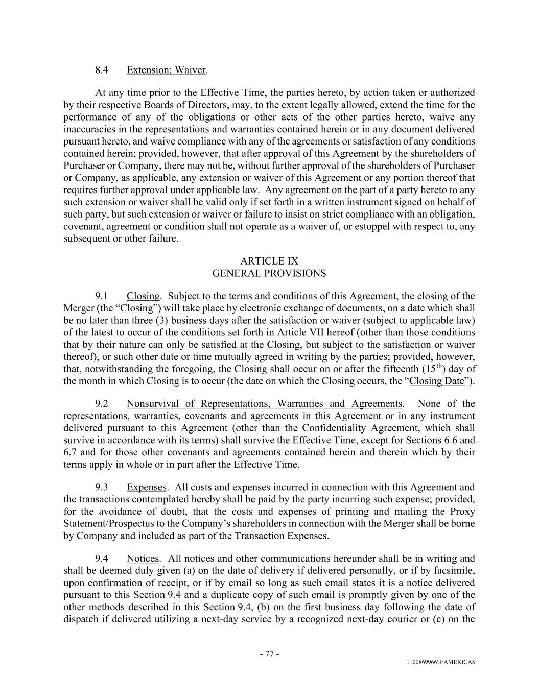 - 77 - 1100869966\1\AMERICAS 8.4 Extension; Waiver. At any time prior to the Effective Time, the parties hereto, by action taken or authorized by their respective Boards of Directors, may, to the extent legally allowed, extend the time for the performance of any of the obligations or other acts of the other parties hereto, waive any inaccuracies in the representations and warranties contained herein or in any document delivered pursuant hereto, and waive compliance with any of the agreements or satisfaction of any conditions contained herein; provided, however, that after approval of this Agreement by the shareholders of Purchaser or Company, there may not be, without further approval of the shareholders of Purchaser or Company, as applicable, any extension or waiver of this Agreement or any portion thereof that requires further approval under applicable law. Any agreement on the part of a party hereto to any such extension or waiver shall be valid only if set forth in a written instrument signed on behalf of such party, but such extension or waiver or failure to insist on strict compliance with an obligation, covenant, agreement or condition shall not operate as a waiver of, or estoppel with respect to, any subsequent or other failure. ARTICLE IX GENERAL PROVISIONS 9.1 Closing. Subject to the terms and conditions of this Agreement, the closing of the Merger (the “Closing”) will take place by electronic exchange of documents, on a date which shall be no later than three (3) business days after the satisfaction or waiver (subject to applicable law) of the latest to occur of the conditions set forth in Article VII hereof (other than those conditions that by their nature can only be satisfied at the Closing, but subject to the satisfaction or waiver thereof), or such other date or time mutually agreed in writing by the parties; provided, however, that, notwithstanding the foregoing, the Closing shall occur on or after the fifteenth (15th) day of the month in which Closing is to occur (the date on which the Closing occurs, the “Closing Date”). 9.2 Nonsurvival of Representations, Warranties and Agreements. None of the representations, warranties, covenants and agreements in this Agreement or in any instrument delivered pursuant to this Agreement (other than the Confidentiality Agreement, which shall survive in accordance with its terms) shall survive the Effective Time, except for Sections 6.6 and 6.7 and for those other covenants and agreements contained herein and therein which by their terms apply in whole or in part after the Effective Time. 9.3 Expenses. All costs and expenses incurred in connection with this Agreement and the transactions contemplated hereby shall be paid by the party incurring such expense; provided, for the avoidance of doubt, that the costs and expenses of printing and mailing the Proxy Statement/Prospectus to the Company’s shareholders in connection with the Merger shall be borne by Company and included as part of the Transaction Expenses. 9.4 Notices. All notices and other communications hereunder shall be in writing and shall be deemed duly given (a) on the date of delivery if delivered personally, or if by facsimile, upon confirmation of receipt, or if by email so long as such email states it is a notice delivered pursuant to this Section 9.4 and a duplicate copy of such email is promptly given by one of the other methods described in this Section 9.4, (b) on the first business day following the date of dispatch if delivered utilizing a next-day service by a recognized next-day courier or (c) on the