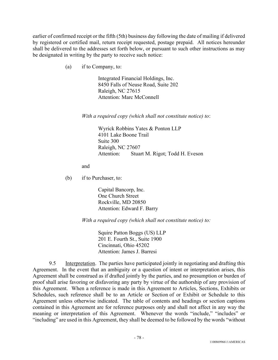 - 78 - 1100869966\1\AMERICAS earlier of confirmed receipt or the fifth (5th) business day following the date of mailing if delivered by registered or certified mail, return receipt requested, postage prepaid. All notices hereunder shall be delivered to the addresses set forth below, or pursuant to such other instructions as may be designated in writing by the party to receive such notice: (a) if to Company, to: Integrated Financial Holdings, Inc. 8450 Falls of Neuse Road, Suite 202 Raleigh, NC 27615 Attention: Marc McConnell With a required copy (which shall not constitute notice) to: Wyrick Robbins Yates & Ponton LLP 4101 Lake Boone Trail Suite 300 Raleigh, NC 27607 Attention: Stuart M. Rigot; Todd H. Eveson and (b) if to Purchaser, to: Capital Bancorp, Inc. One Church Street Rockville, MD 20850 Attention: Edward F. Barry With a required copy (which shall not constitute notice) to: Squire Patton Boggs (US) LLP 201 E. Fourth St., Suite 1900 Cincinnati, Ohio 45202 Attention: James J. Barresi 9.5 Interpretation. The parties have participated jointly in negotiating and drafting this Agreement. In the event that an ambiguity or a question of intent or interpretation arises, this Agreement shall be construed as if drafted jointly by the parties, and no presumption or burden of proof shall arise favoring or disfavoring any party by virtue of the authorship of any provision of this Agreement. When a reference is made in this Agreement to Articles, Sections, Exhibits or Schedules, such reference shall be to an Article or Section of or Exhibit or Schedule to this Agreement unless otherwise indicated. The table of contents and headings or section captions contained in this Agreement are for reference purposes only and shall not affect in any way the meaning or interpretation of this Agreement. Whenever the words “include,” “includes” or “including” are used in this Agreement, they shall be deemed to be followed by the words “without