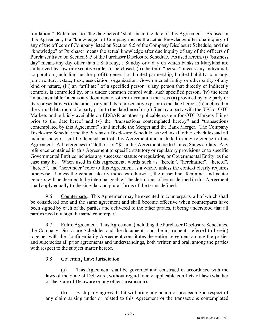 - 79 - 1100869966\1\AMERICAS limitation.” References to “the date hereof” shall mean the date of this Agreement. As used in this Agreement, the “knowledge” of Company means the actual knowledge after due inquiry of any of the officers of Company listed on Section 9.5 of the Company Disclosure Schedule, and the “knowledge” of Purchaser means the actual knowledge after due inquiry of any of the officers of Purchaser listed on Section 9.5 of the Purchaser Disclosure Schedule. As used herein, (i) “business day” means any day other than a Saturday, a Sunday or a day on which banks in Maryland are authorized by law or executive order to be closed, (ii) the term “person” means any individual, corporation (including not-for-profit), general or limited partnership, limited liability company, joint venture, estate, trust, association, organization, Governmental Entity or other entity of any kind or nature, (iii) an “affiliate” of a specified person is any person that directly or indirectly controls, is controlled by, or is under common control with, such specified person, (iv) the term “made available” means any document or other information that was (a) provided by one party or its representatives to the other party and its representatives prior to the date hereof, (b) included in the virtual data room of a party prior to the date hereof or (c) filed by a party with the SEC or OTC Markets and publicly available on EDGAR or other applicable system for OTC Markets filings prior to the date hereof and (v) the “transactions contemplated hereby” and “transactions contemplated by this Agreement” shall include the Merger and the Bank Merger. The Company Disclosure Schedule and the Purchaser Disclosure Schedule, as well as all other schedules and all exhibits hereto, shall be deemed part of this Agreement and included in any reference to this Agreement. All references to “dollars” or “$” in this Agreement are to United States dollars. Any reference contained in this Agreement to specific statutory or regulatory provisions or to specific Governmental Entities includes any successor statute or regulation, or Governmental Entity, as the case may be. When used in this Agreement, words such as “herein”, “hereinafter”, “hereof”, “hereto”, and “hereunder” refer to this Agreement as a whole, unless the context clearly requires otherwise. Unless the context clearly indicates otherwise, the masculine, feminine, and neuter genders will be deemed to be interchangeable. The definitions of terms defined in this Agreement shall apply equally to the singular and plural forms of the terms defined. 9.6 Counterparts. This Agreement may be executed in counterparts, all of which shall be considered one and the same agreement and shall become effective when counterparts have been signed by each of the parties and delivered to the other parties, it being understood that all parties need not sign the same counterpart. 9.7 Entire Agreement. This Agreement (including the Purchaser Disclosure Schedules, the Company Disclosure Schedules and the documents and the instruments referred to herein) together with the Confidentiality Agreement constitutes the entire agreement among the parties and supersedes all prior agreements and understandings, both written and oral, among the parties with respect to the subject matter hereof. 9.8 Governing Law; Jurisdiction. (a) This Agreement shall be governed and construed in accordance with the laws of the State of Delaware, without regard to any applicable conflicts of law (whether of the State of Delaware or any other jurisdiction). (b) Each party agrees that it will bring any action or proceeding in respect of any claim arising under or related to this Agreement or the transactions contemplated