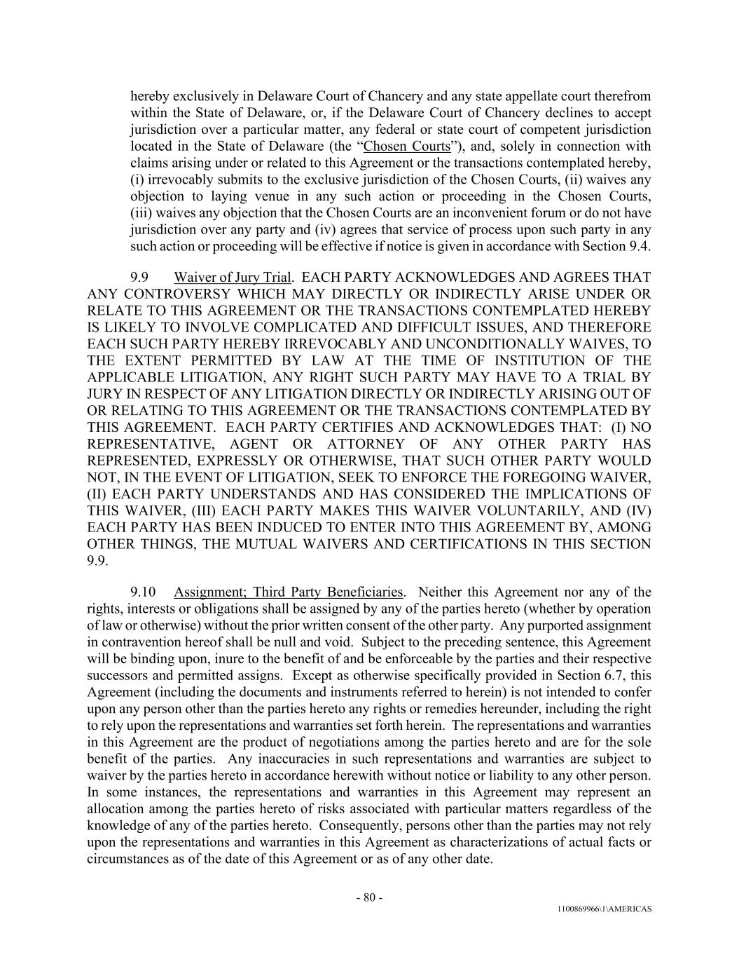 - 80 - 1100869966\1\AMERICAS hereby exclusively in Delaware Court of Chancery and any state appellate court therefrom within the State of Delaware, or, if the Delaware Court of Chancery declines to accept jurisdiction over a particular matter, any federal or state court of competent jurisdiction located in the State of Delaware (the “Chosen Courts”), and, solely in connection with claims arising under or related to this Agreement or the transactions contemplated hereby, (i) irrevocably submits to the exclusive jurisdiction of the Chosen Courts, (ii) waives any objection to laying venue in any such action or proceeding in the Chosen Courts, (iii) waives any objection that the Chosen Courts are an inconvenient forum or do not have jurisdiction over any party and (iv) agrees that service of process upon such party in any such action or proceeding will be effective if notice is given in accordance with Section 9.4. 9.9 Waiver of Jury Trial. EACH PARTY ACKNOWLEDGES AND AGREES THAT ANY CONTROVERSY WHICH MAY DIRECTLY OR INDIRECTLY ARISE UNDER OR RELATE TO THIS AGREEMENT OR THE TRANSACTIONS CONTEMPLATED HEREBY IS LIKELY TO INVOLVE COMPLICATED AND DIFFICULT ISSUES, AND THEREFORE EACH SUCH PARTY HEREBY IRREVOCABLY AND UNCONDITIONALLY WAIVES, TO THE EXTENT PERMITTED BY LAW AT THE TIME OF INSTITUTION OF THE APPLICABLE LITIGATION, ANY RIGHT SUCH PARTY MAY HAVE TO A TRIAL BY JURY IN RESPECT OF ANY LITIGATION DIRECTLY OR INDIRECTLY ARISING OUT OF OR RELATING TO THIS AGREEMENT OR THE TRANSACTIONS CONTEMPLATED BY THIS AGREEMENT. EACH PARTY CERTIFIES AND ACKNOWLEDGES THAT: (I) NO REPRESENTATIVE, AGENT OR ATTORNEY OF ANY OTHER PARTY HAS REPRESENTED, EXPRESSLY OR OTHERWISE, THAT SUCH OTHER PARTY WOULD NOT, IN THE EVENT OF LITIGATION, SEEK TO ENFORCE THE FOREGOING WAIVER, (II) EACH PARTY UNDERSTANDS AND HAS CONSIDERED THE IMPLICATIONS OF THIS WAIVER, (III) EACH PARTY MAKES THIS WAIVER VOLUNTARILY, AND (IV) EACH PARTY HAS BEEN INDUCED TO ENTER INTO THIS AGREEMENT BY, AMONG OTHER THINGS, THE MUTUAL WAIVERS AND CERTIFICATIONS IN THIS SECTION 9.9. 9.10 Assignment; Third Party Beneficiaries. Neither this Agreement nor any of the rights, interests or obligations shall be assigned by any of the parties hereto (whether by operation of law or otherwise) without the prior written consent of the other party. Any purported assignment in contravention hereof shall be null and void. Subject to the preceding sentence, this Agreement will be binding upon, inure to the benefit of and be enforceable by the parties and their respective successors and permitted assigns. Except as otherwise specifically provided in Section 6.7, this Agreement (including the documents and instruments referred to herein) is not intended to confer upon any person other than the parties hereto any rights or remedies hereunder, including the right to rely upon the representations and warranties set forth herein. The representations and warranties in this Agreement are the product of negotiations among the parties hereto and are for the sole benefit of the parties. Any inaccuracies in such representations and warranties are subject to waiver by the parties hereto in accordance herewith without notice or liability to any other person. In some instances, the representations and warranties in this Agreement may represent an allocation among the parties hereto of risks associated with particular matters regardless of the knowledge of any of the parties hereto. Consequently, persons other than the parties may not rely upon the representations and warranties in this Agreement as characterizations of actual facts or circumstances as of the date of this Agreement or as of any other date.