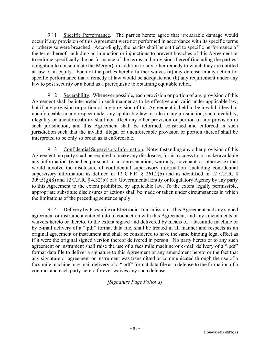 - 81 - 1100869966\1\AMERICAS 9.11 Specific Performance. The parties hereto agree that irreparable damage would occur if any provision of this Agreement were not performed in accordance with its specific terms or otherwise were breached. Accordingly, the parties shall be entitled to specific performance of the terms hereof, including an injunction or injunctions to prevent breaches of this Agreement or to enforce specifically the performance of the terms and provisions hereof (including the parties’ obligation to consummate the Merger), in addition to any other remedy to which they are entitled at law or in equity. Each of the parties hereby further waives (a) any defense in any action for specific performance that a remedy at law would be adequate and (b) any requirement under any law to post security or a bond as a prerequisite to obtaining equitable relief. 9.12 Severability. Whenever possible, each provision or portion of any provision of this Agreement shall be interpreted in such manner as to be effective and valid under applicable law, but if any provision or portion of any provision of this Agreement is held to be invalid, illegal or unenforceable in any respect under any applicable law or rule in any jurisdiction, such invalidity, illegality or unenforceability shall not affect any other provision or portion of any provision in such jurisdiction, and this Agreement shall be reformed, construed and enforced in such jurisdiction such that the invalid, illegal or unenforceable provision or portion thereof shall be interpreted to be only so broad as is enforceable. 9.13 Confidential Supervisory Information. Notwithstanding any other provision of this Agreement, no party shall be required to make any disclosure, furnish access to, or make available any information (whether pursuant to a representation, warranty, covenant or otherwise) that would involve the disclosure of confidential supervisory information (including confidential supervisory information as defined in 12 C.F.R. § 261.2(b) and as identified in 12 C.F.R. § 309.5(g)(8) and 12 C.F.R. § 4.32(b)) of a Governmental Entity or Regulatory Agency by any party to this Agreement to the extent prohibited by applicable law. To the extent legally permissible, appropriate substitute disclosures or actions shall be made or taken under circumstances in which the limitations of the preceding sentence apply. 9.14 Delivery by Facsimile or Electronic Transmission. This Agreement and any signed agreement or instrument entered into in connection with this Agreement, and any amendments or waivers hereto or thereto, to the extent signed and delivered by means of a facsimile machine or by e-mail delivery of a “.pdf” format data file, shall be treated in all manner and respects as an original agreement or instrument and shall be considered to have the same binding legal effect as if it were the original signed version thereof delivered in person. No party hereto or to any such agreement or instrument shall raise the use of a facsimile machine or e-mail delivery of a “.pdf” format data file to deliver a signature to this Agreement or any amendment hereto or the fact that any signature or agreement or instrument was transmitted or communicated through the use of a facsimile machine or e-mail delivery of a “.pdf” format data file as a defense to the formation of a contract and each party hereto forever waives any such defense. [Signature Page Follows]