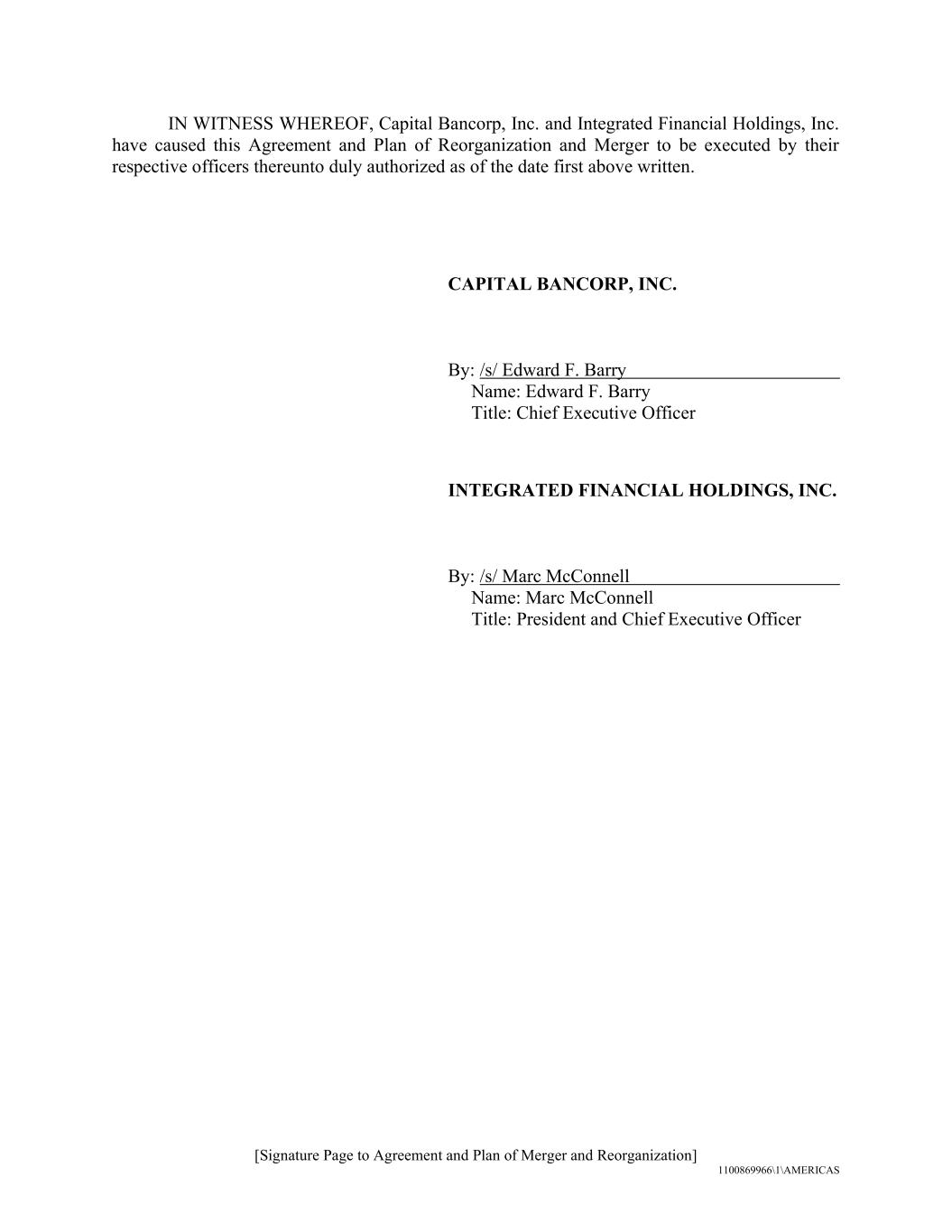 [Signature Page to Agreement and Plan of Merger and Reorganization] 1100869966\1\AMERICAS IN WITNESS WHEREOF, Capital Bancorp, Inc. and Integrated Financial Holdings, Inc. have caused this Agreement and Plan of Reorganization and Merger to be executed by their respective officers thereunto duly authorized as of the date first above written. CAPITAL BANCORP, INC. By: /s/ Edward F. Barry Name: Edward F. Barry Title: Chief Executive Officer INTEGRATED FINANCIAL HOLDINGS, INC. By: /s/ Marc McConnell Name: Marc McConnell Title: President and Chief Executive Officer