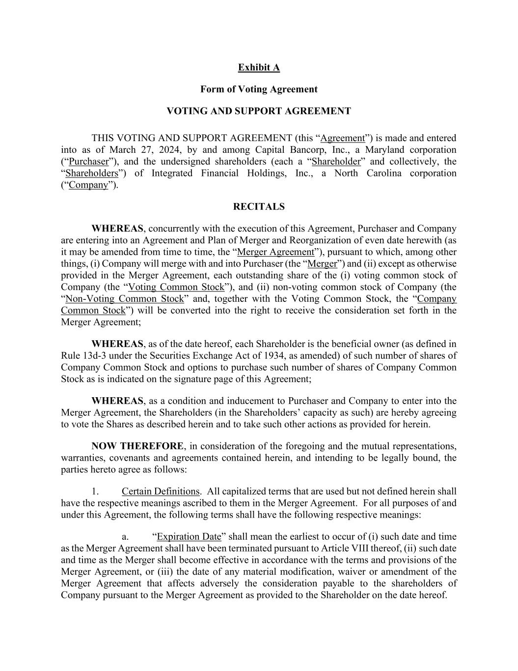 Exhibit A Form of Voting Agreement VOTING AND SUPPORT AGREEMENT THIS VOTING AND SUPPORT AGREEMENT (this “Agreement”) is made and entered into as of March 27, 2024, by and among Capital Bancorp, Inc., a Maryland corporation (“Purchaser”), and the undersigned shareholders (each a “Shareholder” and collectively, the “Shareholders”) of Integrated Financial Holdings, Inc., a North Carolina corporation (“Company”). RECITALS WHEREAS, concurrently with the execution of this Agreement, Purchaser and Company are entering into an Agreement and Plan of Merger and Reorganization of even date herewith (as it may be amended from time to time, the “Merger Agreement”), pursuant to which, among other things, (i) Company will merge with and into Purchaser (the “Merger”) and (ii) except as otherwise provided in the Merger Agreement, each outstanding share of the (i) voting common stock of Company (the “Voting Common Stock”), and (ii) non-voting common stock of Company (the “Non-Voting Common Stock” and, together with the Voting Common Stock, the “Company Common Stock”) will be converted into the right to receive the consideration set forth in the Merger Agreement; WHEREAS, as of the date hereof, each Shareholder is the beneficial owner (as defined in Rule 13d-3 under the Securities Exchange Act of 1934, as amended) of such number of shares of Company Common Stock and options to purchase such number of shares of Company Common Stock as is indicated on the signature page of this Agreement; WHEREAS, as a condition and inducement to Purchaser and Company to enter into the Merger Agreement, the Shareholders (in the Shareholders’ capacity as such) are hereby agreeing to vote the Shares as described herein and to take such other actions as provided for herein. NOW THEREFORE, in consideration of the foregoing and the mutual representations, warranties, covenants and agreements contained herein, and intending to be legally bound, the parties hereto agree as follows: 1. Certain Definitions. All capitalized terms that are used but not defined herein shall have the respective meanings ascribed to them in the Merger Agreement. For all purposes of and under this Agreement, the following terms shall have the following respective meanings: a. “Expiration Date” shall mean the earliest to occur of (i) such date and time as the Merger Agreement shall have been terminated pursuant to Article VIII thereof, (ii) such date and time as the Merger shall become effective in accordance with the terms and provisions of the Merger Agreement, or (iii) the date of any material modification, waiver or amendment of the Merger Agreement that affects adversely the consideration payable to the shareholders of Company pursuant to the Merger Agreement as provided to the Shareholder on the date hereof.