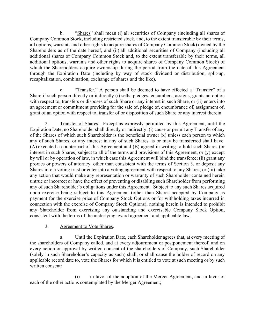 b. “Shares” shall mean (i) all securities of Company (including all shares of Company Common Stock, including restricted stock, and, to the extent transferable by their terms, all options, warrants and other rights to acquire shares of Company Common Stock) owned by the Shareholders as of the date hereof, and (ii) all additional securities of Company (including all additional shares of Company Common Stock and, to the extent transferable by their terms, all additional options, warrants and other rights to acquire shares of Company Common Stock) of which the Shareholders acquire ownership during the period from the date of this Agreement through the Expiration Date (including by way of stock dividend or distribution, split-up, recapitalization, combination, exchange of shares and the like). c. “Transfer.” A person shall be deemed to have effected a “Transfer” of a Share if such person directly or indirectly (i) sells, pledges, encumbers, assigns, grants an option with respect to, transfers or disposes of such Share or any interest in such Share, or (ii) enters into an agreement or commitment providing for the sale of, pledge of, encumbrance of, assignment of, grant of an option with respect to, transfer of or disposition of such Share or any interest therein. 2. Transfer of Shares. Except as expressly permitted by this Agreement, until the Expiration Date, no Shareholder shall directly or indirectly: (i) cause or permit any Transfer of any of the Shares of which such Shareholder is the beneficial owner (x) unless each person to which any of such Shares, or any interest in any of such Shares, is or may be transferred shall have: (A) executed a counterpart of this Agreement and (B) agreed in writing to hold such Shares (or interest in such Shares) subject to all of the terms and provisions of this Agreement, or (y) except by will or by operation of law, in which case this Agreement will bind the transferee; (ii) grant any proxies or powers of attorney, other than consistent with the terms of Section 3, or deposit any Shares into a voting trust or enter into a voting agreement with respect to any Shares; or (iii) take any action that would make any representation or warranty of such Shareholder contained herein untrue or incorrect or have the effect of preventing or disabling such Shareholder from performing any of such Shareholder’s obligations under this Agreement. Subject to any such Shares acquired upon exercise being subject to this Agreement (other than Shares accepted by Company as payment for the exercise price of Company Stock Options or for withholding taxes incurred in connection with the exercise of Company Stock Options), nothing herein is intended to prohibit any Shareholder from exercising any outstanding and exercisable Company Stock Option, consistent with the terms of the underlying award agreement and applicable law. 3. Agreement to Vote Shares. a. Until the Expiration Date, each Shareholder agrees that, at every meeting of the shareholders of Company called, and at every adjournment or postponement thereof, and on every action or approval by written consent of the shareholders of Company, such Shareholder (solely in such Shareholder’s capacity as such) shall, or shall cause the holder of record on any applicable record date to, vote the Shares for which it is entitled to vote at such meeting or by such written consent: (i) in favor of the adoption of the Merger Agreement, and in favor of each of the other actions contemplated by the Merger Agreement;