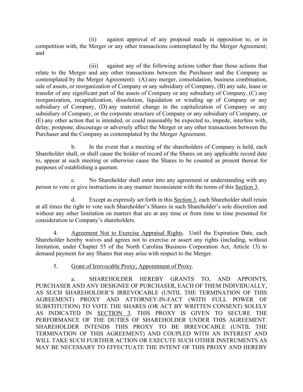 (ii) against approval of any proposal made in opposition to, or in competition with, the Merger or any other transactions contemplated by the Merger Agreement; and (iii) against any of the following actions (other than those actions that relate to the Merger and any other transactions between the Purchaser and the Company as contemplated by the Merger Agreement): (A) any merger, consolidation, business combination, sale of assets, or reorganization of Company or any subsidiary of Company, (B) any sale, lease or transfer of any significant part of the assets of Company or any subsidiary of Company, (C) any reorganization, recapitalization, dissolution, liquidation or winding up of Company or any subsidiary of Company, (D) any material change in the capitalization of Company or any subsidiary of Company, or the corporate structure of Company or any subsidiary of Company, or (E) any other action that is intended, or could reasonably be expected to, impede, interfere with, delay, postpone, discourage or adversely affect the Merger or any other transactions between the Purchaser and the Company as contemplated by the Merger Agreement. b. In the event that a meeting of the shareholders of Company is held, each Shareholder shall, or shall cause the holder of record of the Shares on any applicable record date to, appear at such meeting or otherwise cause the Shares to be counted as present thereat for purposes of establishing a quorum. c. No Shareholder shall enter into any agreement or understanding with any person to vote or give instructions in any manner inconsistent with the terms of this Section 3. d. Except as expressly set forth in this Section 3, each Shareholder shall retain at all times the right to vote such Shareholder’s Shares in such Shareholder’s sole discretion and without any other limitation on matters that are at any time or from time to time presented for consideration to Company’s shareholders. 4. Agreement Not to Exercise Appraisal Rights. Until the Expiration Date, each Shareholder hereby waives and agrees not to exercise or assert any rights (including, without limitation, under Chapter 55 of the North Carolina Business Corporation Act, Article 13) to demand payment for any Shares that may arise with respect to the Merger. 5. Grant of Irrevocable Proxy; Appointment of Proxy. a. SHAREHOLDER HEREBY GRANTS TO, AND APPOINTS, PURCHASER AND ANY DESIGNEE OF PURCHASER, EACH OF THEM INDIVIDUALLY, AS SUCH SHAREHOLDER’S IRREVOCABLE (UNTIL THE TERMINATION OF THIS AGREEMENT) PROXY AND ATTORNEY-IN-FACT (WITH FULL POWER OF SUBSTITUTION) TO VOTE THE SHARES (OR ACT BY WRITTEN CONSENT) SOLELY AS INDICATED IN SECTION 3. THIS PROXY IS GIVEN TO SECURE THE PERFORMANCE OF THE DUTIES OF SHAREHOLDER UNDER THIS AGREEMENT. SHAREHOLDER INTENDS THIS PROXY TO BE IRREVOCABLE (UNTIL THE TERMINATION OF THIS AGREEMENT) AND COUPLED WITH AN INTEREST AND WILL TAKE SUCH FURTHER ACTION OR EXECUTE SUCH OTHER INSTRUMENTS AS MAY BE NECESSARY TO EFFECTUATE THE INTENT OF THIS PROXY AND HEREBY