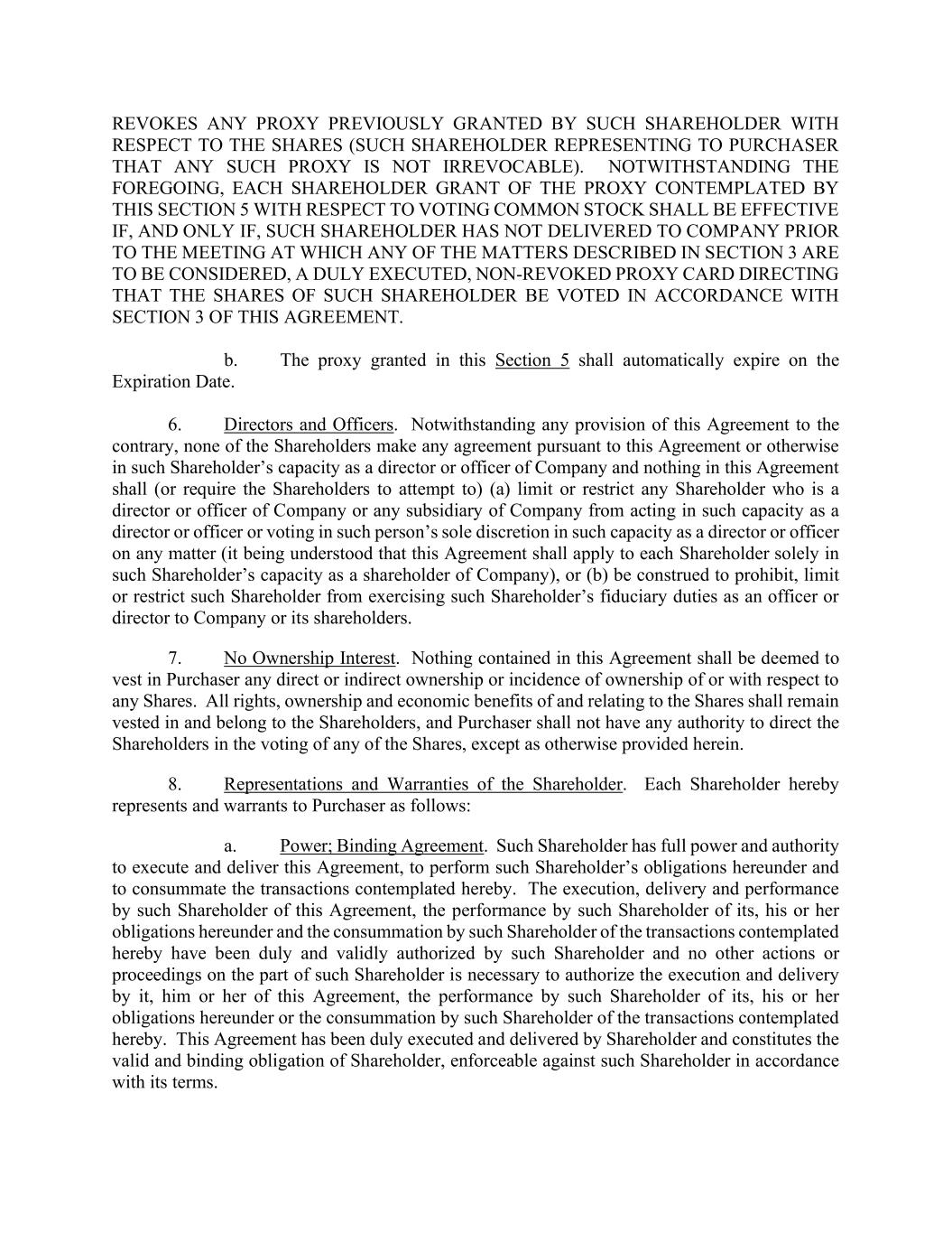 REVOKES ANY PROXY PREVIOUSLY GRANTED BY SUCH SHAREHOLDER WITH RESPECT TO THE SHARES (SUCH SHAREHOLDER REPRESENTING TO PURCHASER THAT ANY SUCH PROXY IS NOT IRREVOCABLE). NOTWITHSTANDING THE FOREGOING, EACH SHAREHOLDER GRANT OF THE PROXY CONTEMPLATED BY THIS SECTION 5 WITH RESPECT TO VOTING COMMON STOCK SHALL BE EFFECTIVE IF, AND ONLY IF, SUCH SHAREHOLDER HAS NOT DELIVERED TO COMPANY PRIOR TO THE MEETING AT WHICH ANY OF THE MATTERS DESCRIBED IN SECTION 3 ARE TO BE CONSIDERED, A DULY EXECUTED, NON-REVOKED PROXY CARD DIRECTING THAT THE SHARES OF SUCH SHAREHOLDER BE VOTED IN ACCORDANCE WITH SECTION 3 OF THIS AGREEMENT. b. The proxy granted in this Section 5 shall automatically expire on the Expiration Date. 6. Directors and Officers. Notwithstanding any provision of this Agreement to the contrary, none of the Shareholders make any agreement pursuant to this Agreement or otherwise in such Shareholder’s capacity as a director or officer of Company and nothing in this Agreement shall (or require the Shareholders to attempt to) (a) limit or restrict any Shareholder who is a director or officer of Company or any subsidiary of Company from acting in such capacity as a director or officer or voting in such person’s sole discretion in such capacity as a director or officer on any matter (it being understood that this Agreement shall apply to each Shareholder solely in such Shareholder’s capacity as a shareholder of Company), or (b) be construed to prohibit, limit or restrict such Shareholder from exercising such Shareholder’s fiduciary duties as an officer or director to Company or its shareholders. 7. No Ownership Interest. Nothing contained in this Agreement shall be deemed to vest in Purchaser any direct or indirect ownership or incidence of ownership of or with respect to any Shares. All rights, ownership and economic benefits of and relating to the Shares shall remain vested in and belong to the Shareholders, and Purchaser shall not have any authority to direct the Shareholders in the voting of any of the Shares, except as otherwise provided herein. 8. Representations and Warranties of the Shareholder. Each Shareholder hereby represents and warrants to Purchaser as follows: a. Power; Binding Agreement. Such Shareholder has full power and authority to execute and deliver this Agreement, to perform such Shareholder’s obligations hereunder and to consummate the transactions contemplated hereby. The execution, delivery and performance by such Shareholder of this Agreement, the performance by such Shareholder of its, his or her obligations hereunder and the consummation by such Shareholder of the transactions contemplated hereby have been duly and validly authorized by such Shareholder and no other actions or proceedings on the part of such Shareholder is necessary to authorize the execution and delivery by it, him or her of this Agreement, the performance by such Shareholder of its, his or her obligations hereunder or the consummation by such Shareholder of the transactions contemplated hereby. This Agreement has been duly executed and delivered by Shareholder and constitutes the valid and binding obligation of Shareholder, enforceable against such Shareholder in accordance with its terms.