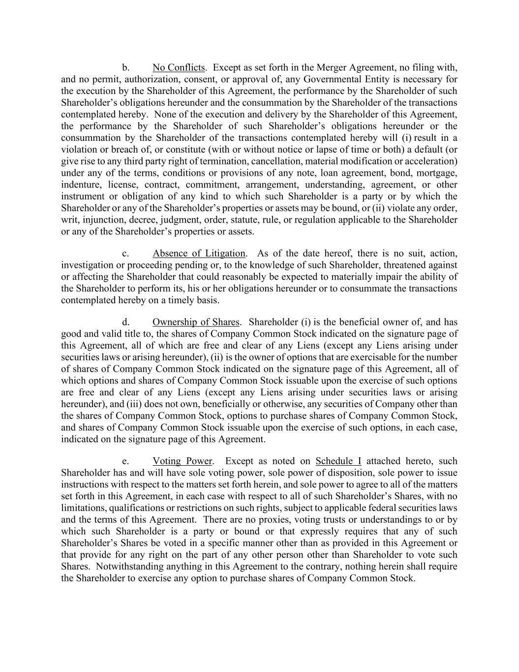 b. No Conflicts. Except as set forth in the Merger Agreement, no filing with, and no permit, authorization, consent, or approval of, any Governmental Entity is necessary for the execution by the Shareholder of this Agreement, the performance by the Shareholder of such Shareholder’s obligations hereunder and the consummation by the Shareholder of the transactions contemplated hereby. None of the execution and delivery by the Shareholder of this Agreement, the performance by the Shareholder of such Shareholder’s obligations hereunder or the consummation by the Shareholder of the transactions contemplated hereby will (i) result in a violation or breach of, or constitute (with or without notice or lapse of time or both) a default (or give rise to any third party right of termination, cancellation, material modification or acceleration) under any of the terms, conditions or provisions of any note, loan agreement, bond, mortgage, indenture, license, contract, commitment, arrangement, understanding, agreement, or other instrument or obligation of any kind to which such Shareholder is a party or by which the Shareholder or any of the Shareholder’s properties or assets may be bound, or (ii) violate any order, writ, injunction, decree, judgment, order, statute, rule, or regulation applicable to the Shareholder or any of the Shareholder’s properties or assets. c. Absence of Litigation. As of the date hereof, there is no suit, action, investigation or proceeding pending or, to the knowledge of such Shareholder, threatened against or affecting the Shareholder that could reasonably be expected to materially impair the ability of the Shareholder to perform its, his or her obligations hereunder or to consummate the transactions contemplated hereby on a timely basis. d. Ownership of Shares. Shareholder (i) is the beneficial owner of, and has good and valid title to, the shares of Company Common Stock indicated on the signature page of this Agreement, all of which are free and clear of any Liens (except any Liens arising under securities laws or arising hereunder), (ii) is the owner of options that are exercisable for the number of shares of Company Common Stock indicated on the signature page of this Agreement, all of which options and shares of Company Common Stock issuable upon the exercise of such options are free and clear of any Liens (except any Liens arising under securities laws or arising hereunder), and (iii) does not own, beneficially or otherwise, any securities of Company other than the shares of Company Common Stock, options to purchase shares of Company Common Stock, and shares of Company Common Stock issuable upon the exercise of such options, in each case, indicated on the signature page of this Agreement. e. Voting Power. Except as noted on Schedule I attached hereto, such Shareholder has and will have sole voting power, sole power of disposition, sole power to issue instructions with respect to the matters set forth herein, and sole power to agree to all of the matters set forth in this Agreement, in each case with respect to all of such Shareholder’s Shares, with no limitations, qualifications or restrictions on such rights, subject to applicable federal securities laws and the terms of this Agreement. There are no proxies, voting trusts or understandings to or by which such Shareholder is a party or bound or that expressly requires that any of such Shareholder’s Shares be voted in a specific manner other than as provided in this Agreement or that provide for any right on the part of any other person other than Shareholder to vote such Shares. Notwithstanding anything in this Agreement to the contrary, nothing herein shall require the Shareholder to exercise any option to purchase shares of Company Common Stock.