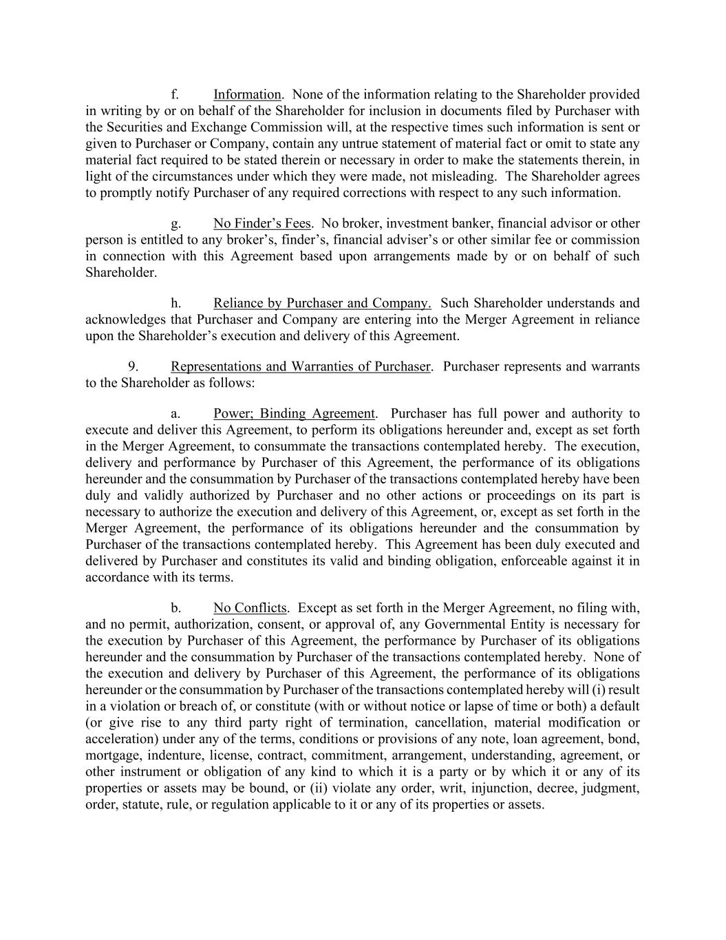 f. Information. None of the information relating to the Shareholder provided in writing by or on behalf of the Shareholder for inclusion in documents filed by Purchaser with the Securities and Exchange Commission will, at the respective times such information is sent or given to Purchaser or Company, contain any untrue statement of material fact or omit to state any material fact required to be stated therein or necessary in order to make the statements therein, in light of the circumstances under which they were made, not misleading. The Shareholder agrees to promptly notify Purchaser of any required corrections with respect to any such information. g. No Finder’s Fees. No broker, investment banker, financial advisor or other person is entitled to any broker’s, finder’s, financial adviser’s or other similar fee or commission in connection with this Agreement based upon arrangements made by or on behalf of such Shareholder. h. Reliance by Purchaser and Company. Such Shareholder understands and acknowledges that Purchaser and Company are entering into the Merger Agreement in reliance upon the Shareholder’s execution and delivery of this Agreement. 9. Representations and Warranties of Purchaser. Purchaser represents and warrants to the Shareholder as follows: a. Power; Binding Agreement. Purchaser has full power and authority to execute and deliver this Agreement, to perform its obligations hereunder and, except as set forth in the Merger Agreement, to consummate the transactions contemplated hereby. The execution, delivery and performance by Purchaser of this Agreement, the performance of its obligations hereunder and the consummation by Purchaser of the transactions contemplated hereby have been duly and validly authorized by Purchaser and no other actions or proceedings on its part is necessary to authorize the execution and delivery of this Agreement, or, except as set forth in the Merger Agreement, the performance of its obligations hereunder and the consummation by Purchaser of the transactions contemplated hereby. This Agreement has been duly executed and delivered by Purchaser and constitutes its valid and binding obligation, enforceable against it in accordance with its terms. b. No Conflicts. Except as set forth in the Merger Agreement, no filing with, and no permit, authorization, consent, or approval of, any Governmental Entity is necessary for the execution by Purchaser of this Agreement, the performance by Purchaser of its obligations hereunder and the consummation by Purchaser of the transactions contemplated hereby. None of the execution and delivery by Purchaser of this Agreement, the performance of its obligations hereunder or the consummation by Purchaser of the transactions contemplated hereby will (i) result in a violation or breach of, or constitute (with or without notice or lapse of time or both) a default (or give rise to any third party right of termination, cancellation, material modification or acceleration) under any of the terms, conditions or provisions of any note, loan agreement, bond, mortgage, indenture, license, contract, commitment, arrangement, understanding, agreement, or other instrument or obligation of any kind to which it is a party or by which it or any of its properties or assets may be bound, or (ii) violate any order, writ, injunction, decree, judgment, order, statute, rule, or regulation applicable to it or any of its properties or assets.